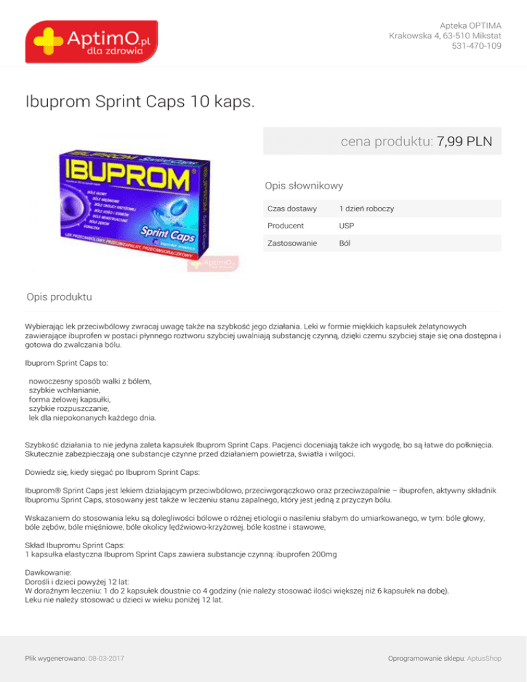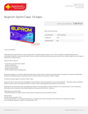 Apteka OPTIMA Krakowska 4, 63-510 Mikstat 531-470-109 Ibuprom Sprint Caps 10 kaps. cena produktu: 7,99 PLN Opis słownikowy Czas dostawy 1 dzień roboczy Producent USP Zastosowanie Ból Opis produktu Wybierając lek przeciwbólowy zwracaj uwagę także na szybkość jego działania. Leki w formie miękkich kapsułek żelatynowych zawierające ibuprofen w postaci płynnego roztworu szybciej uwalniają substancję czynną, dzięki czemu szybciej staje się ona dostępna i gotowa do zwalczania bólu. Ibuprom Sprint Caps to: nowoczesny sposób walki z bólem, szybkie wchłanianie, forma żelowej kapsułki, szybkie rozpuszczanie, lek dla niepokonanych każdego dnia. Szybkość działania to nie jedyna zaleta kapsułek Ibuprom Sprint Caps. Pacjenci doceniają także ich wygodę, bo są łatwe do połknięcia. Skutecznie zabezpieczają one substancje czynne przed działaniem powietrza, światła i wilgoci. Dowiedz się, kiedy sięgać po Ibuprom Sprint Caps: Ibuprom® Sprint Caps jest lekiem działającym przeciwbólowo, przeciwgorączkowo oraz przeciwzapalnie – ibuprofen, aktywny składnik Ibupromu Sprint Caps, stosowany jest także w leczeniu stanu zapalnego, który jest jedną z przyczyn bólu. Wskazaniem do stosowania leku są dolegliwości bólowe o różnej etiologii o nasileniu słabym do umiarkowanego, w tym: bóle głowy, bóle zębów, bóle mięśniowe, bóle okolicy lędźwiowo-krzyżowej, bóle kostne i stawowe, Skład Ibupromu Sprint Caps: 1 kapsułka elastyczna Ibuprom Sprint Caps zawiera substancje czynną: ibuprofen 200mg Dawkowanie: Dorośli i dzieci powyżej 12 lat: W doraźnym leczeniu: 1 do 2 kapsułek doustnie co 4 godziny (nie należy stosować ilości większej niż 6 kapsułek na dobę). Leku nie należy stosować u dzieci w wieku poniżej 12 lat. Plik wygenerowano: 08-03-2017 Oprogramowanie sklepu: AptusShop Apteka OPTIMA Krakowska 4, 63-510 Mikstat 531-470-109 Nie należy zwiększać zalecanej dawki. Plik wygenerowano: 08-03-2017 Powered by TCPDF (www.tcpdf.org) Oprogramowanie sklepu: AptusShop