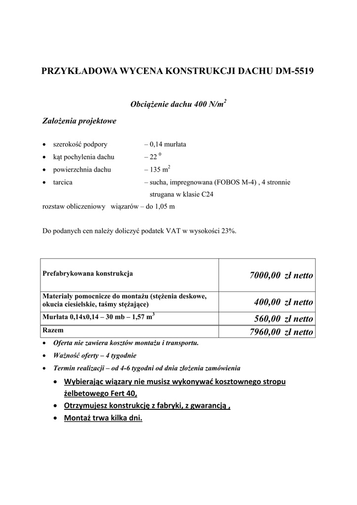 PRZYKŁADOWA WYCENA KONSTRUKCJI DACHU DM-5519 Obciążenie dachu 400 N/m2 Założenia projektowe szerokość podpory – 0,14 murłata kąt pochylenia dachu – 22 0 powierzchnia dachu – 135 m2 tarcica – sucha, impregnowana (FOBOS M-4) , 4 stronnie strugana w klasie C24 rozstaw obliczeniowy wiązarów – do 1,05 m Do podanych cen należy doliczyć podatek VAT w wysokości 23%. Prefabrykowana konstrukcja Materiały pomocnicze do montażu (stężenia deskowe, okucia ciesielskie, taśmy stężające) Murłata 0,14x0,14 – 30 mb – 1,57 m3 Razem Oferta nie zawiera kosztów montażu i transportu. Ważność oferty – 4 tygodnie Termin realizacji – od 4-6 tygodni od dnia złożenia zamówienia 7000,00 zł netto 400,00 zł netto 560,00 zł netto 7960,00 zł netto Wybierając wiązary nie musisz wykonywać kosztownego stropu żelbetowego Fert 40, Otrzymujesz konstrukcję z fabryki, z gwarancją , Montaż trwa kilka dni.