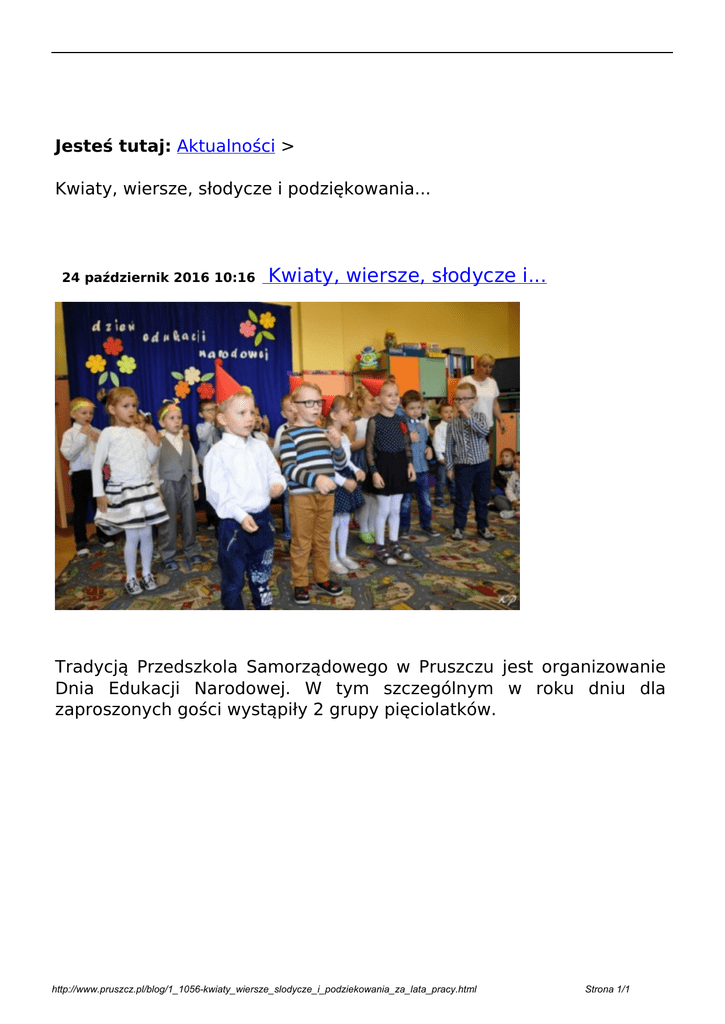 Jesteś tutaj: Aktualności > Kwiaty, wiersze, słodycze i podziękowania... 24 październik 2016 10:16 Kwiaty, wiersze, słodycze i... Tradycją Przedszkola Samorządowego w Pruszczu jest organizowanie Dnia Edukacji Narodowej. W tym szczególnym w roku dniu dla zaproszonych gości wystąpiły 2 grupy pięciolatków. http://www.pruszcz.pl/blog/1_1056-kwiaty_wiersze_slodycze_i_podziekowania_za_lata_pracy.html Powered by TCPDF (www.tcpdf.org) Strona 1/1