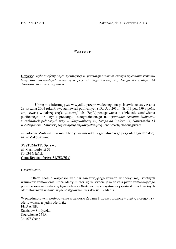BZP.271.47.2011 Zakopane, dnia 14 czerwca 2011r. Wszyscy Dotyczy: wyboru oferty najkorzystniejszej w przetargu nieograniczonym wykonanie remontu budynków mieszkalnych połoŜonych przy ul. Jagiellońskiej 42, Droga do Białego 14 ,Nowotarska 13 w Zakopanem. Uprzejmie informuję ,Ŝe w wyniku przeprowadzonego na podstawie ustawy z dnia 29 stycznia 2004 roku Prawo zamówień publicznych ( Dz.U. z 2010r. Nr 113 poz.759 z późn. zm, zwaną w dalszej części „ustawą” lub „Pzp”.) postępowania o udzielenie zamówienia publicznego w trybie przetargu nieograniczonego na wykonanie remontu budynków mieszkalnych połoŜonych przy ul. Jagiellońskiej 42, Droga do Białego 14, Nowotarska 13 w Zakopanem , Zamawiający za ofertę najkorzystniejszą uznał ofertę złoŜoną przez: -w zakresie Zadania I: remont budynku mieszkalnego połoŜonego przy ul. Jagiellońskiej 42 w Zakopanem: SYSTEMATIC Sp. z o.o. ul. Marii Ludwiki 33 80-034 Gdańsk Cena Brutto oferty: 51.759,75 zł Uzasadnienie; Oferta spełnia wszystkie warunki zamawiającego zawarte w specyfikacji istotnych warunków zamówienia. Cena oferty mieści się w kwocie jaka została przez zamawiającego przeznaczona na realizację tego zadania. Oferta jest najkorzystniejszą spośród trzech waŜnych ofert złoŜonych w niniejszym postępowaniu w zakresie I Zadania. W przedmiotowym postępowaniu w zakresie Zadania I zostały złoŜone 4 oferty, z czego trzy oferty waŜne, a jedna oferta tj.: FHU ANIK Stanisław Słodyczka Czerwienne 251A 34-407 Ciche , podlega odrzuceniu zgodnie z art.89.ust.1 pkt.7 ustawy prawo zamówień publicznych, poniewaŜ wykonawca nie wyraził zgody w wymaganym ustawą terminie na poprawienie omyłki polegającej na niezgodności oferty ze specyfikacja istotnych warunków zamówienia. W oparciu o kryterium wyboru oferty najkorzystniejszej-cena brutto-100%, oferty w Zadaniu I otrzymały następująca ilość punktów w skali 100 punktowej: Nr oferty 1 Cena brutto oferty Wykonawca/Firma Ilość punktów Firma Remontowo-Budowlana Kazimierz Zelek ul. Smrekowa 6 34-500 Zakopane Cena Brutto oferty: 68.371,12 zł 75,70 2 SYSTEMATIC Sp. z o.o. ul. Marii Ludwiki 33 80-034 Gdańsk Cena Brutto oferty: 51.759,75 zł 100 3 Usługi Budowlano-Malarskie JACH-BUD Jachymiak Paweł Al.1000- Lecia 36/39 34-400 Nowy Targ Cena Brutto oferty : 60.228,50 zł 85,93 Zgodnie z art. 94 ust.1 pkt.2 ustawy Pzp, uprzejmie informuję, Ŝe umowa z wykonawcą w zakresie Zadania I zostanie zawarta nie wcześniej niŜ 28 czerwca 2011r. W zakresie Zadania II: remont budynków mieszkalnych połoŜonych przy ul. Nowotarskiej 13, Droga do Białego 14 w Zakopanem w niniejszym postępowaniu zamawiający za najkorzystniejszą uznał ofertę złoŜona przez: Usługi Budowlano-Malarskie JACH-BUD Jachymiak Paweł Al.1000 Lecia 36/39 34-400 Nowy Targ Cena Brutto oferty: 29.448,10 zł Uzasadnienie; Oferta spełnia wszystkie warunki zamawiającego zawarte w specyfikacji istotnych warunków zamówienia. Cena oferty mieści się w kwocie jaka została przez zamawiającego przeznaczona na realizację tego zadania. Oferta jest najkorzystniejszą spośród czterech waŜnych ofert złoŜonych w niniejszym postępowaniu w zakresie II Zadania. W przedmiotowym postępowaniu w zakresie Zadania II zostały złoŜone 4 oferty, wszystkie waŜne. W oparciu o kryterium wyboru oferty najkorzystniejszej-cena brutto-100%, w zakresie Zadania II oferty otrzymały następująca ilość punktów w skali 100 punktowej: Nr oferty 1 Cena brutto oferty Wykonawca/Firma Ilość punktów Zakład Budowlano-Projektowy Transportu i Handlu Mikołaj Kot ul. Kościuszki 66 34-500 Zakopane Cena Brutto oferty: 45.951,80 zł 64,08 2 SYSTEMATIC Sp. z o.o. ul. Marii Ludwiki 33 80-034 Gdańsk Cena Brutto oferty: 54.303,71 zł 54,22 3 Usługi Budowlano-Malarskie JACH-BUD Jachymiak Paweł Al.1000 Lecia 36/39 34-400 Nowy Targ Cena Brutto oferty: 29.448,10 zł 100 4 FHU ANIK Stanisław Słodyczka Czerwienne 251A 34-407 Ciche Cena Brutto oferty: 30.418,27 zł 96,81 Zgodnie z art. 94 ust.1 pkt.2 ustawy Pzp, uprzejmie informuję, Ŝe umowa z wykonawcą w zakresie Zadania II zostanie zawarta nie wcześniej niŜ 21 czerwca 2011r. Naczelnik Wydziału Gospodarki Mieszkaniowej Urzędu Miasta Zakopane Michał Halaczek 14.06.2011r. Pouczenie W niniejszym postępowaniu Wykonawcy przysługują środki ochrony prawnej (Odwołanie, Skarga do Sądu) tylko wobec czynności: 1) wykluczenia wykonawcy z postępowania o udzielenie zamówienia; 2) odrzucenia oferty wykonawcy W pozostałych przypadkach odwołanie nie przysługuje. Informacje dotyczące środków ochrony prawnej znajdują się w Dziale VI Prawa zamówień publicznych.