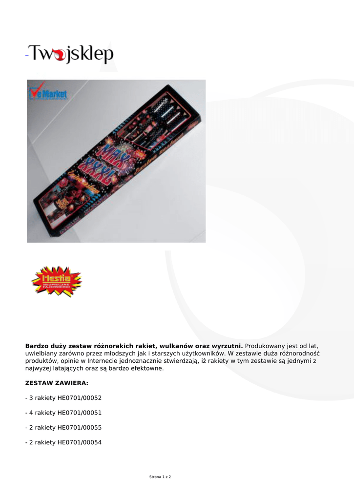 Bardzo duży zestaw różnorakich rakiet, wulkanów oraz wyrzutni. Produkowany jest od lat, uwielbiany zarówno przez młodszych jak i starszych użytkowników. W zestawie duża różnorodność produktów, opinie w Internecie jednoznacznie stwierdzają, iż rakiety w tym zestawie są jednymi z najwyżej latających oraz są bardzo efektowne. ZESTAW ZAWIERA: - 3 rakiety HE0701/00052 - 4 rakiety HE0701/00051 - 2 rakiety HE0701/00055 - 2 rakiety HE0701/00054 Strona 1 z 2 - 2 rakiety HE0701/00053 - 1 fontanna 0049 - 1 fontanna 0047 - 2 wyrzutnie HE0027 - 2 wyrzutnie HE0028 Przed użyciem produktu prosimy o przeczytanie instrukcji obsługi umieszczonej na opakowaniu bądź poszczególnych produktach. Fajerwerki warto odpalać bez pośpiechu, z należytą uwagą na kwestię bezpieczeństwa. Gwarantujemy, iż będą Państwo z tego zestawu bardzo zadowoleni! Strona 2 z 2