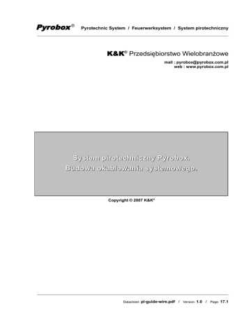 Pyrobox ® Pyrotechnic System / Feuerwerksystem / System pirotechniczny K&K® Przedsiębiorstwo Wielobranżowe mail : [email protected] web : www.pyrobox.com.pl System pirotechniczny Pyrobox. Budowa okablowania systemowego. Copyright © 2007 K&K® Datasheet: pl-guide-wire.pdf / Version: 1.0 / Page: 17.1 Pyrobox ® Pyrotechnic System / Feuerwerksystem / System pirotechniczny Spis treści. Część A. Zasady budowy okablowania systemu Pyrobox. 3 I. Istotne dla bezpieczeństwa zasady używania systemu Pyrobox II. Elementy okablowania systemu 1. kable połączeniowe – transmisyjne 2. kable połączeniowe – zespoły zapalcze 3. łączniki kabli 4. dekodery III. Budowa okablowania systemu 1. zasady budowy okablowania 2. dobór elementów okablowania 3. teoretyczne podstawy doboru elementów okablowania IV. Złącza systemowe 1. złącza typu XLR 2. złącza typu MIC 3. brak kontaktu w złączu 4 5 5 5 6 6 8 8 10 11 13 13 13 14 Część B. Dodatki i uzupełnienia. 15 I. Konserwacja sprzętu II. Recykling sprzętu 16 16 Notatki. 17 Datasheet: pl-guide-wire.pdf / Version: 1.0 / Page: 17.2 Pyrobox ® Pyrotechnic System / Feuerwerksystem / System pirotechniczny Część A. Zasady budowy okablowania systemu Pyrobox. Datasheet: pl-guide-wire.pdf / Version: 1.0 / Page: 17.3 Pyrobox ® Pyrotechnic System / Feuerwerksystem / System pirotechniczny I. Istotne dla bezpieczeństwa zasady używania systemu Pyrobox 1. System pirotechniczny Pyrobox (wszystkie jego podzespoły i elementy) przeznaczony jest wyłącznie do „odpalania” zapalników elektrycznych, a przez nie ładunków pirotechnicznych, w trakcie pokazów sztucznych ogni, w obrębie ich stref bezpieczeństwa. 2. System Pyrobox może być używany wyłącznie przez osoby posiadające uprawnienia pirotechnika widowiskowego oraz dobrze znające jego właściwości i zasady obsługi. 3. Przed rozpoczęciem pracy z systemem Pyrobox należy szczegółowo zapoznać się z zasadami używania wszystkich wykorzystywanych podzespołów i elementów systemu Pyrobox. 4. Nie należy udostępniać żadnych podzespołów i elementów systemu Pyrobox osobom, które nie posiadają stosownych kwalifikacji i uprawnień, oraz nie zostały zapoznane z zasadami ich używania. 5. Nie wolno używać elementów i podzespołów systemu Pyrobox, których wygląd zewnętrzny lub też sposób działanie rodzi podejrzenia co do ich sprawności technicznej. 6. Wszystkie podzespoły i elementy systemu Pyrobox muszą podlegać bieżącej konserwacji oraz okresowym (minimum raz w roku) przeglądom technicznym sprawdzającym ich istotne dla bezpieczeństwa parametry techniczne. 7. Bez stosownych kwalifikacji i uprawnień nie wolno ingerować w budowę ani zmieniać zasad działania żadnych podzespołów i elementów systemu Pyrobox. 8. Przeglądów oraz napraw podzespołów i elementów systemu Pyrobox może dokonywać wyłącznie autoryzowany serwis. 9. Procedurę testowania obwodów zapalczych można rozpocząć dopiero po zakończeniu wszystkich prac instalacyjnych w strefie pirotechnicznej oraz opuszczeniu jej przez wszystkie pracujące tam osoby. 10. Pulpity i moduły sterujące Pyrobox należy przełączać w tryb pracy ARM wyłącznie bezpośrednio przed rozpoczęciem realizacji pokazu sztucznych ogni. 11. Zaleca się nie korzystać w trakcie pracy z systemem Pyrobox z obwodu zapalczego : kanał nr 1, w sekcji nr 1, w module nr 1, który traktowany jest przez program Pyrobox Controller jako tzw. obwód spoczynkowy systemu. Pozostałe zalecenia : 12. Pulpity i moduły sterujące Pyrobox należy trzymać z daleka od wody. 13. W pewnych warunkach na urządzeniu może osadzić się wilgoć: kiedy urządzenie jest nagle przeniesione z zimnego środowiska do ciepłego miejsca; zaraz po włączeniu ogrzewania w pobliżu urządzenia; w wilgotnym i zaparowanym pomieszczeniu. By rozwiązać ten problem, odłącz urządzenie z zasilania i pozostaw go na pewien czas by pozwolić na odparowanie. 14. Urządzenie powinno być podłączone do takiego zasilania i w taki sposób, jak to jest napisane w jego instrukcji obsługi. 15. Nie otwierać obudowy i nie dotykać żadnych części wewnątrz urządzenia. W przypadku problemów należy skontaktować się z serwisem. 16. Po wyłączeniu urządzenia z zasilania, można wyczyścić jego obudowę, za pomocą miękkiej szmatki, zwilżonej wodą z dodatkiem detergentu. Datasheet: pl-guide-wire.pdf / Version: 1.0 / Page: 17.4 Pyrobox ® Pyrotechnic System / Feuerwerksystem / System pirotechniczny II. Elementy okablowania systemu - elementami okablowania systemu są : - kable transmisyjne i zespoły zapalcze - oraz łączniki i dekodery 1. kable połączeniowe - transmisyjne (karta pl-31-0000-00) Foto. A.2.1/ Kable przyłączeniowe - kable połączeniowe typu T tzw. transmisyjne służą do budowy strukturalnego okablowania systemu Pyrobox pomiędzy pulpitem/modułem sterującym, a dekoderami - kable transmisyjne są dostępne w następujących długościach : - index 31.1025.01 / 25 m / oznaczony czerwonym paskiem - index 31.1050.01 / 50 m / oznaczony zielonym paskiem - index 31.1100.01 / 100 m / oznaczony niebieskim paskiem - index 31.1001.01 / 1 m - index 31.2025.01 / 2.5 m - index 31.2050.01 / 5.0 m - index 31.2075.01 / 7.5 m - index 31.2100.01 / 10.0 m - index 31.2125.01 / 12.5 m / oznaczony czarnym paskiem - przekroje przewodów wszystkich kabli transmisyjnych wynoszą 0,5 mm2 2. kable połączeniowe – zespoły zapalcze (karta pl-32-0000-00) - kable połączeniowe typu M tzw. zespoły zapalcze służą do przyłączania zapalników elektrycznych do dekoderów sygnałów - zespoły zapalcze są dostępne w następujących długościach : - grupa M1 – wiązka przewodów o równych długościach : - index 32.1025.01 / 2.5 m / oznaczony czerwonym paskiem - index 32.1050.01 / 5 m / oznaczony zielonym paskiem - index 32.1100.01 / 10 m / oznaczony niebieskim paskiem - index 32.1010.01 / 1 m - grupa M2 – wiązka przewodów o różnych d