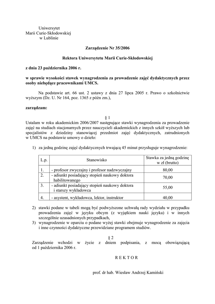 Zarządzenie nr 35-2006 Rektora Uniwersytetu Marii Curie