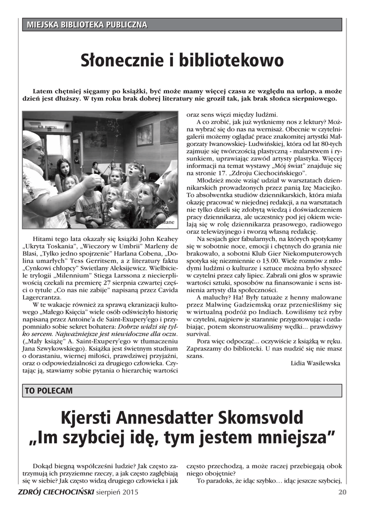 MIEJSKA BIBLIOTEKA PUBLICZNA S∏onecznie i bibliotekowo Latem ch´tniej si´gamy po ksià˝ki, byç mo˝e mamy wi´cej czasu ze wzgl´du na urlop, a mo˝e dzieƒ jest d∏u˝szy. W tym roku brak dobrej literatury nie grozi∏ tak, jak brak s∏oƒca sierpniowego. fot. nades∏ane Hitami tego lata okaza∏y si´ ksià˝ki John Keahey „Ukryta Toskania”, „Wieczory w Umbrii” Marleny de Blasi, „Tylko jedno spojrzenie” Harlana Cobena, „Dolina umar∏ych” Tess Gerritsem, a z literatury faktu „Cynkowi ch∏opcy” Swietlany Aleksijewicz. Wielbiciele trylogii „Milennium” Stiega Larssona z niecierpliwoÊcià czekali na premier´ 27 sierpnia czwartej cz´Êci o tytule „Co nas nie zabije” napisanà przez Cavida Lagercrantza. W te wakacje równie˝ za sprawà ekranizacji kultowego „Ma∏ego Ksi´cia” wiele osób odÊwie˝y∏o histori´ napisanà przez Antoine'a de Saint-Exupery'ego i przypomnia∏o sobie sekret bohatera: Dobrze widzi si´ tylko sercem. Najwa˝niejsze jest niewidoczne dla oczu. („Ma∏y ksià˝´” A. Saint-Exupery'ego w t∏umaczeniu Jana Szwykowskiego). Ksià˝ka jest Êwietnym studium o dorastaniu, wiernej mi∏oÊci, prawdziwej przyjaêni, oraz o odpowiedzialnoÊci za drugiego cz∏owieka. Czytajàc jà, stawiamy sobie pytania o hierarchi´ wartoÊci oraz sens wi´zi mi´dzy ludêmi. A co zrobiç, jak ju˝ wytkniemy nos z lektury? Mo˝na wybraç si´ do nas na wernisa˝. Obecnie w czytelnigalerii mo˝emy oglàdaç prace znakomitej artystki Ma∏gorzaty Iwanowskiej- Ludwiƒskiej, która od lat 80-tych zajmuje si´ twórczoÊcià plastycznà - malarstwem i rysunkiem, uprawiajàc zawód artysty plastyka. Wi´cej informacji na temat wystawy „Mój Êwiat” znajduje si´ na stronie 17. „Zdroju Ciechociƒskiego”. M∏odzie˝ mo˝e wziàç udzia∏ w warsztatach dziennikarskich prowadzonych przez panià Iz´ Maciejko. To absolwentka studiów dziennikarskich, która mia∏a okazj´ pracowaç w niejednej redakcji, a na warsztatach nie tylko dzieli si´ zdobytà wiedzà i doÊwiadczeniem pracy dziennikarza, ale uczestnicy pod jej okiem wcielajà si´ w rol´ dziennikarza prasowego, radiowego oraz telewizyjnego i tworzà w∏asnà redakcj´. Na sesjach gier fabularnych, na których spotykamy si´ w sobotnie noce, emocji i ch´tnych do grania nie brakowa∏o, a sobotni Klub Gier Niekomputerowych spotyka si´ niezmiennie o 13.00. Wiele rozmów z m∏odymi ludêmi o kulturze i sztuce mo˝na by∏o s∏yszeç w czytelni przez ca∏y lipiec. Zabrali oni g∏os w sprawie wartoÊci sztuki, sposobów na finansowanie i sens istnienia artysty dla spo∏ecznoÊci. A maluchy? Ha! By∏y tatua˝e z henny malowane przez Malwin´ Gadziemskà oraz przenieÊliÊmy si´ w wirtualnà podró˝ po Indiach. ¸owiliÊmy te˝ ryby w czytelni, najpierw je starannie przygotowujàc i ozdabiajàc, potem skonstruowaliÊmy w´dki... prawdziwy survival. Pora wi´c odpoczàç... oczywiÊcie z ksià˝kà w r´ku. Zapraszamy do biblioteki. U nas nudziç si´ nie masz szans. Lidia Wasilewska TO POLECAM Kjersti Annesdatter Skomsvold „Im szybciej id´, tym jestem mniejsza” Dokàd biegnà wspó∏czeÊni ludzie? Jak cz´sto zatrzymujà ich przyziemne rzeczy, a jak cz´sto zag∏´biajà si´ w siebie? Jak cz´sto widzà drugiego cz∏owieka i jak ZDRÓJ CIECHOCI¡SKI sierpieƒ 2015 cz´sto przechodzà, a mo˝e raczej przebiegajà obok niego oboj´tnie? To paradoks, ˝e idàc szybko… idàc jeszcze szybciej, 20 stajà si´ coraz mniejsi, coraz mniej widoczni, a˝ w koƒcu zupe∏nie niewidoczni… Wszystko to K. Annesdatter Skomsvold sprawnie uj´∏a w swojej ksià˝ce. „Im szybciej id´, tym jestem mniejsza” to historia kobiety samotnej, ale i osamotnionej, bo ˝yjàc dla siebie, dla Êwiata umar∏a ju˝ dawno. Mathea Martinsen coraz szybciej zbli˝a si´ bowiem w obj´cia Êmierci… Staruszka nie ma ju˝ zbyt wiele do czynienia z ludêmi, ˝yje samotnie w Oslo, dzielàc swój los jedynie z m´˝em. Ze wszystkich si∏ stara si´ omijaç sàsiadów, ich sprawy i problemy. Zwyczajnie, nie chce byç cz´Êcià ich Êwiata. Dla niej ˝ycie toczy si´ w jej „czterech Êcianach”. Cieszy si´, ˝e mo˝e je dzieliç z m´˝em Epsylonem, którego zna niemal od zawsze i który jako nieliczny widzi w niej cz∏owieka. Poznali si´ w szkole podstawowej, kiedy dwukrotnie tego samego dnia zosta∏a ra˝ona przez pioruna i od tamtego czasu sà nieroz∏àczni. Epsylon akceptuje jej „dziwactwa”, godzi si´ z rytua∏em dnia przyj´tym przez Mathe´, z pokorà i bez sprzeciwu przyjmuje jej podejÊcie do ˝ycia, aby byç niezauwa˝onà. To by∏ jej pomys∏ na ˝ycie, to by∏a jej potrzeba… A teraz… umiera! Stojàc, a w∏aÊciwie idàc w obj´cia Êmierci, niejako rozprawia si´ ze swoim „tu i teraz” na Ziemi. UÊwiadamia sobie bolesnà prawd´, ˝e umrze i nikt tego nie zauwa˝y. Mathea szczególnie boleÊnie odczuwa to, co jest udzia∏em ka˝dego starego cz∏owieka - to, ˝e dla Êwiata jest niewidzialna. Na przekór swojemu strachowi pokonuje wewn´trzny opór i chce wyjÊç do ludzi. Podejmuje szereg dzia∏aƒ, czasami absurdalnych i mo˝e Êmiesznych, ale zwyczajnie pragnie zostaç dostrze˝ona. Nie ma dzieci, dlatego jej pomys∏em jest kapsu∏a czasu - Êlad po jej ˝yciu. Jak bowiem sama twierdzi, czasami trzeba zrobiç coÊ, ˝eby „nadaç sens bezsensownemu”. „Im szybciej id´, tym jestem mniejsza” to pierwsza zauwa˝ona przez krytyków powieÊç m∏odej, skandynawskiej pisarki. Niepodwa˝alnà wartoÊcià tej krót- kiej powieÊci jest z pewnoÊcià jej j´zyk - barwny, ∏atwy w odbiorze i pe∏en metafor. I oczywiÊcie jeszcze to, ˝e o sprawach trudnych, bolesnych, mo˝na jednak pisaç z przymru˝eniem oka i szczyptà nadziei, a nawet zaskakujàco zabawnie. Spójrzmy zatem na ksià˝k´ Kjersti Annesdatter Skomsyold jak na ciep∏à i prostà ironi´ na temat ˝ycia, ale nie ˝ycia u jego schy∏ku, a w∏aÊnie ˝ycia pe∏nà piersià. Katarzyna W