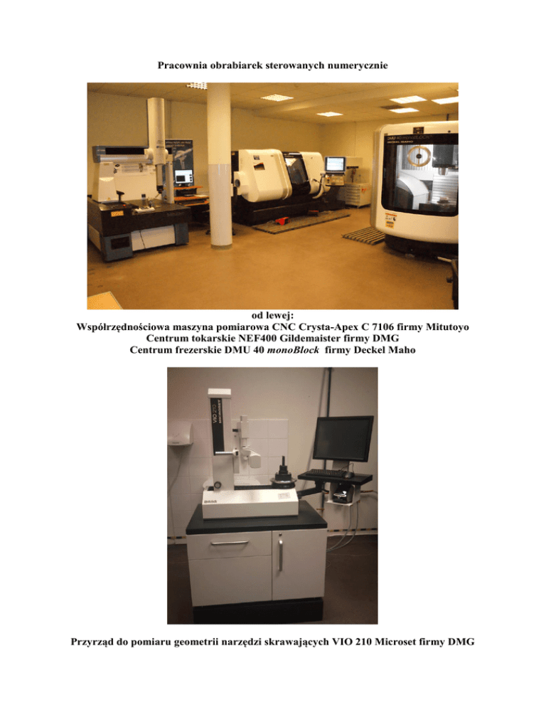 Pracownia obrabiarek sterowanych numerycznie od lewej: Współrzędnościowa maszyna pomiarowa CNC Crysta-Apex C 7106 firmy Mitutoyo Centrum tokarskie NEF400 Gildemaister firmy DMG Centrum frezerskie DMU 40 monoBlock firmy Deckel Maho Przyrząd do pomiaru geometrii narzędzi skrawających VIO 210 Microset firmy DMG Laboratorium materiałoznawstwa Mikroskop metalograficzny Eclipse MA 200 firmy Nikon Mikroskop stereograficzny firmy OPTA – TECH Twardościomierz uniwersalny KB 3000 BVRZ Laboratorium materiałów budowlanych Urządzenie do badania wodoprzepuszczalności betonu Toropol B-010. Mieszarka laboratoryjna do betonów i zapraw 5l Laboratorium technologii materiałów Kamera termowizyjna Thermo Tracer H2640 Laserowa znakowarka Genesis Marker CTL 1516 Mikrotwardościomierz Vickers 401MVD Analizator DMA/SDTA861