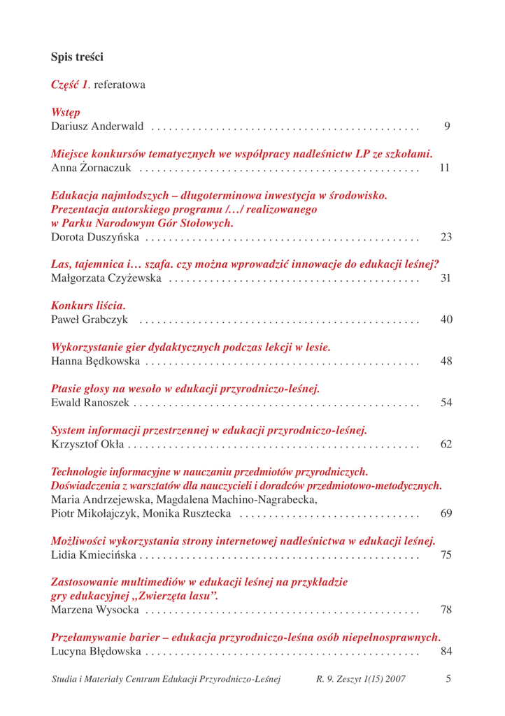 Spis treści Część 1. referatowa Wstęp Dariusz Anderwald . . . . . . . . . . . . . . . . . . . . . . . . . . . . . . . . . . . . . . . . . . . . . . 9 Miejsce konkursów tematycznych we współpracy nadleśnictw LP ze szkołami. Anna Żornaczuk . . . . . . . . . . . . . . . . . . . . . . . . . . . . . . . . . . . . . . . . . . . . . . . . 11 Edukacja najmłodszych – długoterminowa inwestycja w środowisko. Prezentacja autorskiego programu /…/ realizowanego w Parku Narodowym Gór Stołowych. Dorota Duszyńska . . . . . . . . . . . . . . . . . . . . . . . . . . . . . . . . . . . . . . . . . . . . . . . 23 Las, tajemnica i… szafa. czy można wprowadzić innowacje do edukacji leśnej? 31 Małgorzata Czyżewska . . . . . . . . . . . . . . . . . . . . . . . . . . . . . . . . . . . . . . . . . . . Konkurs liścia. Paweł Grabczyk . . . . . . . . . . . . . . . . . . . . . . . . . . . . . . . . . . . . . . . . . . . . . . . . 40 Wykorzystanie gier dydaktycznych podczas lekcji w lesie. Hanna Będkowska . . . . . . . . . . . . . . . . . . . . . . . . . . . . . . . . . . . . . . . . . . . . . . . 48 Ptasie głosy na wesoło w edukacji przyrodniczo-leśnej. Ewald Ranoszek . . . . . . . . . . . . . . . . . . . . . . . . . . . . . . . . . . . . . . . . . . . . . . . . . 54 System informacji przestrzennej w edukacji przyrodniczo-leśnej. Krzysztof Okła . . . . . . . . . . . . . . . . . . . . . . . . . . . . . . . . . . . . . . . . . . . . . . . . . . 62 Technologie informacyjne w nauczaniu przedmiotów przyrodniczych. Doświadczenia z warsztatów dla nauczycieli i doradców przedmiotowo-metodycznych. Maria Andrzejewska, Magdalena Machino-Nagrabecka, Piotr Mikołajczyk, Monika Rusztecka . . . . . . . . . . . . . . . . . . . . . . . . . . . . . . . 69 Możliwości wykorzystania strony internetowej nadleśnictwa w edukacji leśnej. 75 Lidia Kmiecińska . . . . . . . . . . . . . . . . . . . . . . . . . . . . . . . . . . . . . . . . . . . . . . . . Zastosowanie multimediów w edukacji leśnej na przykładzie gry edukacyjnej „Zwierzęta lasu”. Marzena Wysocka . . . . . . . . . . . . . . . . . . . . . . . . . . . . . . . . . . . . . . . . . . . . . . . 78 Przełamywanie barier – edukacja przyrodniczo-leśna osób niepełnosprawnych. 84 Lucyna Błędowska . . . . . . . . . . . . . . . . . . . . . . . . . . . . . . . . . . . . . . . . . . . . . . . Studia i Materiały Centrum Edukacji Przyrodniczo-Leśnej R. 9. Zeszyt 1(15) 2007 5 Rola zmysłów w edukacji przyrodniczo-leśnej na przykładzie Leśnictwa Miejskiego Łódź. Kamil Polański . . . . . . . . . . . . . . . . . . . . . . . . . . . . . . . . . . . . . . . . . . . . . . . . . . 95 Czy edukacja ekologiczna może wzbudzać emocje służące ochronie przyrody? Katarzyna Krakowska . . . . . . . . . . . . . . . . . . . . . . . . . . . . . . . . . . . . . . . . . . . . 105 Komunikacja werbalna w teorii i praktyce – od słownika do zabawy. Między potocznym a pożytecznym znaczeniem lasu. Mariusz Gołąb . . . . . . . . . . . . . . . . . . . . . . . . . . . . . . . . . . . . . . . . . . . . . . . . . . 113 Komunikacja niewerbalna w teorii i praktyce. Anna Skrok, Stanisław T. Średziński . . . . . . . . . . . . . . . . . . . . . . . . . . . . . . . . 121 Część 2. warsztatowa Poznajemy las inaczej. Propozycja zajęć z dziećmi niepełnosprawnymi. Anna Skrok, Stanisław T. Średziński . . . . . . . . . . . . . . . . . . . . . . . . . . . . . . . 131 Gry i zabawy realizowane na przyrodniczej ścieżce zmysłów. Magdalena Mądrawska . . . . . . . . . . . . . . . . . . . . . . . . . . . . . . . . . . . . . . . . . . 139 Na scieżkach zmysłów. Jolanta Gaczyńska . . . . . . . . . . . . . . . . . . . . . . . . . . . . . . . . . . . . . . . . . . . . . . 145 Ziemia to nasz dom. Poznajemy ją i chronimy. Dorota Duszyńska . . . . . . . . . . . . . . . . . . . . . . . . . . . . . . . . . . . . . . . . . . . . . . 149 Poznajemy ppracęę leśnika i drzewa w naszym lesie. Joanna Gil-Śleboda . . . . . . . . . . . . . . . . . . . . . . . . . . . . . . . . . . . . . . . . . . . . . 153 Metody aktywizujące na przykładzie ptaków. Alina Rodziewicz . . . . . . . . . . . . . . . . . . . . . . . . . . . . . . . . . . . . . . . . . . . . . . . 156 Gra dydaktyczna Zgadnij, kim jestem? Hanna Będkowska . . . . . . . . . . . . . . . . . . . . . . . . . . . . . . . . . . . . . . . . . . . . . . 163 Układanka Florian. Rozpoznawanie drzew i krzewów. Kinga Borowska . . . . . . . . . . . . . . . . . . . . . . . . . . . . . . . . . . . . . . . . . . . . . . . . 166 Rozwój owada – integracyjne zabawy aktywizujące. Grażyna Głuch . . . . . . . . . . . . . . . . . . . . . . . . . . . . . . . . . . . . . . . . . . . . . . . . . 172 6 SPIS TREŚCI Appendix / Wnioski XI Konferencja Współczesne Zagadnienia Edukacji Leśnej Społeczeństwa Uwolnić emocje edukacji leśnej – leśne konkursy i gry dydaktyczne – fotoreportaż . . . . . . . . . . . . . . . . . . . . . . . . . . . . . . . . . . . . . . . . . . . . . . . . . . 179 Uwolnić emocje edukacji leśnej. Finał konkursu fotograficznego . . . . . . . . . . . . . . . . . . . . . . . . . . . . . . . . . . . . 183 Indie – emocje i kontrasty społeczne. Maciej Frydrysiak . . . . . . . . . . . . . . . . . . . . . . . . . . . . . . . . . . . . . . . . . . . . . . 184 Syberiada – ludzie mało emocjonalni? Tomasz Ogrodowczyk . . . . . . . . . . . . . . . . . . . . . . . . . . . . . . . . . . . . . . . . . . . 185 Studia i Materiały Centrum Edukacji Przyrodniczo-Leśnej R. 9. Zeszyt 1(15) 2007 7