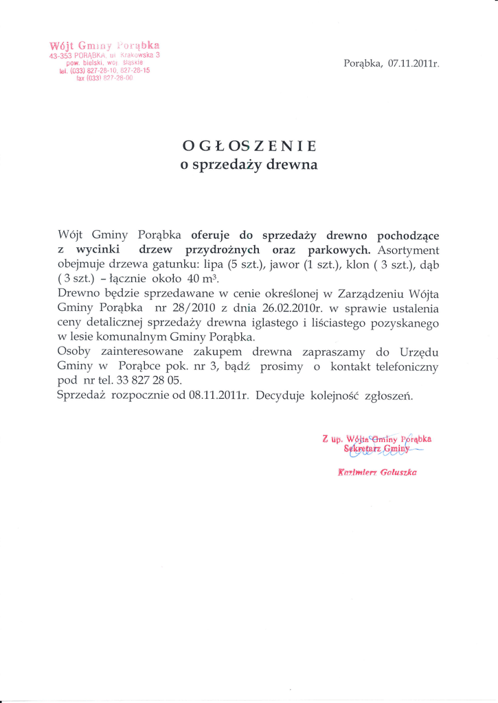 Wójt Gminy Porąbka oferuje do sptzedaży drewno pochodzące