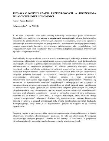 USTAWA O KORYTARZACH PRZESYŁOWYCH A ROSZCZENIA WŁAŚCICIELI NIERUCHOMOŚCI Autor: Agata Kaczor („Energetyka” – nr 7/2012) 1. W dniu 1 stycznia 2013 roku ,według informacji podawanych przez Ministerstwo Gospodarki, ma wejść w życie ustawa o korytarzach przesyłowych. Ma ona fundamentalne znaczenie dla przedsiębiorstw przesyłowych. Zgodnie z założeniami, ustawa ma uprościć i przyspieszyć procedury niezbędne dla przygotowania i zrealizowania inwestycji przesyłowej poprzez ustanowienie korytarza przesyłowego, definiowanego jako „wyodrębniony pod względem prawnym teren niezbędny do posadowienia i eksploatacji urządzeń przesyłowych zgodnie z ich przeznaczeniem”. Podkreśla się, że wprowadzenie nowych rozwiązań ustawowych zlikwiduje problem wielości postępowań, jakie należy przeprowadzić przed rozpoczęciem rozbudowy sieci. Zminimalizuje także ryzyka związane z potencjalnymi roszczeniami właścicieli nieruchomości, na których zlokalizowane są urządzenia przesyłowe. W efekcie- powiadają entuzjaści nowych rozwiązań- znikną wieloletnie opóźnienia w realizacji inwestycji, co przełoży się na niższe koszty ich przeprowadzania. Istotnie nowa ustawa o korytarzach przesyłowych kompleksowo ureguluje problemy inwestycji „przesyłowych”, usuwając główne przeszkody prawne i wprowadzając ułatwienia w realizacji działań z nimi związanych. Projektowane rozwiązania legislacyjne mają jednak także przeciwników. Podkreśla się zwłaszcza, że wprowadzanie rozwiązań wyjątkowych i odbiegających od przyjętych w naszym systemie prawnym rozwiązań ( a niewątpliwie do takich zaliczyć należy uzyskiwanie w uproszczonym trybie uprawnień do posadowienia urządzeń przesyłowych na cudzych nieruchomościach oraz eliminowanie znacznej części roszczeń właścicieli nieruchomości), powinno mieć charakter ograniczony – nawet w przypadku inwestycji celu publicznego. Zauważa się, że ustawa z 10.04.2003r. o drogach publicznych, która także ma służyć „uproszczeniu procedur” związanych z budową dróg jest ograniczona czasowo. Rozwiązania przyjęte w ustawie o drogach publicznych były zresztą przedmiotem rozważań Trybunału Konstytucyjnego, który uznał je za dopuszczalne jedynie ze względu na jej czasowe ograniczenie. Sceptycy wątpią w pozytywne efekty rozwiązań upraszczających dotychczasowe, w istocie długotrwałe, procedury administracyjne i podnoszą, że taki sam efekt można by osiągnąć wykorzystując istniejące przepisy (choćby art.124 ustawy z 21.08.1997r. o gospodarce nieruchomościami) i ulepszając standardy pracy organów administracyjnych. Projektowana ustawa ma również zapewnić uproszczony sposób ustanawiania służebności przesyłu na terenach zajętych pod korytarze przesyłowe oraz wprowadza mechanizmy służące uporządkowaniu stanu prawnego już funkcjonujących urządzeń przesyłowych. Na łamach niniejszego artykułu chciałabym zająć się tym właśnie aspektem tj. wpływu przepisów projektowanej ustawy na sposób regulacji stanu prawnego urządzeń przesyłowych już istniejących i posadowionych na nieruchomościach osób trzecich. 2. Regulacja stanu prawnego ciągów przesyłowych posadowionych nieruchomościach osób trzecich jest ciągle poważnym problemem. O jego skali świadczy choćby ilość zapadających rokrocznie orzeczeń sądów dotyczących roszczeń właścicieli nieruchomości wysuwanych przeciwko przedsiębiorcom przesyłowym. Efektem intensyfikacji tych roszczeń jest wypracowana już i poparta obszernym orzecznictwem, praktyka sądownicza, oraz zmiany legislacyjne- w szczególności instytucja służebności przesyłu , która weszła w życie w dniu 3.08.2008roku. Zgodnie z treścią projektowanej ustawy, dla urządzeń przesyłowych istniejących w dniu jej wejścia w życie, na wniosek władającego nimi przedsiębiorcy przesyłowego, właściwy organ wydaje decyzję o określeniu korytarza przesyłowego. Nie można odmówić wydania takiej decyzji dla istniejącego urządzenia przesyłowego, jeżeli właściwy organ nadzoru budowlanego nie nakazał rozbiórki tego urządzenia lub nie prowadzi postępowania w tej sprawie. Tak więc nawet urządzenia posadowione np. bez wymaganego pozwolenia na budowę zostaną „zalegalizowane” poprzez wydanie decyzji określającej korytarz przesyłowy. Decyzja taka nie wyznacza korytarza przesyłowego, a jedynie określa jego granice- wyznaczone już przez istniejące na gruncie urządzenia przesyłowe. Wydanie takiej decyzji oznacza iż, z mocy prawa, ustanowiona zostaje na gruncie służebność przesyłu, a decyzja stanowi podstawę wpisu tej służebności do księgi wieczystej. Decyzja taka ma być wydana w terminie 30 dni od daty złożenia wniosku o jej wydanie; uchybienie temu terminowi naraża organ administracyjny na karę pieniężną. Ustanowiona na mocy decyzji określającej korytarz przesyłowy służebność przesyłu obejmuje swym zakresem uprawnienie przedsiębiorcy do posadowienia urządzenia przesyłowego, utrzymywania, eksploatacji, konserwacji i remontu tego urządzenia, usuwania awarii, przebudowy lub odbudowy urządzenia, a także do wstępu lub wjazdu (w tym sprzętem ciężkim) na teren nieruchomości obciążonej służebnością w celu wykonania w/w czynności. Jak wygląda w takim przypadku sytuacja osoby, na której gruncie posadowiono urządzenie przesyłowe ? Ustawa przewiduje, że właściciel lub użytkownik ma prawo do jednorazowego odszkodowania – ustalanego na takich samych zasadach, jak w przypadku „nowo powstałego” urządzenia przesyłowego. Odszkodowanie to ustala się jako ułamek tzw. kwoty bazowej odszkodowania, zaś jego wysokość zależy od rodzaju urządzenia przesyłowego, rodzaju i położenia gruntu zajętego pod służebność przesyłu. Pobieżna nawet analiza skomplikowanych zasad wyliczania kwot odszkodowania prowadzi do wniosku, że kwota możliwego do uzy