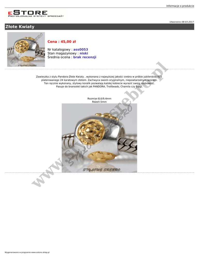 Informacje o produkcie Utworzono 08-03-2017 Złote Kwiaty Cena : 45,00 zł .p l Nr katalogowy : ass0053 Stan magazynowy : niski Średnia ocena : brak recenzji w es re b ro Zawieszka z stylu Pandora-Złote Kwiaty , wykonana z najwyższej jakości srebra w próbie jubilerskiej 925 platerowanego 24 karatowym złotem. Zachwyca swoim oryginalnym, niepowtarzalnym wzorem. Ten ręcznie wykonany, stylowy koralik pozwalają każdej kobiecie wyrazić swoją osobowość. Pasuje do bransolet takich jak PANDORA, Trollbeads, Chamila czy Biagi. w w w .s ty lo Rozmiar:8,6/9,4mm Rdzeń:5mm Wygenerowano w programie www.estore.sklep.pl