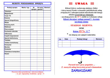 !!! REJESTR POSIADANEGO SPRZĘTU Rodzaj sprzętu Marka / typ Nr Nr karty Wartość sprzętu gwaran. Telewizor Magnetowid Tuner TV Kamera Klient zlecający usługę ponad 3 - krotnie uzyskuje status Wieża Kolumny Hi-Fi STAŁEGO KLIENTA oraz Walkmen Disccompact Rabat 15 Kuchenka mikrofal. Odkurzacz % !!! * * nie dotyczy cen użytych materiałów. Czajnik bezprzewod. Telefaks !!! Klienci którzy zachowają niniejszy folder i zlecą naszej Firmie wykonanie jakichkolwiek usług związanych z zabezpieczeniem mieszkania lub innego obiektu przed lub po włamaniu , - uzyskują prawo do 10 % zniżki za wykonane usługi. Aparat fotograficzny Aparat telefoniczny UWAGA Lp. Data Rodzaj Usługi Wartość Telefon komórkowy Komputer Monitor Drukarka Klawiatura komputera Rower Parasol noś i przy pogodzie ... Z naszych usług korzystaj przed włamaniem Powyższe dane przechowuj w ukrytym miejscu - to jest najczęściej kradziony sprzęt !!! ZAPRASZAMY