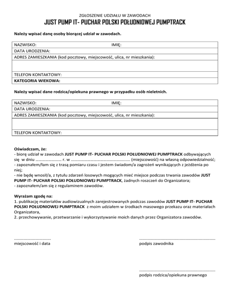 ZGŁOSZENIE UDZIAŁU W ZAWODACH JUST PUMP IT- PUCHAR POLSKI POŁUDNIOWEJ PUMPTRACK Należy wpisać danę osoby biorącej udział w zawodach. NAZWISKO: IMIĘ: DATA URODZENIA: ADRES ZAMIESZKANIA (kod pocztowy, miejscowość, ulica, nr mieszkania): TELEFON KONTAKTOWY: KATEGORIA WIEKOWA: Należy wpisać dane rodzica/opiekuna prawnego w przypadku osób nieletnich. NAZWISKO: IMIĘ: DATA URODZENIA: ADRES ZAMIESZKANIA (kod pocztowy, miejscowość, ulica, nr mieszkania): TELEFON KONTAKTOWY: Oświadczam, że: ‐ biorę udział w zawodach JUST PUMP IT‐ PUCHAR POLSKI POŁUDNIOWEJ PUMPTRACK odbywających się w dniu …………………… r. w …………………………………………...... (miejscowość) na własną odpowiedzialność; ‐ zapoznałem/łam się z trasą pomiaru czasu i jestem świadom/a zagrożeń wynikających z jeżdżenia po niej; ‐ nie będę wnosił/a, z tytułu zdarzeń losowych mogących mieć miejsce podczas trwania zawodów JUST PUMP IT‐ PUCHAR POLSKI POŁUDNIOWEJ PUMPTRACK, żadnych roszczeń do Organizatora; ‐ zapoznałem/am się z regulaminem zawodów. Wyrażam zgodę na: 1. publikację materiałów audiowizualnych zarejestrowanych podczas zawodów JUST PUMP IT‐ PUCHAR POLSKI POŁUDNIOWEJ PUMPTRACK z moim udziałem w środkach masowego przekazu oraz materiałach Organizatora, 2. przechowywanie, przetwarzanie i wykorzystywanie moich danych przez Organizatora zawodów. ............................... ................................................................ miejscowość i data podpis zawodnika ................................................................ podpis rodzica/opiekuna prawnego