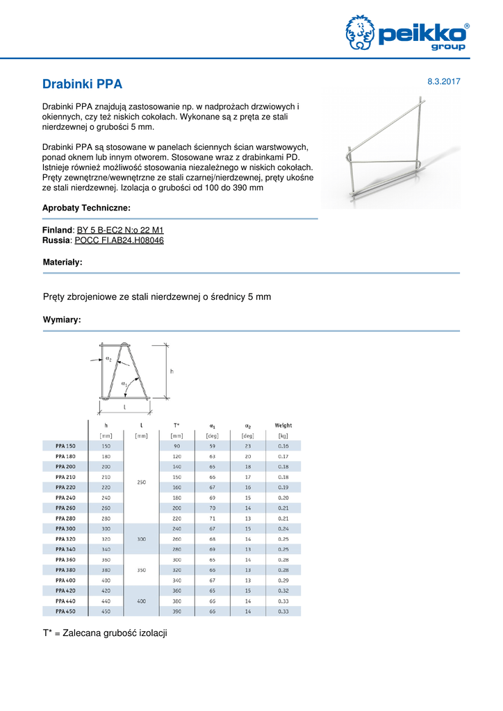 Drabinki PPA Drabinki PPA znajdują zastosowanie np. w nadprożach drzwiowych i okiennych, czy też niskich cokołach. Wykonane są z pręta ze stali nierdzewnej o grubości 5 mm. Drabinki PPA są stosowane w panelach ściennych ścian warstwowych, ponad oknem lub innym otworem. Stosowane wraz z drabinkami PD. Istnieje również możliwość stosowania niezależnego w niskich cokołach. Pręty zewnętrzne/wewnętrzne ze stali czarnej/nierdzewnej, pręty ukośne ze stali nierdzewnej. Izolacja o grubości od 100 do 390 mm Aprobaty Techniczne: Finland: BY 5 B-EC2 N:o 22 M1 Russia: POCC FI.AB24.H08046 Materiały: Pręty zbrojeniowe ze stali nierdzewnej o średnicy 5 mm Wymiary: T* = Zalecana grubość izolacji 8.3.2017 Wartość nośności: Please refer to Technical Manual.