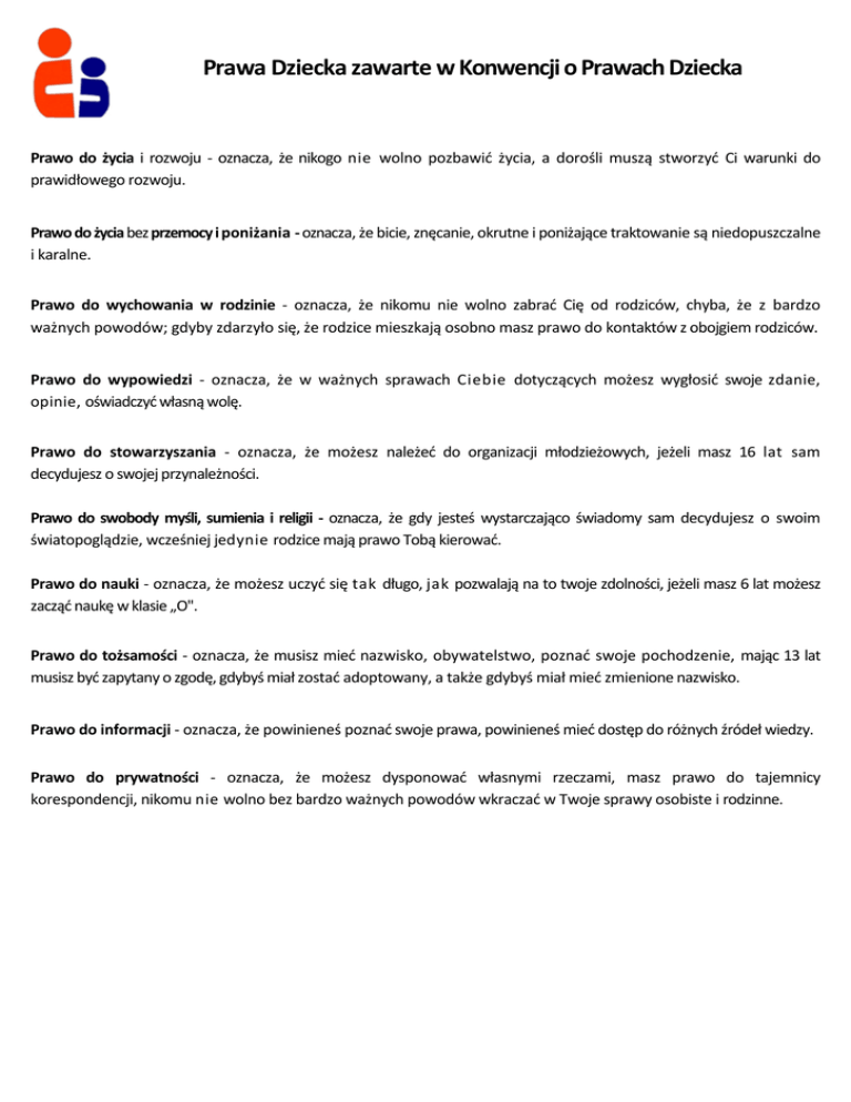 Prawa Dziecka zawarte w Konwencji o Prawach Dziecka Prawo do życia i rozwoju - oznacza, że nikogo nie wolno pozbawić życia, a dorośli muszą stworzyć Ci warunki do prawidłowego rozwoju. Prawo do życia bez przemocy i poniżania - oznacza, że bicie, znęcanie, okrutne i poniżające traktowanie są niedopuszczalne i karalne. Prawo do wychowania w rodzinie - oznacza, że nikomu nie wolno zabrać Cię od rodziców, chyba, że z bardzo ważnych powodów; gdyby zdarzyło się, że rodzice mieszkają osobno masz prawo do kontaktów z obojgiem rodziców. Prawo do wypowiedzi - oznacza, że w ważnych sprawach Ciebie dotyczących możesz wygłosić swoje zdanie, opinie, oświadczyć własną wolę. Prawo do stowarzyszania - oznacza, że możesz należeć do organizacji młodzieżowych, jeżeli masz 16 lat sam decydujesz o swojej przynależności. Prawo do swobody myśli, sumienia i religii - oznacza, że gdy jesteś wystarczająco świadomy sam decydujesz o swoim światopoglądzie, wcześniej jedynie rodzice mają prawo Tobą kierować. Prawo do nauki - oznacza, że możesz uczyć się tak długo, jak pozwalają na to twoje zdolności, jeżeli masz 6 lat możesz zacząć naukę w klasie „O". Prawo do tożsamości - oznacza, że musisz mieć nazwisko, obywatelstwo, poznać swoje pochodzenie, mając 13 lat musisz być zapytany o zgodę, gdybyś miał zostać adoptowany, a także gdybyś miał mieć zmienione nazwisko. Prawo do informacji - oznacza, że powinieneś poznać swoje prawa, powinieneś mieć dostęp do różnych źródeł wiedzy. Prawo do prywatności - oznacza, że możesz dysponować własnymi rzeczami, masz prawo do tajemnicy korespondencji, nikomu nie wolno bez bardzo ważnych powodów wkraczać w Twoje sprawy osobiste i rodzinne.