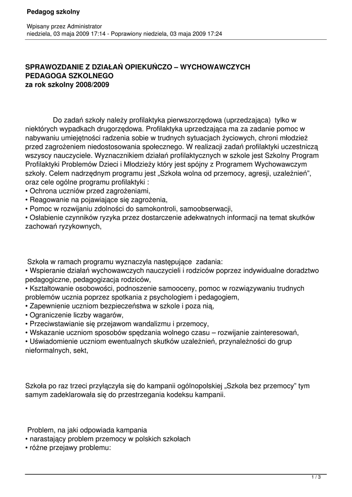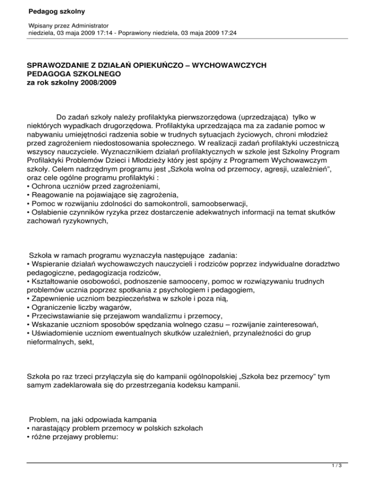 Pedagog szkolny Wpisany przez Administrator niedziela, 03 maja 2009 17:14 - Poprawiony niedziela, 03 maja 2009 17:24 SPRAWOZDANIE Z DZIAŁAŃ OPIEKUŃCZO – WYCHOWAWCZYCH PEDAGOGA SZKOLNEGO za rok szkolny 2008/2009 Do zadań szkoły należy profilaktyka pierwszorzędowa (uprzedzająca) tylko w niektórych wypadkach drugorzędowa. Profilaktyka uprzedzająca ma za zadanie pomoc w nabywaniu umiejętności radzenia sobie w trudnych sytuacjach życiowych, chroni młodzież przed zagrożeniem niedostosowania społecznego. W realizacji zadań profilaktyki uczestniczą wszyscy nauczyciele. Wyznacznikiem działań profilaktycznych w szkole jest Szkolny Program Profilaktyki Problemów Dzieci i Młodzieży który jest spójny z Programem Wychowawczym szkoły. Celem nadrzędnym programu jest „Szkoła wolna od przemocy, agresji, uzależnień”, oraz cele ogólne programu profilaktyki : • Ochrona uczniów przed zagrożeniami, • Reagowanie na pojawiające się zagrożenia, • Pomoc w rozwijaniu zdolności do samokontroli, samoobserwacji, • Osłabienie czynników ryzyka przez dostarczenie adekwatnych informacji na temat skutków zachowań ryzykownych, Szkoła w ramach programu wyznaczyła następujące zadania: • Wspieranie działań wychowawczych nauczycieli i rodziców poprzez indywidualne doradztwo pedagogiczne, pedagogizacja rodziców, • Kształtowanie osobowości, podnoszenie samooceny, pomoc w rozwiązywaniu trudnych problemów ucznia poprzez spotkania z psychologiem i pedagogiem, • Zapewnienie uczniom bezpieczeństwa w szkole i poza nią, • Ograniczenie liczby wagarów, • Przeciwstawianie się przejawom wandalizmu i przemocy, • Wskazanie uczniom sposobów spędzania wolnego czasu – rozwijanie zainteresowań, • Uświadomienie uczniom ewentualnych skutków uzależnień, przynależności do grup nieformalnych, sekt, Szkoła po raz trzeci przyłączyła się do kampanii ogólnopolskiej „Szkoła bez przemocy” tym samym zadeklarowała się do przestrzegania kodeksu kampanii. Problem, na jaki odpowiada kampania • narastający problem przemocy w polskich szkołach • różne przejawy problemu: 1/3 Pedagog szkolny Wpisany przez Administrator niedziela, 03 maja 2009 17:14 - Poprawiony niedziela, 03 maja 2009 17:24 – przemoc uczniów wobec uczniów – nauczycieli wobec uczniów – coraz częściej - uczniów wobec nauczycieli – przemoc fizyczna i przemoc psychiczna • obniżający się wiek sprawców i ofiar • brak systemowych działań nakierowanych na zmianę niekorzystnych tendencji • przeciwdziałanie przemocy w szkole często ogranicza się tylko do wzmagania kontroli, kar i restrykcji Bieżący rok szkolny patronuje przesłanie „Bez przemocy i agresji, kultura i ogłada to moja zasada”. W ramach zaplanowanych działań odbył się program profilaktyczny w październiku „Mediatorka”. Spektakl poświęcony był problematyce zagrożeń, z którymi spotyka się młody człowiek we współczesnej rzeczywistości. Spektakl poruszał ważną, w szczególności dla młodego człowieka, kwestię zaufania do drugiego człowieka. Bohaterowie próbują kreować swój wyimaginowany wizerunek nie według stałych wartości, ale dopasowywanych do indywidualnych potrzeb w zmieniającej się rzeczywistości. W grudniu odbył się program edukacyjny w ramach Mikołajek Szkolnych „Muzyka klasyczna nie gryzie” Wrocławscy Kameraliści Cantores Minores Wratislavienses są instytucją kultury Gminy Wrocław. W jej skład wchodzą: założony w 1966 r. chór kameralny Cantores Minores Wratislavienses oraz powołany w 2000 r. zespół Ars Cantus. Celem instytucji jest prezentacja i upowszechnianie dawnych i współczesnych pieśni chóralnych oraz muzyki polskiej, europejskiej i światowej, zaś do jej głównych zadań należy organizowanie i prowadzenie edukacji muzycznej mieszkańców regionu ze szczególnym uwzględnieniem kształcenia młodzieży. Program edukacyjny Muzyka klasyczna nie gryzie! składa się z 7 cykli stanowiących kolejne kroki. • Realizacja programu „Niepełnosprawni są wśród nas”. (I sem.) • Realizacja programu „Narkotykom STOP” – Klasy II • Lekcje przestrogi • Światowy Dzień walki z AIDS, „Wróć bez HIV” – (grudzień 2008) godziny pedagoga w klasach drugich • Realizacja programu własnego A. Jagieło, M. Mazurska„Mam prawo”- 10 grudnia – happening oraz apel poświęcony 60-tej rocznicy podpisania Powszechnej Deklaracji Praw Człowieka: W trakcie apelu zostały zaprezentowane prezentacje przygotowane przez uczniów. W ramach programu odbył się konkurs wiedzy na temat praw człowieka. • Akcja Koncert dla Adasia – podczas listopadowej wywiadówki młodzież zaprezentowała rodzicom swoje umiejętności wokalne, w trakcie koncertu zebrano 1613.-złotych dla chorego kolegi, • W ramach pedagogizacji rodziców 14.01.2009r. odbyło się spotkanie rodziców uczniów klas III z pedagogiem szkolnym na temat demoralizacji wśród młodzieży oraz przedstawienie 2/3 Pedagog szkolny Wpisany przez Administrator niedziela, 03 maja 2009 17:14 - Poprawiony niedziela, 03 maja 2009 17:24 programu „Narkotykom STOP”. • Tydzień ofiarom przestępstw - W dniach od 22 lutego do 1 marca już po raz czwarty obchodziliśmy w Polsce "Tydzień Ofiar Przestępstw". Jest to czas na kampanię informacyjną sądów i prokuratur, które w tych dniach będą bezpłatnie udzielać ofiarom przestępstw porad prawnych. Tegoroczna akcja kładła szczególny nacisk na pomoc dzieciom – ofiarom przemocy seksualnej. Prezentacja ścienna oraz godziny pedagoga w klasach III gimnazjum. • Ponadto od kwietnia do czerwca po raz siódmy w naszej szkole realizowany był program psychoprofilaktyczny autorstwa Marii Król – Fijewskiej i Piotra Fijewskiego „Nasze Spotkania”. Koncentruje się on na wyuczeniu uczniów najważniejszych umiejętności psychologicznych jak: rozumienie siebie i innych ludzi, umiejętność nawiązywania satysf