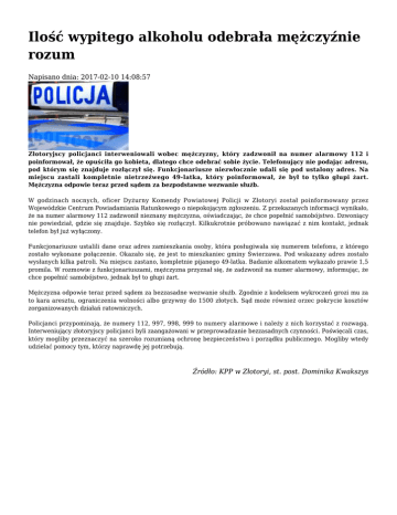 Ilość wypitego alkoholu odebrała mężczyźnie rozum Napisano dnia: 2017-02-10 14:08:57 Złotoryjscy policjanci interweniowali wobec mężczyzny, który zadzwonił na numer alarmowy 112 i poinformował, że opuściła go kobieta, dlatego chce odebrać sobie życie. Telefonujący nie podając adresu, pod którym się znajduje rozłączył się. Funkcjonariusze niezwłocznie udali się pod ustalony adres. Na miejscu zastali kompletnie nietrzeźwego 49-latka, który poinformował, że był to tylko głupi żart. Mężczyzna odpowie teraz przed sądem za bezpodstawne wezwanie służb. W godzinach nocnych, oficer Dyżurny Komendy Powiatowej Policji w Złotoryi został poinformowany przez Wojewódzkie Centrum Powiadamiania Ratunkowego o niepokojącym zgłoszeniu. Z przekazanych informacji wynikało, że na numer alarmowy 112 zadzwonił nieznany mężczyzna, oświadczając, że chce popełnić samobójstwo. Dzwoniący nie powiedział, gdzie się znajduje. Szybko się rozłączył. Kilkukrotnie próbowano nawiązać z nim kontakt, jednak telefon był już wyłączony. Funkcjonariusze ustalili dane oraz adres zamieszkania osoby, która posługiwała się numerem telefonu, z którego zostało wykonane połączenie. Okazało się, że jest to mieszkaniec gminy Świerzawa. Pod wskazany adres zostało wysłanych kilka patroli. Na miejscu zastano, kompletnie pijanego 49-latka. Badanie alkomatem wykazało prawie 1,5 promila. W rozmowie z funkcjonariuszami, mężczyzna przyznał się, że zadzwonił na numer alarmowy, informując, że chce popełnić samobójstwo, jednak był to głupi żart. Mężczyzna odpowie teraz przed sądem za bezzasadne wezwanie służb. Zgodnie z kodeksem wykroczeń grozi mu za to kara aresztu, ograniczenia wolności albo grzywny do 1500 złotych. Sąd może również orzec pokrycie kosztów zorganizowanych działań ratowniczych. Policjanci przypominają, że numery 112, 997, 998, 999 to numery alarmowe i należy z nich korzystać z rozwagą. Interweniujący złotoryjscy policjanci byli zaangażowani w przeprowadzanie bezzasadnych czynności. Poświęcali czas, który mogliby przeznaczyć na szeroko rozumianą ochronę bezpieczeństwa i porządku publicznego. Mogliby wtedy udzielać pomocy tym, którzy naprawdę jej potrzebują. Źródło: KPP w Złotoryi, st. post. Dominika Kwakszys