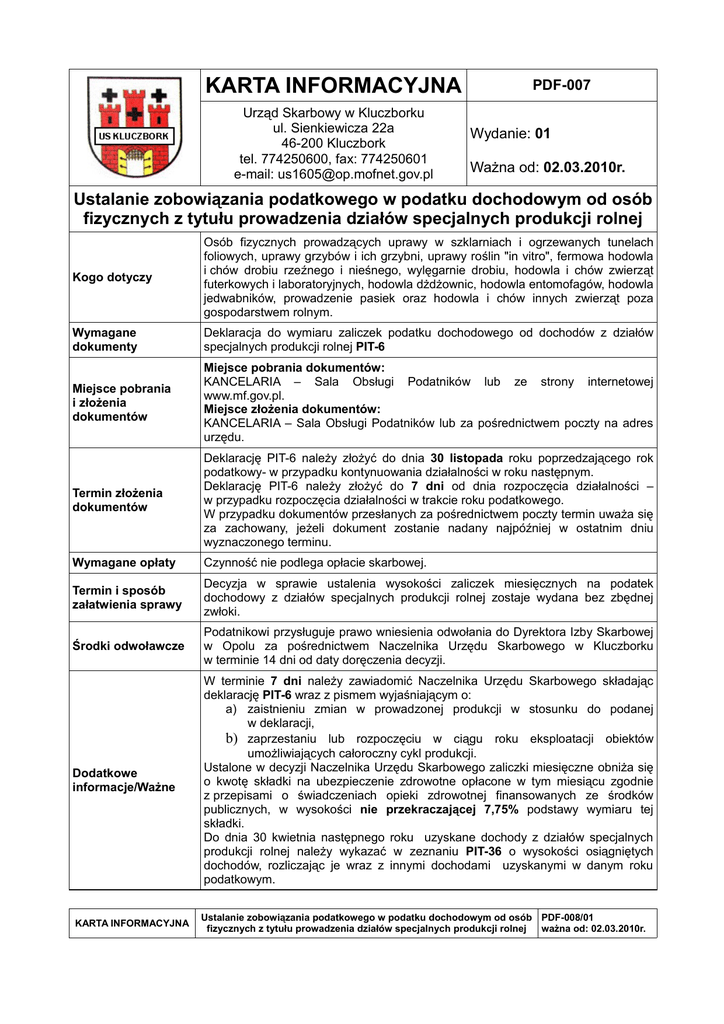 KARTA INFORMACYJNA Urząd Skarbowy w Kluczborku ul. Sienkiewicza 22a 46-200 Kluczbork tel. 774250600, fax: 774250601 e-mail: [email protected] PDF-007 Wydanie: 01 Ważna od: 02.03.2010r. Ustalanie zobowiązania podatkowego w podatku dochodowym od osób fizycznych z tytułu prowadzenia działów specjalnych produkcji rolnej Kogo dotyczy Osób fizycznych prowadzących uprawy w szklarniach i ogrzewanych tunelach foliowych, uprawy grzybów i ich grzybni, uprawy roślin "in vitro", fermowa hodowla i chów drobiu rzeźnego i nieśnego, wylęgarnie drobiu, hodowla i chów zwierząt futerkowych i laboratoryjnych, hodowla dżdżownic, hodowla entomofagów, hodowla jedwabników, prowadzenie pasiek oraz hodowla i chów innych zwierząt poza gospodarstwem rolnym. Wymagane dokumenty Deklaracja do wymiaru zaliczek podatku dochodowego od dochodów z działów specjalnych produkcji rolnej PIT-6 Miejsce pobrania i złożenia dokumentów Miejsce pobrania dokumentów: KANCELARIA – Sala Obsługi Podatników lub ze strony internetowej www.mf.gov.pl. Miejsce złożenia dokumentów: KANCELARIA – Sala Obsługi Podatników lub za pośrednictwem poczty na adres urzędu. Termin złożenia dokumentów Deklarację PIT-6 należy złożyć do dnia 30 listopada roku poprzedzającego rok podatkowy- w przypadku kontynuowania działalności w roku następnym. Deklarację PIT-6 należy złożyć do 7 dni od dnia rozpoczęcia działalności – w przypadku rozpoczęcia działalności w trakcie roku podatkowego. W przypadku dokumentów przesłanych za pośrednictwem poczty termin uważa się za zachowany, jeżeli dokument zostanie nadany najpóźniej w ostatnim dniu wyznaczonego terminu. Wymagane opłaty Czynność nie podlega opłacie skarbowej. Termin i sposób załatwienia sprawy Decyzja w sprawie ustalenia wysokości zaliczek miesięcznych na podatek dochodowy z działów specjalnych produkcji rolnej zostaje wydana bez zbędnej zwłoki. Środki odwoławcze Podatnikowi przysługuje prawo wniesienia odwołania do Dyrektora Izby Skarbowej w Opolu za pośrednictwem Naczelnika Urzędu Skarbowego w Kluczborku w terminie 14 dni od daty doręczenia decyzji. Dodatkowe informacje/Ważne W terminie 7 dni należy zawiadomić Naczelnika Urzędu Skarbowego składając deklarację PIT-6 wraz z pismem wyjaśniającym o: a) zaistnieniu zmian w prowadzonej produkcji w stosunku do podanej w deklaracji, b) zaprzestaniu lub rozpoczęciu w ciągu roku eksploatacji obiektów umożliwiających całoroczny cykl produkcji. Ustalone w decyzji Naczelnika Urzędu Skarbowego zaliczki miesięczne obniża się o kwotę składki na ubezpieczenie zdrowotne opłacone w tym miesiącu zgodnie z przepisami o świadczeniach opieki zdrowotnej finansowanych ze środków publicznych, w wysokości nie przekraczającej 7,75% podstawy wymiaru tej składki. Do dnia 30 kwietnia następnego roku uzyskane dochody z działów specjalnych produkcji rolnej należy wykazać w zeznaniu PIT-36 o wysokości osiągniętych dochodów, rozliczając je wraz z innymi dochodami uzyskanymi w danym roku podatkowym. KARTA INFORMACYJNA Ustalanie zobowiązania podatkowego w podatku dochodowym od osób PDF-008/01 fizycznych z tytułu prowadzenia działów specjalnych produkcji rolnej ważna od: 02.03.2010r. Odpowiedzialna komórka organizacyjna Dział Podatków Dochodowych, pok. 209, tel. 774250609. Podstawa prawna Ustawa z dnia 26 lipca 1991r. o podatku dochodowym od osób fizycznych (Dz.U z 2000r. Nr 14 poz.176 ze zm.). Ustawa z dnia 29 sierpnia 1997r. Ordynacja podatkowa (Dz.Uz 2005r. Nr 8 poz. 60 z późn.zm.). KARTA INFORMACYJNA Ustalanie zobowiązania podatkowego w podatku dochodowym od osób PDF-008/01 fizycznych z tytułu prowadzenia działów specjalnych produkcji rolnej ważna od: 02.03.2010r.