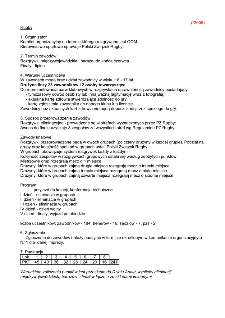 (*2009) Rugby 1. Organizator Komitet organizacyjny na terenie