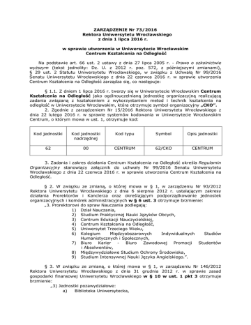 ZARZĄDZENIE Nr 73/2016 Rektora Uniwersytetu Wrocławskiego z dnia 1 lipca 2016 r. w sprawie utworzenia w Uniwersytecie Wrocławskim Centrum Kształcenia na Odległość Na podstawie art. 66 ust. 2 ustawy z dnia 27 lipca 2005 r. - Prawo o szkolnictwie wyższym (tekst jednolity: Dz. U. z 2012 r. poz. 572, z późniejszymi zmianami), § 29 ust. 2 Statutu Uniwersytetu Wrocławskiego, w związku z Uchwałą Nr 99/2016 Senatu Uniwersytetu Wrocławskiego z dnia 22 czerwca 2016 r. w sprawie utworzenia Centrum Kształcenia na Odległość zarządza się, co następuje: § 1.1. Z dniem 1 lipca 2016 r. tworzy się w Uniwersytecie Wrocławskim Centrum Kształcenia na Odległość jako ogólnouczelnianą jednostkę organizacyjną realizującą zadania związaną z kształceniem z wykorzystaniem metod i technik kształcenia na odległość w Uniwersytecie Wrocławskim, która otrzymuje symbol organizacyjny „CKO”. 2. Zgodnie z zarządzeniem Nr 15/2016 Rektora Uniwersytetu Wrocławskiego z dnia 22 lutego 2016 r. w sprawie systemów kodowania w Uniwersytecie Wrocławskim Centrum, o którym mowa w ust. 1, otrzymuje kod: Kod jednostki Kod jednostki nadrzędnej Kod typu Symbol Opis jednostki 62 00 CENTRUM 62/CKO CENTRUM 3. Zadania i zakres działania Centrum Kształcenia na Odległość określa Regulamin Organizacyjny stanowiący załącznik do uchwały Nr 99/2016 Senatu Uniwersytetu Wrocławskiego z dnia 22 czerwca 2016 r. w sprawie utworzenia Centrum Kształcenia na Odległość. § 2. W związku ze zmianą, o której mowa w § 1, w zarządzeniu Nr 93/2012 Rektora Uniwersytetu Wrocławskiego z dnia 6 sierpnia 2012 r. ustalającym zakresy działania Prorektorów i Kanclerza oraz określającym podporządkowanie jednostek organizacyjnych i komórek administracyjnych w § 6 ust. 3 otrzymuje brzmienie: „3. Prorektorowi do spraw Nauczania podlegają: 1) Dział Nauczania, 2) Studium Praktycznej Nauki Języków Obcych, 3) Centrum Edukacji Nauczycielskiej, 4) Centrum Kształcenia na Odległość, 5) Uniwersytet Trzeciego Wieku, 6) Kolegium Międzyobszarowych Indywidualnych Studiów Humanistycznych i Społecznych, 7) Biuro Karier Biuro Zawodowej Promocji Studentów i Absolwentów, 8) Międzywydziałowe Studium Ochrony Środowiska, 9) Studium Intensywnej Nauki Języka Angielskiego.”. § 3. W związku ze zmianą, o której mowa w § 1, w zarządzeniu Nr 146/2012 Rektora Uniwersytetu Wrocławskiego z dnia 31 grudnia 2012 r. w sprawie zasad gospodarki finansowej Uniwersytetu Wrocławskiego w § 10 w ust. 1 pkt 3 otrzymuje brzmienie: „3) Jednostki pozawydziałowe: a) Biblioteka Uniwersytecka, b) c) d) e) f) g) h) i) j) k) l) m) Archiwum Uniwersytetu Wrocławskiego, Muzeum Uniwersytetu Wrocławskiego, Studium Praktycznej Nauki Języków Obcych, Uniwersytet Trzeciego Wieku, Samodzielna Sekcja Obiekty Sportowe, Centrum Edukacji Nauczycielskiej, Centrum Kształcenia na Odległość, Centrum Studiów Niemieckich i Europejskich im. W. Brandta, Kolegium Międzyobszarowych Indywidualnych Studiów Humanistycznych i Społecznych, Międzywydziałowe Studium Ochrony Środowiska, Akademicki Inkubator Przedsiębiorczości, Ośrodek Szkoleniowy w zakresie Polityki Regionalnej Unii Europejskiej EURO REGIO – CENTRE.”. § 4. W związku ze zmianą, o której mowa w § 1, Załącznik Nr 3 do Regulaminu Organizacyjnego Administracji Uniwersytetu Wrocławskiego stanowiącego Załącznik do zarządzenia Nr 15/2013 Rektora Uniwersytetu Wrocławskiego z dnia 11 lutego 2013 r. w sprawie wprowadzenia Regulaminu Organizacyjnego Administracji Uniwersytetu Wrocławskiego otrzymuje brzmienie Załącznika do niniejszego zarządzenia. § 5. Nadzór nad wykonaniem niniejszego zarządzenia powierza się Prorektorowi ds. Nauczania. § 6. Zarządzenie wchodzi w życie z dniem podpisania. prof. dr hab. Marek Bojarski REKTOR Załącznik do zarządzenia Nr 73/2016 z dnia 1 lipca 2016 r. Załącznik do zarządzenia Nr 15/2013 Regulamin Organizacyjny Uniwersytetu Wrocławskiego Administracji PN Prorektor ds. Nauczania DN Dział Nauczania BZPSA Biuro Zawodowej Promocji Studentów i Absolwentów – Biuro Karier SPNJO Studium Praktycznej Nauki Języków Obcych UTW Uniwersytet Trzeciego Wieku CEN Centrum Edukacji Nauczycielskiej KMISHS Kolegium Międzyobszarowych Indywidualnych Studiów Humanistycznych i Społecznych MSOŚ Międzywydziałowe Studium Ochrony Środowiska SINJA Studium Intensywnej Nauki Języka Angielskiego CKO Centrum Kształcenia na Odległość Załącznik Nr 3