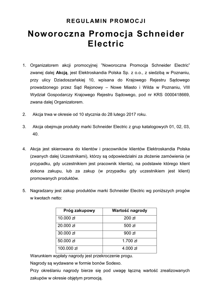 REGUL AMIN PROMOCJI Noworoczna Promocja Schneider Electric 1. Organizatorem akcji promocyjnej ”Noworoczna Promocja Schneider Electric” zwanej dalej Akcją, jest Elektroskandia Polska Sp. z o.o., z siedzibą w Poznaniu, przy ulicy Dziadoszańskiej 10, wpisana do Krajowego Rejestru Sądowego prowadzonego przez Sąd Rejonowy – Nowe Miasto i Wilda w Poznaniu, VIII Wydział Gospodarczy Krajowego Rejestru Sądowego, pod nr KRS 0000418669, zwana dalej Organizatorem. 2. Akcja trwa w okresie od 10 stycznia do 28 lutego 2017 roku. 3. Akcja obejmuje produkty marki Schneider Electric z grup katalogowych 01, 02, 03, 40. 4. Akcja jest skierowana do klientów i pracowników klientów Elektroskandia Polska (zwanych dalej Uczestnikami), którzy są odpowiedzialni za złożenie zamówienia (w przypadku, gdy uczestnikiem jest pracownik klienta), na podstawie którego klient dokona zakupu, lub za zakup (w przypadku gdy uczestnikiem jest klient) promowanych produktów. 5. Nagradzany jest zakup produktów marki Schneider Electric wg poniższych progów w kwotach netto: Próg zakupowy Wartość nagrody 10.000 zł 200 zł 20.000 zł 500 zł 30.000 zł 900 zł 50.000 zł 1.700 zł 100.000 zł 4.000 zł Warunkiem wypłaty nagrody jest przekroczenie progu. Nagrody są wydawane w formie bonów Sodexo. Przy określaniu nagrody bierze się pod uwagę łączną wartość zrealizowanych zakupów w okresie objętym promocją. 6. Można łączyć sprzedaż z kilku faktur, aby uzyskać większą wartość zakupów. Do akcji nie zalicza się sprzedaży pod inwestycje. 7. Aby zamówić nagrodę, Uczestnik zobowiązany jest do wypełnienia formularza, będącego załącznikiem nr 1 do niniejszego regulaminu i przesłania go na adres email: [email protected]. 8. Nagroda zostanie dosłana Uczestnikowi na adres wskazany w formularza, w ciągu 2 tygodni od daty zakończenia akcji. Wraz z nagrodą Uczestnik otrzyma dokument potwierdzający odbiór nagrody (będący załącznikiem nr 2 do niniejszego regulaminu), który należy podpisać i odesłać na adres: Elektroskandia Polska Sp. z o.o., Dział Marketingu, ul. Dziadoszańska 10, 61-248 Poznań lub wysłać skan dokumentu na [email protected]. 9. Towary zakupione w ramach promocji nie podlegają zwrotowi. 10. Warunkiem wydania nagrody jest brak przeterminowanych zobowiązań płatniczych danego klienta w stosunku do Organizatora, na dzień wydania nagrody. 11. Uczestnicy, po otrzymaniu nagrody podlegają obowiązkowi podatkowemu na zasadach ogólnych, stosownie do postanowień ustawy o podatku dochodowym od osób prawnych (CIT) albo ustawy o podatku dochodowym od osób fizycznych (PIT), z zastosowaniem zwolnienia do 200 zł brutto wartości nagrody. Zwolnienie to nie dotyczy osób prowadzących działalność gospodarczą, które otrzymały nagrodę w wyniku jej prowadzenia. Wówczas otrzymana nagroda stanowi przychód z tej działalności i podlega opodatkowaniu na zasadach ogólnych. 12. Przystępując do akcji Uczestnik akceptuje postanowienia niniejszego regulaminu.