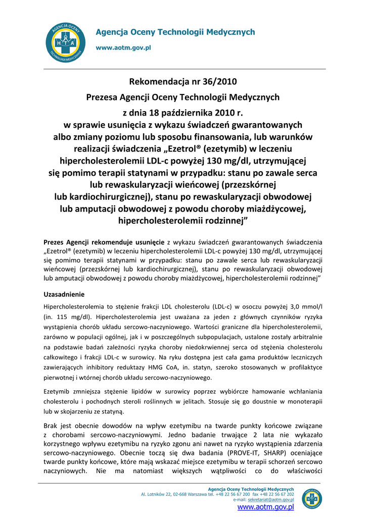 Rekomendacja nr 36/2010 Prezesa Agencji Oceny Technologii