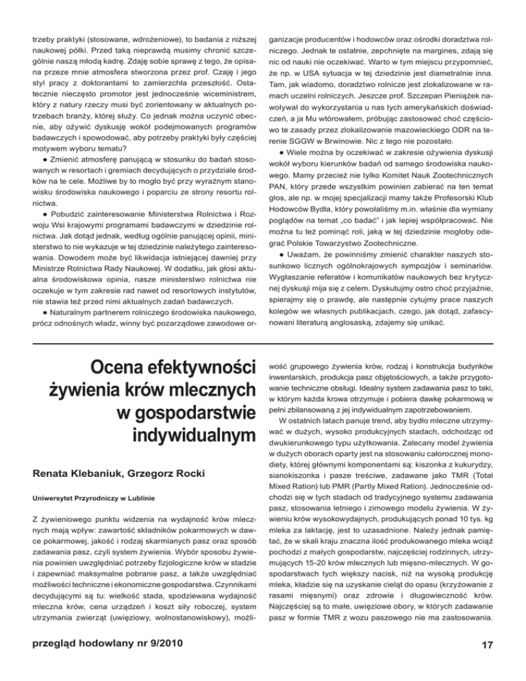 trzeby praktyki (stosowane, wdrożeniowe), to badania z niższej naukowej półki. Przed taką nieprawdą musimy chronić szczególnie naszą młodą kadrę. Zdaję sobie sprawę z tego, że opisana przeze mnie atmosfera stworzona przez prof. Czaję i jego styl pracy z doktorantami to zamierzchła przeszłość. Ostatecznie nieczęsto promotor jest jednocześnie wiceministrem, który z natury rzeczy musi być zorientowany w aktualnych potrzebach branży, której służy. Co jednak można uczynić obecnie, aby ożywić dyskusję wokół podejmowanych programów badawczych i spowodować, aby potrzeby praktyki były częściej motywem wyboru tematu? ● Zmienić atmosferę panującą w stosunku do badań stosowanych w resortach i gremiach decydujących o przydziale środków na te cele. Możliwe by to mogło być przy wyraźnym stanowisku środowiska naukowego i poparciu ze strony resortu rolnictwa. ● Pobudzić zainteresowanie Ministerstwa Rolnictwa i Rozwoju Wsi krajowymi programami badawczymi w dziedzinie rolnictwa. Jak dotąd jednak, według ogólnie panującej opinii, ministerstwo to nie wykazuje w tej dziedzinie należytego zainteresowania. Dowodem może być likwidacja istniejącej dawniej przy Ministrze Rolnictwa Rady Naukowej. W dodatku, jak głosi aktualna środowiskowa opinia, nasze ministerstwo rolnictwa nie oczekuje w tym zakresie rad nawet od resortowych instytutów, nie stawia też przed nimi aktualnych zadań badawczych. ● Naturalnym partnerem rolniczego środowiska naukowego, prócz odnośnych władz, winny być pozarządowe zawodowe or- Ocena efektywności żywienia krów mlecznych w gospodarstwie indywidualnym Renata Klebaniuk, Grzegorz Rocki Uniwersytet Przyrodniczy w Lublinie Z żywieniowego punktu widzenia na wydajność krów mlecznych mają wpływ: zawartość składników pokarmowych w dawce pokarmowej, jakość i rodzaj skarmianych pasz oraz sposób zadawania pasz, czyli system żywienia. Wybór sposobu żywienia powinien uwzględniać potrzeby fizjologiczne krów w stadzie i zapewniać maksymalne pobranie pasz, a także uwzględniać możliwości techniczne i ekonomiczne gospodarstwa. Czynnikami decydującymi są tu: wielkość stada, spodziewana wydajność mleczna krów, cena urządzeń i koszt siły roboczej, system utrzymania zwierząt (uwięziowy, wolnostanowiskowy), możli- przegląd hodowlany nr 9/2010 ganizacje producentów i hodowców oraz ośrodki doradztwa rolniczego. Jednak te ostatnie, zepchnięte na margines, zdają się nic od nauki nie oczekiwać. Warto w tym miejscu przypomnieć, że np. w USA sytuacja w tej dziedzinie jest diametralnie inna. Tam, jak wiadomo, doradztwo rolnicze jest zlokalizowane w ramach uczelni rolniczych. Jeszcze prof. Szczepan Pieniążek nawoływał do wykorzystania u nas tych amerykańskich doświadczeń, a ja Mu wtórowałem, próbując zastosować choć częściowo te zasady przez zlokalizowanie mazowieckiego ODR na terenie SGGW w Brwinowie. Nic z tego nie pozostało. ● Wiele można by oczekiwać w zakresie ożywienia dyskusji wokół wyboru kierunków badań od samego środowiska naukowego. Mamy przecież nie tylko Komitet Nauk Zootechnicznych PAN, który przede wszystkim powinien zabierać na ten temat głos, ale np. w mojej specjalizacji mamy także Profesorski Klub Hodowców Bydła, który powołaliśmy m.in. właśnie dla wymiany poglądów na temat „co badać” i jak lepiej współpracować. Nie można tu też pominąć roli, jaką w tej dziedzinie mogłoby odegrać Polskie Towarzystwo Zootechniczne. ● Uważam, że powinniśmy zmienić charakter naszych stosunkowo licznych ogólnokrajowych sympozjów i seminariów. Wygłaszanie referatów i komunikatów naukowych bez krytycznej dyskusji mija się z celem. Dyskutujmy ostro choć przyjaźnie, spierajmy się o prawdę, ale następnie cytujmy prace naszych kolegów we własnych publikacjach, czego, jak dotąd, zafascynowani literaturą anglosaską, zdajemy się unikać. wość grupowego żywienia krów, rodzaj i konstrukcja budynków inwentarskich, produkcja pasz objętościowych, a także przygotowanie techniczne obsługi. Idealny system zadawania pasz to taki, w którym każda krowa otrzymuje i pobiera dawkę pokarmową w pełni zbilansowaną z jej indywidualnym zapotrzebowaniem. W ostatnich latach panuje trend, aby bydło mleczne utrzymywać w dużych, wysoko produkcyjnych stadach, odchodząc od dwukierunkowego typu użytkowania. Zalecany model żywienia w dużych oborach oparty jest na stosowaniu całorocznej monodiety, której głównymi komponentami są: kiszonka z kukurydzy, sianokiszonka i pasze treściwe, zadawane jako TMR (Total Mixed Ration) lub PMR (Partly Mixed Ration). Jednocześnie odchodzi się w tych stadach od tradycyjnego systemu zadawania pasz, stosowania letniego i zimowego modelu żywienia. W żywieniu krów wysokowydajnych, produkujących ponad 10 tys. kg mleka za laktację, jest to uzasadnione. Należy jednak pamiętać, że w skali kraju znaczna ilość produkowanego mleka wciąż pochodzi z małych gospodarstw, najczęściej rodzinnych, utrzymujących 15-20 krów mlecznych lub mięsno-mlecznych. W gospodarstwach tych większy nacisk, niż na wysoką produkcję mleka, kładzie się na uzyskanie cieląt do opasu (krzyżowanie z rasami mięsnymi) oraz zdrowie i długowieczność krów. Najczęściej są to małe, uwięziowe obory, w których zadawanie pasz w formie TMR z wozu paszowego nie ma zastosowania. 17 Stosowany jest natomiast tradycyjny, ręczny system zadawania pasz oraz żywienie wynikające z sezonowej podaży pasz w gospodarstwie. W jednym z takich gospodarstw indywidualnych, w województwie lubelskim, przeprowadzono ocenę efektywności żywienia krów mlecznych na przestrzeni roku kalendarzowego, oceniając pobranie pasz, kondycję oraz wydajność i skład mleka krów. Założono, że ilość i jakość pasz pobieranych przez krowy w dawkach pokarmowych pokrywa ich zapotrzebowanie, a wydajność i skład mleka zależą od 