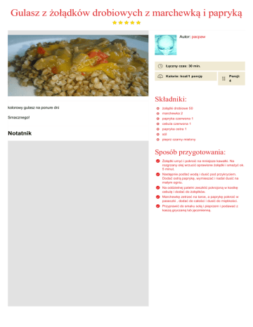 Gulasz z żołądków drobiowych z marchewką i papryką Autor: pacpaw Łączny czas: 30 min. Kalorie: kcal/1 porcję Porcji: 4 Składniki: kolorowy gulasz na ponure dni żołądki drobiowe 50 marchewka 2 Smacznego! papryka czerwona 1 cebula czerwona 1 papryka ostra 1 Notatnik sól pieprz czarny mielony Sposób przygotowania: Żołądki umyć i pokroić na mniejsze kawałki. Na rozgrzany olej wrzucić oprawione żołądki i smażyć ok. 5 minut. Następnie podlać wodą i dusić pod przykryciem. Dodać ostrą paprykę, wymieszać i nadal dusić na małym ogniu. Na oddzielnej patelni zeszklić pokrojoną w kostkę cebulę i dodać do żołądków. Marchewkę zetrzeć na tarce, a paprykę pokroić w paseczki , dodać do całości i dusić do miękkości. Przyprawić do smaku solą i pieprzem i podawać z kaszą gryczaną lub jęczmienną.