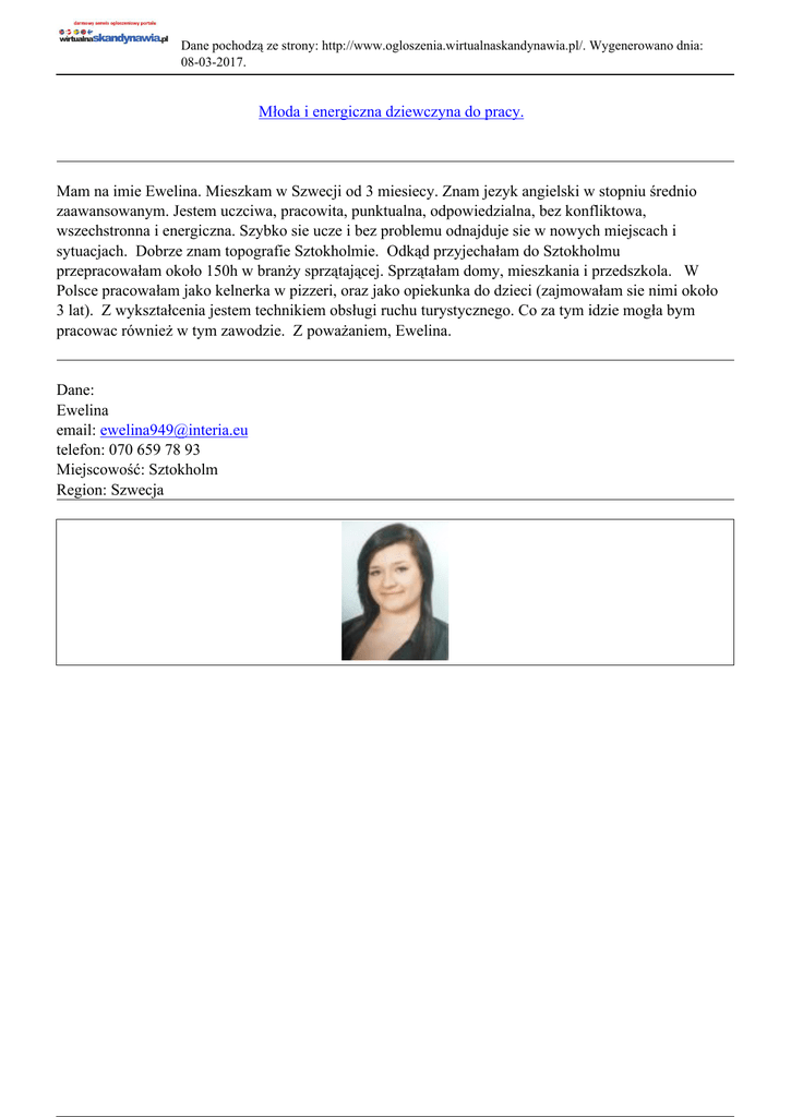 Dane pochodzą ze strony: http://www.ogloszenia.wirtualnaskandynawia.pl/. Wygenerowano dnia: 08-03-2017. Młoda i energiczna dziewczyna do pracy. Mam na imie Ewelina. Mieszkam w Szwecji od 3 miesiecy. Znam jezyk angielski w stopniu średnio zaawansowanym. Jestem uczciwa, pracowita, punktualna, odpowiedzialna, bez konfliktowa, wszechstronna i energiczna. Szybko sie ucze i bez problemu odnajduje sie w nowych miejscach i sytuacjach. Dobrze znam topografie Sztokholmie. Odkąd przyjechałam do Sztokholmu przepracowałam około 150h w branży sprzątającej. Sprzątałam domy, mieszkania i przedszkola. W Polsce pracowałam jako kelnerka w pizzeri, oraz jako opiekunka do dzieci (zajmowałam sie nimi około 3 lat). Z wykształcenia jestem technikiem obsługi ruchu turystycznego. Co za tym idzie mogła bym pracowac również w tym zawodzie. Z poważaniem, Ewelina. Dane: Ewelina email: [email protected] telefon: 070 659 78 93 Miejscowość: Sztokholm Region: Szwecja