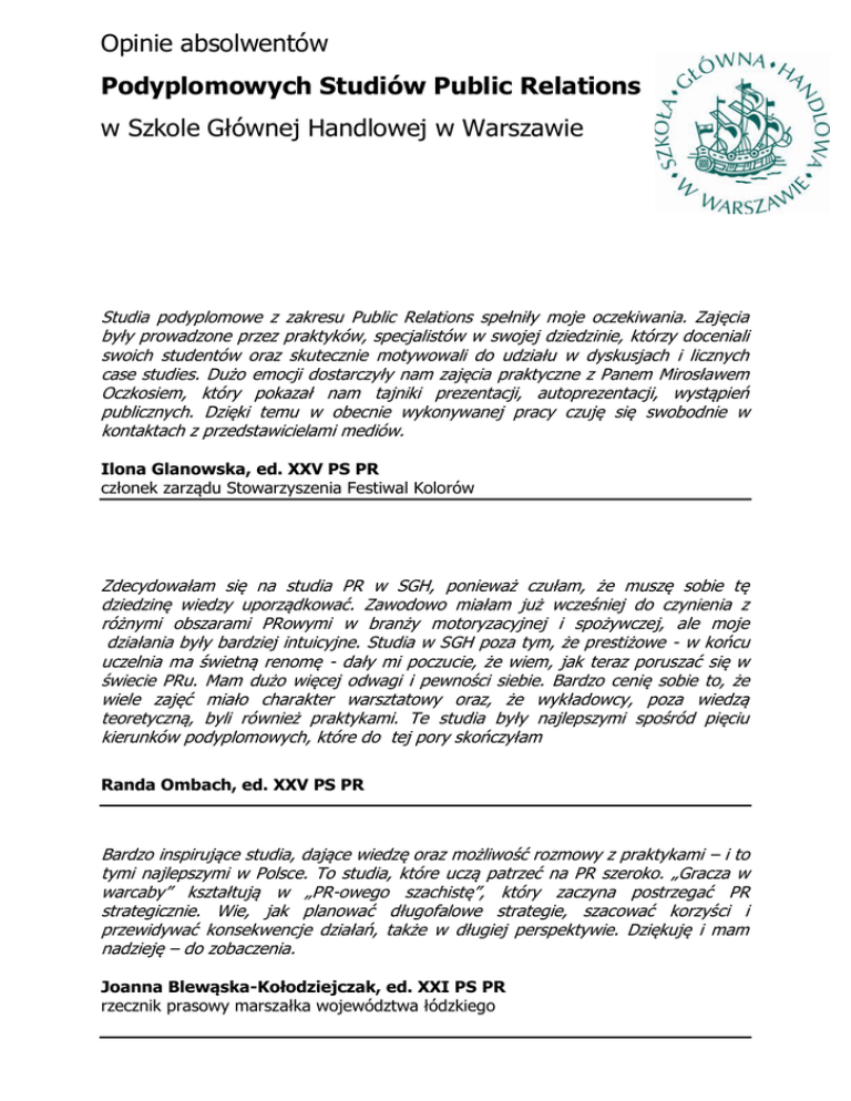 Opinie absolwentów Podyplomowych Studiów Public Relations w Szkole Głównej Handlowej w Warszawie Studia podyplomowe z zakresu Public Relations spełniły moje oczekiwania. Zajęcia były prowadzone przez praktyków, specjalistów w swojej dziedzinie, którzy doceniali swoich studentów oraz skutecznie motywowali do udziału w dyskusjach i licznych case studies. Dużo emocji dostarczyły nam zajęcia praktyczne z Panem Mirosławem Oczkosiem, który pokazał nam tajniki prezentacji, autoprezentacji, wystąpień publicznych. Dzięki temu w obecnie wykonywanej pracy czuję się swobodnie w kontaktach z przedstawicielami mediów. Ilona Glanowska, ed. XXV PS PR członek zarządu Stowarzyszenia Festiwal Kolorów Zdecydowałam się na studia PR w SGH, ponieważ czułam, że muszę sobie tę dziedzinę wiedzy uporządkować. Zawodowo miałam już wcześniej do czynienia z różnymi obszarami PRowymi w branży motoryzacyjnej i spożywczej, ale moje działania były bardziej intuicyjne. Studia w SGH poza tym, że prestiżowe - w końcu uczelnia ma świetną renomę - dały mi poczucie, że wiem, jak teraz poruszać się w świecie PRu. Mam dużo więcej odwagi i pewności siebie. Bardzo cenię sobie to, że wiele zajęć miało charakter warsztatowy oraz, że wykładowcy, poza wiedzą teoretyczną, byli również praktykami. Te studia były najlepszymi spośród pięciu kierunków podyplomowych, które do tej pory skończyłam Randa Ombach, ed. XXV PS PR Bardzo inspirujące studia, dające wiedzę oraz możliwość rozmowy z praktykami – i to tymi najlepszymi w Polsce. To studia, które uczą patrzeć na PR szeroko. „Gracza w warcaby” kształtują w „PR-owego szachistę”, który zaczyna postrzegać PR strategicznie. Wie, jak planować długofalowe strategie, szacować korzyści i przewidywać konsekwencje działań, także w długiej perspektywie. Dziękuję i mam nadzieję – do zobaczenia. Joanna Blewąska-Kołodziejczak, ed. XXI PS PR rzecznik prasowy marszałka województwa łódzkiego Najlepiej zorganizowane studia podyplomowe w jakich uczestniczyłam. Oprócz teorii dużo wiedzy praktycznej - wykładowcy to także czynni PRowcy Organizator słuchał głosu studentów Ogólnie: bardzo dobrze wydane pieniądze! Irena Zakrzewska, ed. XIV PS PR Kierujący Zespołem Komunikacji Internetowej, Kredyt Bank Podyplomowe Studium PR na SGH, to nie tylko wiedza i renoma uczelni, ale przede wszystkim, świetna atmosfera. Te dwa semestry spędzone na SGH dały mi możliwość znalezienia pracy w wymarzonej przeze mnie branży PR oraz umożliwiły poznanie fantastycznych nowych znajomych, z którymi wciąż utrzymuję kontakt. Karolina Bukała, ed. XVI PS PR Account Coordinator Ogilvy Public Relations Worldwide Bardzo polecam Podyplomowe Studia PR na SGH. Różnorodny program, doświadczeni wykładowcy i rozbudowany materiał, adekwatny do dynamicznie zmieniającej się pr-owskiej rzeczywistości to tylko niektore zalety tych studiów. Bardzo dobrze zorganizowane i...wymagające, co jest według mnie ogromną zaletą, ponieważ buduje prestiż uczelni i jej studentów. Osoby, które naprawdę chcą poznać PR, rozwijać już posiadaną wiedzę i poszerzyć swoje horyzonty zdecydowanie znajdą tu to, czego szukają. Dziękuję wszystkim za bardzo ciekawy i udany wspólny rok studiów. Pozdrawiam serdecznie. Ewelina Zych, ed. XXI PS PR MEDall Productions Podobało mi się, że w gronie wykładowców było sporo praktyków. Zajęcia w większości ciekawe i przydatne, często z elementami warsztatowymi. Poza tym sympatyczni ludzie na roku i dobra atmosfera. Od strony organizacyjnej również oceniam studia pozytywnie. Rafał Przech, ed. X PS PR Oddział Komunikacji Społecznej Lubelskiego Urzędu Wojewódzkiego w Lublinie Podyplomowe PR na SGH to kolejne cenne doświadczenie w życiu. Praktyczne, nie teoretyczne podejście do tematyki public relations. Świetni wykładowcy, ciekawe zajęcia. Elastyczne traktowanie tematyki zajęć. Najważniejsze jednak, to poznanie fajnych, ciekawych ludzi z różnych środkowisk. Do dziś z niektórymi utrzymujemy stały kontakt. Najbardziej w pamięci pozostały mi zajęcia i nagrania w Polskim Radiu, wykłady o mediach i dyplomacji, o postępowaniu w sytuacjach kryzysowych, szkolenie z prezentacji własnej osoby przed kamerą i sposobu wypowiadania się oraz wiele innych. Sporo z tych rzeczy do dziś przydaje mi się w codziennej pracy. Polecam każdemu, kto ma ochotę poznać głębiej tajniki słynnego PR-u :). Magdalena Marszałkowska, ed. XII PSPR Dyrektor, Malbork Welcome Center W roku akademickim 2007/2008 miałam przyjemność uczestniczyć w zajęciach realizowanych w ramach Podyplomowego Studium Public Relations na SGH. Uważam, że program oraz zakres poruszanych tematów z obszaru szeroko pojętej komunikacji jest najciekawszy spośród oferowanych na rynku. Na szczególną uwagę zasługuje praktyczny charakter zajęć, podczas których na konkretnych przykładach omawia się zagadnienia z obszaru PR. W ten sposób zdobyta wiedza w łatwy sposób zostaje wykorzystywana w późniejszej pracy. Intensywność zajęć oraz doświadczenie kadry nauczającej w skład, której wchodzą osoby mające codzienny kontakt z PR stanowią również mocną stronę zajęć. Z pełną odpowiedzialnością polecam Podyplomowe Studium PR wszystkim tym, którzy pragną poszerzyć swoją wiedzę z zakresu PR oraz dowiedzieć się jak skutecznie prowadzić działania komunikacyjne. Katarzyna Matuszewska-Jagiełło, ed. XII PS PR Konsultant PR, Agencja JUSTA PR Do dziś naukę na Podyplomowych Studiach PR w SGH wspominam bardzo miło. Program i wyważenie proporcji między teorią i praktyką bardzo dobre. Wykładowcy na zajęciach zróżnicowani, zawsze dobrze przygotowani, wykład lub ćwiczenia uzupełnione materiałem w postaci konspektu, prezentacji, zalecanych lektur. Do książek, które otrzymałam podczas studiów zaglądam do dziś. Wykładowcy profesjonalni i