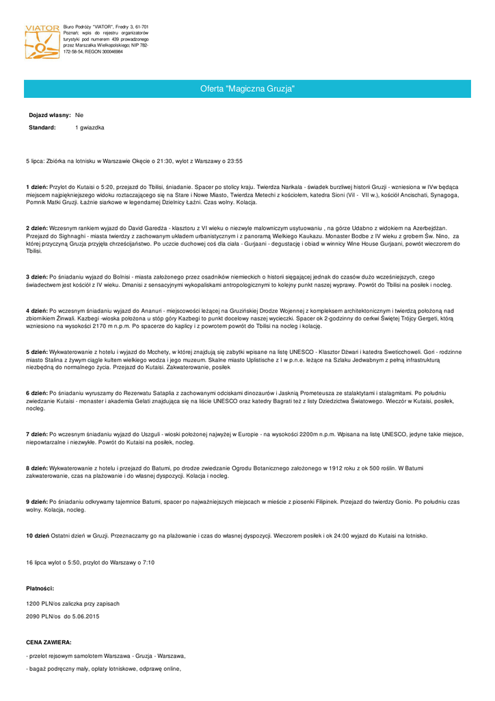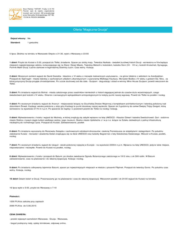 Biuro Podróży "VIATOR", Fredry 3, 61-701 Poznań; wpis do rejestru organizatorów turystyki pod numerem 439 prowadzonego przez Marszałka Wielkopolskiego; NIP 782172-58-54, REGON 300046984 Oferta "Magiczna Gruzja" Dojazd własny: Nie Standard: 1 gwiazdka 5 lipca: Zbiórka na lotnisku w Warszawie Okęcie o 21:30, wylot z Warszawy o 23:55 1 dzień: Przylot do Kutaisi o 5:20, przejazd do Tbilisi, śniadanie. Spacer po stolicy kraju. Twierdza Narikala - świadek burzliwej historii Gruzji - wzniesiona w IVw będąca miejscem najpiękniejszego widoku roztaczającego się na Stare i Nowe Miasto, Twierdza Metechi z kościołem, katedra Sioni (ViI - VII w.), kościół Ancischati, Synagoga, Pomnik Matki Gruzji. Łaźnie siarkowe w legendarnej Dzielnicy Łaźni. Czas wolny. Kolacja. 2 dzień: Wczesnym rankiem wyjazd do David Garedża - klasztoru z VI wieku o niezwyle malowniczym usytuowaniu , na górze Udabno z widokiem na Azerbejdżan. Przejazd do Sighnaghi - miasta twierdzy z zachowanym układem urbanistycznym i z panoramą Wielkiego Kaukazu. Monaster Bodbe z IV wieku z grobem Św. Nino, za której przyczyną Gruzja przyjęła chrześcijaństwo. Po uczcie duchowej coś dla ciała - Gurjaani - degustację i obiad w winnicy Wine House Gurjaani, powrót wieczorem do Tbilisi. 3 dzień: Po śniadaniu wyjazd do Bolnisi - miasta założonego przez osadników niemieckich o historii sięgającej jednak do czasów dużo wcześniejszych, czego świadectwem jest kościół z IV wieku. Dmanisi z sensacyjnymi wykopaliskami antropologicznymi to kolejny punkt naszej wyprawy. Powrót do Tbilisi na posiłek i nocleg. 4 dzień: Po wczesnym śniadaniu wyjazd do Ananuri - miejscowości leżącej na Gruzińskiej Drodze Wojennej z kompleksem architektonicznym i twierdzą położoną nad zbiornikiem Żinwali. Kazbegi -wioska położona u stóp góry Kazbegi to punkt docelowy naszej wycieczki. Spacer ok 2-godzinny do cerkwi Świętej Trójcy Gergeti, którą wzniesiono na wysokości 2170 m n.p.m. Po spacerze do kaplicy i z powrotem powrót do Tbilisi na nocleg i kolację. 5 dzień: Wykwaterowanie z hotelu i wyjazd do Mcchety, w której znajdują się zabytki wpisane na listę UNESCO - Klasztor Dżwari i katedra Sweticchoweli. Gori - rodzinne miasto Stalina z żywym ciągle kultem wielkiego wodza i jego muzeum. Skalne miasto Uplistische z I w p.n.e. leżące na Szlaku Jedwabnym z pełną infrastrukturą niezbędną do normalnego życia. Przejazd do Kutaisi. Zakwaterowanie, posiłek 6 dzień: Po śniadaniu wyruszamy do Rezerwatu Sataplia z zachowanymi odciskami dinozaurów i Jasknią Prometeusza ze stalaktytami i stalagmitami. Po południu zwiedzanie Kutaisi - monaster i akademia Gelati znajdująca się na liście UNESCO oraz katedry Bagrati też z listy Dziedzictwa Światowego. Wieczór w Kutaisi, posiłek, nocleg. 7 dzień: Po wczesnym śniadaniu wyjazd do Uszguli - wioski położonej najwyżej w Europie - na wysokości 2200m n.p.m. Wpisana na listę UNESCO, jedyne takie miejsce, niepowtarzalne i niezwykłe. Powrót do Kutaisi na posiłek, nocleg. 8 dzień: Wykwaterowanie z hotelu i przejazd do Batumi, po drodze zwiedzanie Ogrodu Botanicznego założonego w 1912 roku z ok 500 roślin. W Batumi zakwaterowanie, czas na plażowanie i do własnej dyspozycji. Kolacja i nocleg. 9 dzień: Po śniadaniu odkrywamy tajemnice Batumi, spacer po najważniejszych miejscach w mieście z piosenki Filipinek. Przejazd do twierdzy Gonio. Po południu czas wolny. Kolacja, nocleg. 10 dzień Ostatni dzień w Gruzji. Przeznaczamy go na plażowanie i czas do własnej dyspozycji. Wieczorem posiłek i ok 24:00 wyjazd do Kutaisi na lotnisko. 16 lipca wylot o 5:50, przylot do Warszawy o 7:10 Płatności: 1200 PLN/os zaliczka przy zapisach 2090 PLN/os do 5.06.2015 CENA ZAWIERA: - przelot rejsowym samolotem Warszawa - Gruzja - Warszawa, - bagaż podręczny mały, opłaty lotniskowe, odprawę online, - 9 noclegów w standardowych hotelach w pokojach 2-os z łazienkami, WC, - wyżywienie wg programu (2 posiłki dziennie), wieczór gruziński, - transport autokarem po Gruzji, - opiekę pilota - przewodnika, - ubezpieczenie KL, NNW, bagaż CENA NIE ZAWIERA: - biletów wstępu, - bagażu rejestrowanego do 32 kg - 294 PLN/ w obie strony Do wjazdu na teren Gruzji wystarczy dowód osobisty. Bilety lotnicze są imienne i nie podlegają zwrotowi. Wyjazd odbędzie się przy minimum 20-osobowej grupie. Noclegi Hotel ( gwiazdek) Zakwaterowanie w pokojach 2 osobowych z łazienką i WC. Miasta Kutaisi Kraje Gruzja Terminy Hotel z HB Terminy (w dół) Opcje (w prawo) Liczba noclegów: 9 Wyżywienie: - Śniadanie i obiadokolacja (0,00 zł) Cena katalogowa (os. dorosła): 3 290,00 zł od: 05-07-2015 do: 16-07-2015 Cena katalogowa (dziecko): 0,00 zł Dodatki obowiązkowe opcjonalne - Duży bagaż do 32 kg (294,00 zł) Rozkład Nazwa przystanku Skąd Godzina wyjazdu Cena Chopin Warszawa 23:55 0,00 zł * - w dzień poprzedzający termin rozpoczęcia wyjazdu