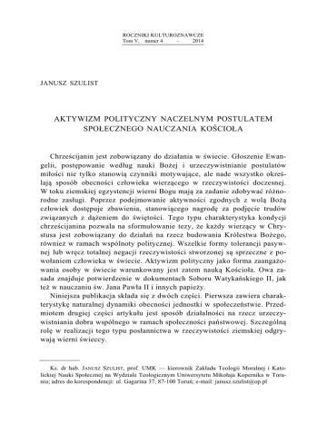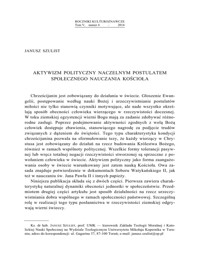 ROCZNIKI KULTUROZNAWCZE Tom V, numer 4 – 2014 JANUSZ SZULIST * AKTYWIZM POLITYCZNY NACZELNYM POSTULATEM SPO|ECZNEGO NAUCZANIA KO$CIO|A Chrze>cijanin jest zobowi^zany do dzia\ania w >wiecie. G\oszenie Ewangelii, post'powanie wed\ug nauki Bo<ej i urzeczywistnianie postulatów mi\o>ci nie tylko stanowi^ czynniki motywuj^ce, ale nade wszystko okre>laj^ sposób obecno>ci cz\owieka wierz^cego w rzeczywisto>ci doczesnej. W toku ziemskiej egzystencji wierni Bogu maj^ za zadanie zdobywa} ró<norodne zas\ugi. Poprzez podejmowanie aktywno>ci zgodnych z wol^ Bo<^ cz\owiek dost'puje zbawienia, stanowi^cego nagrod' za podj'cie trudów zwi^zanych z d^<eniem do >wi'to>ci. Tego typu charakterystyka kondycji chrze>cijanina pozwala na sformu\owanie tezy, <e ka<dy wierz^cy w Chrystusa jest zobowi^zany do dzia\a` na rzecz budowania Królestwa Bo<ego, równie< w ramach wspólnoty politycznej. Wszelkie formy tolerancji pasywnej lub wr'cz totalnej negacji rzeczywisto>ci stworzonej s^ sprzeczne z powo\aniem cz\owieka w >wiecie. Aktywizm polityczny jako forma zaanga<owania osoby w >wiecie warunkowany jest zatem nauk^ Ko>cio\a. Owa zasada znajduje potwierdzenie w dokumentach Soboru Watyka`skiego II, jak te< w nauczaniu >w. Jana Paw\a II i innych papie<y. Niniejsza publikacja sk\ada si' z dwóch cz'>ci. Pierwsza zawiera charakterystyk' naturalnej dynamiki obecno>ci jednostki w spo\ecze`stwie. Przedmiotem drugiej cz'>ci artyku\u jest sposób dzia\alno>ci na rzecz urzeczywistniania dobra wspólnego w ramach spo\eczno>ci pa`stwowej. Szczególn^ rol' w realizacji tego typu pos\annictwa w rzeczywisto>ci ziemskiej odgrywaj^ wierni >wieccy. Ks. dr hab. JANUSZ SZULIST, prof. UMK — kierownik Zak\adu Teologii Moralnej i Katolickiej Nauki Spo\ecznej na Wydziale Teologicznym Uniwersytetu Miko\aja Kopernika w Toruniu; adres do korespondencji: ul. Gagarina 37, 87-100 Toru`; e-mail: [email protected] 20 JANUSZ SZULIST 1. NATURALNA DYNAMIKA ISTNIENIA OSOBY LUDZKIEJ W SPO|ECZE~STWIE Zgodnie z nauk^ Soboru Watyka`skiego II, wyra<on^ w Konstytucji duszpasterskiej o Ko>ciele w >wiecie wspó\czesnym Gaudium et spes, aktywno>} cz\owieka w >wiecie jest ukonstytuowana ju< w dziele stworzenia. Istotne znaczenie w tej kwestii ma nakaz, dotycz^cy pierwszych ludzi: „Uczy`my cz\owieka na Nasz obraz, podobnego Nam. Niech panuje nad rybami morskimi, nad ptactwem powietrznym, nad byd\em, nad ziemi^ i nad wszystkimi zwierz'tami pe\zaj^cymi na ziemi” (Rdz 1,26). Z podobie`stwa przedstawicieli rodzaju ludzkiego do Boga wynika przypisany im nakaz porz^dkowania ziemi i czynienia jej sobie poddan^. Uzasadnieniem aktywnej dzia\alno>ci cz\owieka w >wiecie jest wi'c dzie\o stwórcze Boskiego Ojca, który ukszta\towa\ >rodowisko godne cz\owieka i gwarantuj^ce trwanie spo\eczno>ciom ludzkim1. W nauce Jezusa Chrystusa mamy kontynuacj' starotestamentalnych wezwa` do aktywnej obecno>ci cz\owieka w >wiecie doczesnym 2. Analizuj^c tre>} listów >w. Paw\a (por. np. Rz 5,18-21; 1 Kor 15,56-57), mo<na sformu\owa} wniosek, <e w Chrystusie Bóg na nowo pojedna\ >wiat ze sob^. Owa jedno>} jest konieczna dla komunikowania Bo<ych darów, warunkuj^cych <ycie nadprzyrodzone. Czynnik Boskiej egzystencji jawi si' jako niezb'dny do tego, by cz\owiek móg\ zdobywa} nowe przymioty, by – jak naucza Aposto\ Narodów – stawa\ si' nowym cz\owiekiem (por. Kol 3,10)3. Nowa jako>} bytowania ludzi znajduje prze\o<enie w coraz g\'bszym poznawaniu Boga, co w nast'puj^cy sposób okre>laj^ autorzy Katechizmu Kocioa Katolickiego: „W\adze cz\owieka uzdalniaj^ go do poznania istnienia osobowego Boga. Aby jednak cz\owiek móg\ zbli<y} si' do Niego, Bóg zechcia\ objawi} mu si' i udzieli} \aski, by móg\ przyj^} to objawienie w wierze” 4. W\adze poznawcze cz\owieka pozwalaj^ odkrywa} tajniki natury osobowej, 1 Por. Konstytucja duszpasterska o Ko>ciele w >wiecie wspó\czesnym Gaudium et spes. W: Sobór Watykaski II. Konstytucje. Dekrety. Deklaracje. Pozna`: Pallottinum 2002 nr 33 (cyt. dalej: KDK); zob. równie<: M. M r ó z. Czowiek w dynamizmie cnoty. Aktualno aretologii w. Tomasza z Akwinu w wietle pytania o podstawy moralnoci chrzecijaskiej. Toru`: Wy<sze Seminarium Duchowne 2001 s. 98 n. 2 Zob. J. K r ó l i k o w s k i. Znaczenie polityczne Ewangelii inspiracj dla politycznego zaangaowania teologii. „Studia Teologiczne i Humanistyczne” 1,1 : 2011 s. 27. 3 Por. Papieska Rada „Iustitia et Pax”. Kompendium nauki spoecznej Kocioa. Kielce: Jedno>} 2005 nr 121 (cyt. dalej: KNSK). 4 Katechizm Kocioa Katolickiego. Pozna`: Pallottinum 2009 nr 35 (cyt. dalej: KKK). AKTYWIZM POLITYCZNY POSTULATEM SPO|ECZNEGO NAUCZANIA KO$CIO|A 21 która ukierunkowana jest na realizacj' powo\ania danego przez Boga. Wojciech Cichosz, analizuj^c zagadnienie wychowania w kontek>cie pedagogii wiary, wskazuje na fakt, <e niezbywalnym elementem istoty powo\ania jest rozwijanie mi\o>ci, której nieodzowny charakter dla cz\owieka pozostaj^cego w permanentnej relacji z Bogiem nast'puj^co przedstawi\ >w. Jan Ewangelista: „Umi\owani, mi\ujmy si' wzajemnie, poniewa< mi\o>} jest z Boga, a ka<dy, kto mi\uje, narodzi\ si' z Boga i zna Boga” (1 J 4,7). Mi\osne zjednoczenie ze Stwórc^ prowadzi cz\owieka do odkrycia warto>ci nieprzemijaj^cych, które pierwotnie i w sposób wzorcowy znajduj^ si' w Bogu. Odkrywanie powo\ania do mi\o>ci, po\^czone z na>ladowaniem Chrystusa, skutkuje wzrastaniem osoby ludzkiej w sferze dóbr duchowych, wobec których materia odgrywa rol' pomocnicz^ 5. Element mi\o>ci w realiach wspólnoty spo\ecznej przyjmuje posta} mi\osierdzia. Autorzy Kompendium nauki spoecznej Kocioa wskazuj^ w tym kontek>cie na postulat urzeczywistniania mi\o>ci, jak^ jest sam Bóg. Innymi s\owy, zjednoczenie ze Stwórc^ warunkuje czyny bezinteresowne, <yczliwe i solidarne, maj^ce na celu wy\^cznie zagwarantowanie ochrony osoby w aspekcie jej integralno>ci. Realizacja mi\o>ci Bo<ej jest te< potwierdzaniem obecno>ci Boga w rzeczywisto>ci doczesnej. Owa pe\na troski obecno>} Stwórcy ma charakter uprzedni w