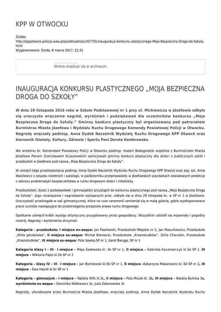 KPP W OTWOCKU Źródło: http://kppotwock.policja.waw.pl/po/aktualnosci/67750,Inauguracja-konkursu-plastycznego-Moja-Bezpieczna-Droga-do-Szkoly. html Wygenerowano: Środa, 8 marca 2017, 22:31 Strona znajduje się w archiwum. INAUGURACJA KONKURSU PLASTYCZNEGO „MOJA BEZPIECZNA DROGA DO SZKOŁY” W dniu 29 listopada 2016 roku w Szkole Podstawowej nr 1 przy ul. Mickiewicza w Józefowie odbyło się uroczyste wręczenie nagród, wyróżnień i podziękowań dla uczestników konkursu „Moja Bezpieczna Droga do Szkoły.” Gminny konkurs plastyczny był organizowany pod patronatem Burmistrza Miasta Józefowa i Wydziału Ruchu Drogowego Komendy Powiatowej Policji w Otwocku. Nagrody wręczały podinsp. Anna Dydek Naczelnik Wydziały Ruchu Drogowego KPP Otwock oraz kierownik Oświaty, Kultury, Zdrowia i Sportu Pani Dorota Kembrowska. We wrześniu br. Komendant Powiatowy Policji w Otwocku podinsp. Hubert Białogrodzki wspólnie z Burmistrzem Miasta Józefowa Panem Stanisławem Kruszewskim zainicjowali gminny konkurs plastyczny dla dzieci z publicznych szkół i przedszkoli w Józefowie pod nazwą „Moja Bezpieczna Droga do Szkoły”. W ramach tego przedsięwzięcia podinsp. Anna Dydek Naczelnik Wydziału Ruchu Drogowego KPP Otwock oraz asp. szt. Anna Wasilewicz z zespołu nieletnich i patologii, w październiku przeprowadziły w józefowskich placówkach oświatowych prelekcje z zakresu problematyki bezpieczeństwa w ruchu drogowym dzieci i młodzieży. Przedszkolaki, dzieci z podstawówek i gimnazjaliści przystąpili do konkursu plastycznego pod nazwą „Moja Bezpieczna Droga do Szkoły”. Jego rozwiązanie i nagrodzenie najlepszych prac, odbyło się w dniu 29 listopada br. w SP nr 1 w Józefowie. Uroczystość przebiegała w sali gimnastycznej, która na czas ceremonii zamieniał się w małą galerię, gdzie wyeksponowano prace uczniów nawiązujące do przestrzegania przepisów prawa ruchu drogowego. Spotkanie uświęcił krótki występ artystyczny przygotowany przez gospodarzy. Wszystkim udzielił się wspaniały i pogodny nastrój. Nagrody i wyróżnienia otrzymali: Kategoria – przedszkola: I miejsce ex-aequo: Jan Pawłowski, Przedszkole Miejskie nr 2, Jan Mazurkiewicz, Przedszkole „Willa Jakubówka”, II miejsce ex-aequo: Michał Bieniecki, Przedszkole „Krasnoludków”, Zofia Charubin, Przedszkole „Krasnoludków”, III miejsce ex-aequo: Pola Sawka,SP nr 1, Karol Baryga, SP nr 1 Kategoria klasy I – III - I miejsce – Maja Sadowska kl. 3e SP nr 1, II miejsce – Gabriela Kaczmarczyk kl.3e SP 1, III miejsce – Wiktoria Papis kl.2b SP nr 2 Kategoria – klasy IV – VI - I miejsce – Jan Bytniewski kl.5b SP nr 1, II miejsce –Katarzyna Makarewicz kl. 6d SP nr 2, III miejsce – Ewa Hejnik kl.5c SP nr 1 Kategoria – gimnazjum - I miejsce – Natalia Wilk kl.3c, II miejsce – Pola Misiak kl. 3b, III miejsce – Natalia Bylinka 3e, wyróżnienie ex-aequo – Dominika Walkiewicz 3c, Julia Zaborowska 3c Nagrody, ufundowane przez Burmistrza Miasta Józefowa, wręczały podinsp. Anna Dydek Naczelnik Wydziału Ruchu Drogowego Komendy Powiatowej Policji w Otwocku oraz Kierownik Oświaty, Kultury, Zdrowia i Sportu Pani Dorota Kembrowska. Warto wspomnieć, że dzięki tej inicjatywie Urząd Miasta w Józefowie zakupił i przekazał wszystkim dzieciom z przedszkoli publicznych oraz szkół podstawowych (klasy 0-6) kamizelki odblaskowe. Po zajęciach profilatycznych z naszymi policjantami, wszystkie dzieci mają świadomość, że "odblaskowanie" poprawia stan bezpieczeństwa na drogach i jest modne. Wszystkim uczestnikom gminnego konkursu serdecznie gratulujemy. sd konkurs plastyczny Moja Bezpieczna Droga do Szkoły Konkurs plastyczny Moja Bezpieczna Droga do Szkoły Konkurs plastyczny Moja Bezpieczna Droga do Szkoły Konkurs plastyczny Moja Bezpieczna Droga do Szkoły Konkurs plastyczny Moja Bezpieczna Droga do Szkoły Konkurs plastyczny Moja Bezpieczna Droga do Szkoły Konkurs plastyczny Moja Bezpieczna Droga do Szkoły Konkurs plastyczny Moja Bezpieczna Droga do Szkoły Konkurs plastyczny Moja Bezpieczna Droga do Szkoły Konkurs plastyczny Moja Bezpieczna Droga do Szkoły Konkurs plastyczny Moja Bezpieczna Droga do Szkoły Konkurs plastyczny Moja Bezpieczna Droga do Szkoły Konkurs plastyczny Moja Bezpieczna Droga do Szkoły Konkurs plastyczny Moja Bezpieczna Droga do Szkoły Konkurs plastyczny Moja Bezpieczna Droga do Szkoły Ocena: 0/5 (0) Tweetnij