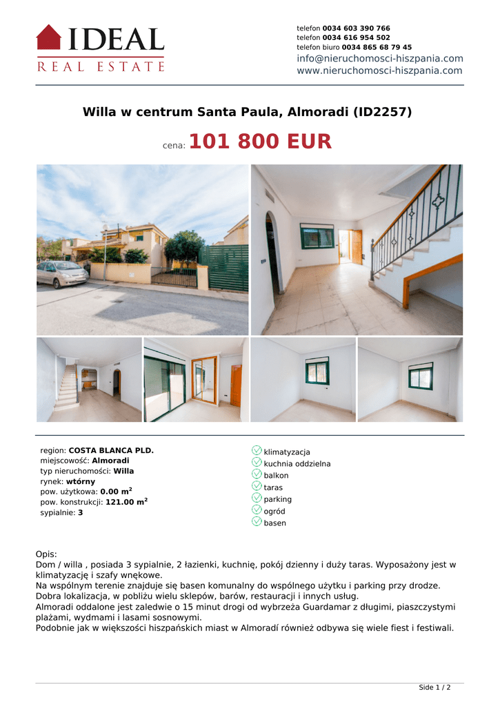 telefon 0034 603 390 766 telefon 0034 616 954 502 telefon biuro 0034 865 68 79 45 [email protected] www.nieruchomosci-hiszpania.com Willa w centrum Santa Paula, Almoradi (ID2257) cena: region: COSTA BLANCA PLD. miejscowość: Almoradi typ nieruchomości: Willa rynek: wtórny pow. użytkowa: 0.00 m2 pow. konstrukcji: 121.00 m2 sypialnie: 3 101 800 EUR klimatyzacja kuchnia oddzielna balkon taras parking ogród basen Opis: Dom / willa , posiada 3 sypialnie, 2 łazienki, kuchnię, pokój dzienny i duży taras. Wyposażony jest w klimatyzację i szafy wnękowe. Na wspólnym terenie znajduje się basen komunalny do wspólnego użytku i parking przy drodze. Dobra lokalizacja, w pobliżu wielu sklepów, barów, restauracji i innych usług. Almoradi oddalone jest zaledwie o 15 minut drogi od wybrzeża Guardamar z długimi, piaszczystymi plażami, wydmami i lasami sosnowymi. Podobnie jak w większości hiszpańskich miast w Almoradí również odbywa się wiele fiest i festiwali. Side 1 / 2 www.nieruchomosci-hiszpania.com Side 2 / 2 Powered by TCPDF (www.tcpdf.org)