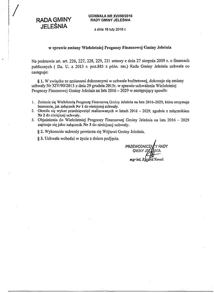 1. Zmienia się Wieloletnią Prognozę Finansową Gminy Jeleśnia na lata 2016-2029, która otrzymuje