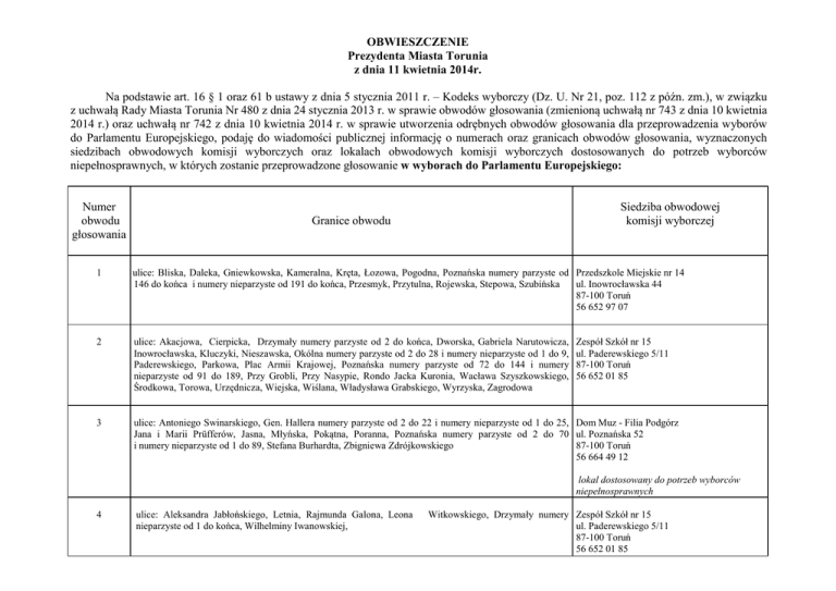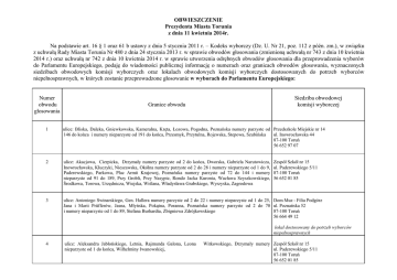 OBWIESZCZENIE Prezydenta Miasta Torunia z dnia 11 kwietnia 2014r. Na podstawie art. 16 § 1 oraz 61 b ustawy z dnia 5 stycznia 2011 r. – Kodeks wyborczy (Dz. U. Nr 21, poz. 112 z późn. zm.), w związku z uchwałą Rady Miasta Torunia Nr 480 z dnia 24 stycznia 2013 r. w sprawie obwodów głosowania (zmienioną uchwałą nr 743 z dnia 10 kwietnia 2014 r.) oraz uchwałą nr 742 z dnia 10 kwietnia 2014 r. w sprawie utworzenia odrębnych obwodów głosowania dla przeprowadzenia wyborów do Parlamentu Europejskiego, podaję do wiadomości publicznej informację o numerach oraz granicach obwodów głosowania, wyznaczonych siedzibach obwodowych komisji wyborczych oraz lokalach obwodowych komisji wyborczych dostosowanych do potrzeb wyborców niepełnosprawnych, w których zostanie przeprowadzone głosowanie w wyborach do Parlamentu Europejskiego: Numer obwodu głosowania Siedziba obwodowej komisji wyborczej Granice obwodu 1 ulice: Bliska, Daleka, Gniewkowska, Kameralna, Kręta, Łozowa, Pogodna, Poznańska numery parzyste od Przedszkole Miejskie nr 14 146 do końca i numery nieparzyste od 191 do końca, Przesmyk, Przytulna, Rojewska, Stepowa, Szubińska ul. Inowrocławska 44 87-100 Toruń 56 652 97 07 2 ulice: Akacjowa, Cierpicka, Drzymały numery parzyste od 2 do końca, Dworska, Gabriela Narutowicza, Inowrocławska, Kluczyki, Nieszawska, Okólna numery parzyste od 2 do 28 i numery nieparzyste od 1 do 9, Paderewskiego, Parkowa, Plac Armii Krajowej, Poznańska numery parzyste od 72 do 144 i numery nieparzyste od 91 do 189, Przy Grobli, Przy Nasypie, Rondo Jacka Kuronia, Wacława Szyszkowskiego, Środkowa, Torowa, Urzędnicza, Wiejska, Wiślana, Władysława Grabskiego, Wyrzyska, Zagrodowa 3 ulice: Antoniego Swinarskiego, Gen. Hallera numery parzyste od 2 do 22 i numery nieparzyste od 1 do 25, Dom Muz - Filia Podgórz Jana i Marii Prüfferów, Jasna, Młyńska, Pokątna, Poranna, Poznańska numery parzyste od 2 do 70 ul. Poznańska 52 i numery nieparzyste od 1 do 89, Stefana Burhardta, Zbigniewa Zdrójkowskiego 87-100 Toruń 56 664 49 12 Zespół Szkół nr 15 ul. Paderewskiego 5/11 87-100 Toruń 56 652 01 85 lokal dostosowany do potrzeb wyborców niepełnosprawnych 4 ulice: Aleksandra Jabłońskiego, Letnia, Rajmunda Galona, Leona nieparzyste od 1 do końca, Wilhelminy Iwanowskiej, Witkowskiego, Drzymały numery Zespół Szkół nr 15 ul. Paderewskiego 5/11 87-100 Toruń 56 652 01 85 5 ulice: Armii Ludowej, Bekasa, Gen. Mikołaja Bołtucia, Ludwika Czachowskiego, Czapli, Gen. Władysława Andersa, Gen. Michała Tokarzewskiego – Karaszewicza, Kormorana, Gen. Tadeusza Kutrzeby, Lilii Wodnych, Łączna, Nenufarów, Okólna numery parzyste od 30 do 124 i numery nieparzyste od 11 do 119, Gen. Leopolda Okulickiego, Perkoza, Pstrowskiego, Puchacza, Stanisława Sędziaka, Melanii Sinorackiej, Sitowia, Sowia, Szuwarów, Tataraków, Trzcinowa, Zimorodka Zespół Szkół nr 14 ul. Gen. Hallera 79 87-100 Toruń 56 652 05 39 6 ulice: Biała, Błękitna, Dybowska, Gen. Hallera numery parzyste od 24 do 80 i numery nieparzyste od 27 do 79, Gen. Woyczyńskiego numery parzyste od 2 do 8 i numery nieparzyste od 1 do 15, Gerwazego, Idzikowskiego, Kniaziewicza numery parzyste od 2 do końca, Kępa Bazarowa, Kujawska, Majdany, Okrzei, Podgórska, Skryta, Srebrna, Tęczowa, Zielona, Złota Zespół Szkół nr 14 ul. Gen. Hallera 79 87-100 Toruń 56 652 05 39 7 ulice: Antoniego Bagińskiego, Brązowa, Zdzisława Dandelskiego, Franciszka Ratajczaka, Gen. Hallera numery parzyste i nieparzyste od 81 do końca, Gen. Woyczyńskiego numery parzyste od 10 do końca i numery nieparzyste od 17 do końca, Jana Karnowskiego, Kniaziewicza numery nieparzyste od 1 do końca, Konduktorska, Ks. J. Domachowskiego, Licealna, Łódzka numery parzyste od 2 do 124 i numery nieparzyste od 1 do 75, mjr. Wacława Kryńskiego, Okopowa, Plebiscytowa, Powstańców Śląskich, Powstańców Wielkopolskich, Radiowa, Rondo marszałka Ferdynanda Focha, Sygnałowa, Św. Wojciecha, Trakcyjna, W. Hulewicza, W. Korfantego, Władysława Balewskiego, Włocławska numery parzyste od 2 do 156 i numery nieparzyste 5 oraz od 11 do 157, Zwrotnicza Zespół Szkół nr 14 ul. Gen. Hallera 79 87-100 Toruń 56 652 05 39 8 ulice: Agatowa, Aleksandrowska, Ametystowa, Artyleryjska, Bociana, Borowikowa, Brylantowa, Bursztynowa, Ciechocińska, Czerniewicka, Diamentowa, Gen. J. Dwernickiego, Gen. Stefana GrotaRoweckiego, Grzybowa, Husarska, Jacka Soplicy, Jaspisowa, Jeżyka, Kosa, Kościelna, Kukułki, Kuropatwy, Łódzka numery nieparzyste od 77 do 109, Majora Henryka Dobrzańskiego-Hubala, Gen. Tadeusza Komorowskiego – Bora, Okólna numery parzyste od 126 do końca i numery nieparzyste od 121 do końca, Pana Tadeusza, Perłowa, Pułkownika Władysława BelinyPrażmowskiego, Rubinowa, Stara Droga, Stawki Południowe, Strzałowa, Szmaragdowa, Telimeny, Topazowa, Turkusowa, Włocławska numery nieparzyste 1, 3, 7, 9, Zimowa Dom Muz – Filia Rudak ul. Okólna 169 87-100 Toruń 56 654 84 56 lokal dostosowany do potrzeb wyborców niepełnosprawnych 9 ulice: Andrzeja Kmicica, Basieńki, Gliniecka, Golubska, Jana Skrzetuskiego, Lipnowska, Oleńki, Szkoła Podstawowa nr 17 Olęderska, Osadnicza, Otłoczyńska, Pana Wołodyjowskiego, Podbipięty, Rudacka, Rypińska, Służewska, ul. Rudacka 26-32 87-100 Toruń Zagłoby 56 654 72 42 10 ulice: Bratnia, Cienista, Familijna, Gajowa, Iglasta, Kolejowa, Łódzka numery parzyste od 244 do końca i numery nieparzyste od 177 do końca, Mała, Matysiaków, Miodowa, Nasza, Przy Torze, Pszczelna, Solankowa, Spacerowa, Radosna, Relaksowa, Romantyczna, Ustronna, Wiśniowa, Włocławska numery parzyste i nieparzyste od 158 do końca, Wypoczynkowa, Zdrojowa, Zygfryda Gardzielewskiego Zespół Szkół nr 34 ul. Włocławska 237/239 87-100 Toruń 56 622 92 62 lokal dostosowany do potrzeb wyborców niepełnosprawnych 11 12 ulice: Alladyna, Balladyny, Dożynkowa, Droga Łąkowa, Dyngusowa, Fantazyjna, Gaikowa, Goplany, Gościnna, Gwiaździs