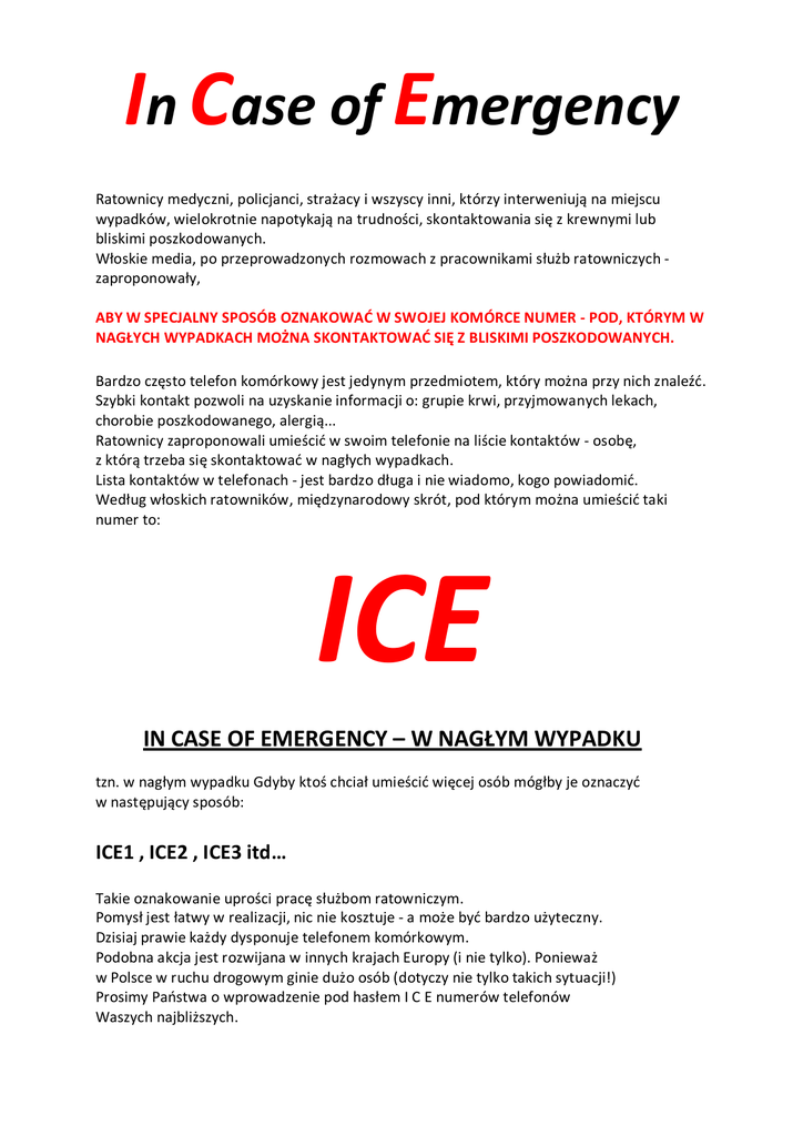 In Case of Emergency Ratownicy medyczni, policjanci, strażacy i wszyscy inni, którzy interweniują na miejscu wypadków, wielokrotnie napotykają na trudności, skontaktowania się z krewnymi lub bliskimi poszkodowanych. Włoskie media, po przeprowadzonych rozmowach z pracownikami służb ratowniczych zaproponowały, ABY W SPECJALNY SPOSÓB OZNAKOWAĆ W SWOJEJ KOMÓRCE NUMER - POD, KTÓRYM W NAGŁYCH WYPADKACH MOŻNA SKONTAKTOWAĆ SIĘ Z BLISKIMI POSZKODOWANYCH. Bardzo często telefon komórkowy jest jedynym przedmiotem, który można przy nich znaleźć. Szybki kontakt pozwoli na uzyskanie informacji o: grupie krwi, przyjmowanych lekach, chorobie poszkodowanego, alergią... Ratownicy zaproponowali umieścić w swoim telefonie na liście kontaktów - osobę, z którą trzeba się skontaktować w nagłych wypadkach. Lista kontaktów w telefonach - jest bardzo długa i nie wiadomo, kogo powiadomić. Według włoskich ratowników, międzynarodowy skrót, pod którym można umieścić taki numer to: ICE IN CASE OF EMERGENCY – W NAGŁYM WYPADKU tzn. w nagłym wypadku Gdyby ktoś chciał umieścić więcej osób mógłby je oznaczyć w następujący sposób: ICE1 , ICE2 , ICE3 itd… Takie oznakowanie uprości pracę służbom ratowniczym. Pomysł jest łatwy w realizacji, nic nie kosztuje - a może być bardzo użyteczny. Dzisiaj prawie każdy dysponuje telefonem komórkowym. Podobna akcja jest rozwijana w innych krajach Europy (i nie tylko). Ponieważ w Polsce w ruchu drogowym ginie dużo osób (dotyczy nie tylko takich sytuacji!) Prosimy Państwa o wprowadzenie pod hasłem I C E numerów telefonów Waszych najbliższych.