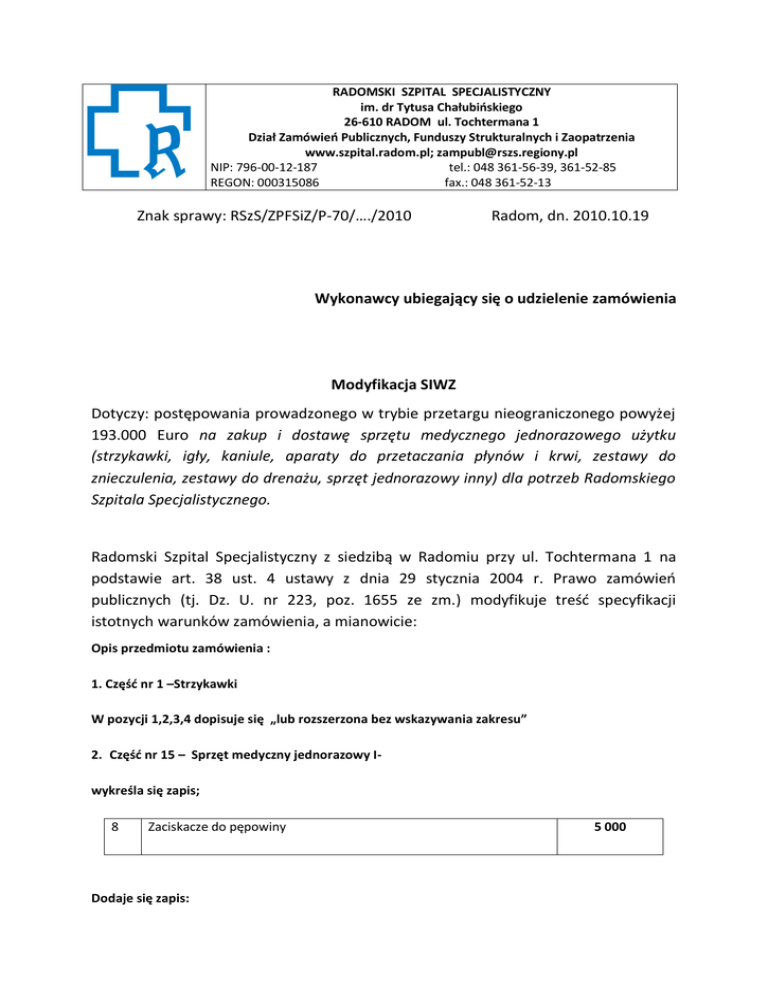RADOMSKI SZPITAL SPECJALISTYCZNY im. dr Tytusa Chałubioskiego 26-610 RADOM ul. Tochtermana 1 Dział Zamówieo Publicznych, Funduszy Strukturalnych i Zaopatrzenia www.szpital.radom.pl; [email protected] NIP: 796-00-12-187 tel.: 048 361-56-39, 361-52-85 REGON: 000315086 fax.: 048 361-52-13 Znak sprawy: RSzS/ZPFSiZ/P-70/…./2010 Radom, dn. 2010.10.19 Wykonawcy ubiegający się o udzielenie zamówienia Modyfikacja SIWZ Dotyczy: postępowania prowadzonego w trybie przetargu nieograniczonego powyżej 193.000 Euro na zakup i dostawę sprzętu medycznego jednorazowego użytku (strzykawki, igły, kaniule, aparaty do przetaczania płynów i krwi, zestawy do znieczulenia, zestawy do drenażu, sprzęt jednorazowy inny) dla potrzeb Radomskiego Szpitala Specjalistycznego. Radomski Szpital Specjalistyczny z siedzibą w Radomiu przy ul. Tochtermana 1 na podstawie art. 38 ust. 4 ustawy z dnia 29 stycznia 2004 r. Prawo zamówieo publicznych (tj. Dz. U. nr 223, poz. 1655 ze zm.) modyfikuje treśd specyfikacji istotnych warunków zamówienia, a mianowicie: Opis przedmiotu zamówienia : 1. Częśd nr 1 –Strzykawki W pozycji 1,2,3,4 dopisuje się „lub rozszerzona bez wskazywania zakresu” 2. Częśd nr 15 – Sprzęt medyczny jednorazowy Iwykreśla się zapis; 8 Zaciskacze do pępowiny Dodaje się zapis: 5 000 6 Pojemnik na odpady medyczne 2,0 litra 6 000 3. Częśd nr 16 – Sprzęt medyczny jednorazowy II Zapis o treści : Cewnik do odśluzowywania górnych dróg oddechowych o gładkiej 5. powierzchni; roz.6,8,10,12,14,16,18,20, dł 40-60 cm ,barwne i numeryczne oznaczenie rozmiaru na cewniku oraz fabrycznie 60 000 nadrukowane oznaczenie rozmiaru na opakowaniu Otrzymuje nowe brzmienie: 5. Cewnik do odśluzowywania górnych dróg oddechowych o gładkiej powierzchni; roz.6,8,10,12,14,16,18,20, dł 40-60 cm , na cewniku tylko barwne oznaczenie rozmiarów i numeryczne na opakowaniu. 60 000 Andrzej Pawluczyk ……………….…………………………………………………………. Dyrektor Radomskiego Szpitala Specjalistycznego Opis przedmiotu zamówienia po zmianach; Częśd nr 1 –Strzykawki L.P. Nazwa towaru Orientacyjne ilości w okresie 2 lat (w szt.) Strzykawki 2 ml dwuczęściowa LUER skala co 0,1 lub rozszerzona bez wskazywania zakresu ml cylinder przeźroczysty z widocznym tłokiem, posiada długośd skali na cylindrze, która odpowiada pojemności nominalnej strzykawki 5 ml dwuczęściowa LUER skala co 0,2 lub rozszerzona bez wskazywania zakresu ml cylinder przeźroczysty z widocznym tłokiem posiada długośd skali na cylindrze, która odpowiada pojemności nominalnej strzykawki 10 ml dwuczęściowa LUER skala co 0,5 lub rozszerzona bez wskazywania zakresu ml cylinder przeźroczysty z widocznym tłokiem posiada długośd skali na cylindrze, która odpowiada pojemności nominalnej strzykawki 20 ml dwuczęściowa LUER skala co 1 lub rozszerzona bez wskazywania zakresu ml cylinder przeźroczysty z widocznym tłokiem posiada długośd skali na cylindrze, która odpowiada pojemności nominalnej strzykawki 1. 2. 3. 4. 50/60 ml z dodatkowym uszczelnieniem do pomp infuzyjnych Luer Lock 5. trzyczęściowa , dwustronna skala ,strzykawka przezroczysta 6. strzykawka Janette 100 ml 25 180 371 740 399 120 429 680 27 960 15 340 Częśd nr 15 – Sprzęt medyczny jednorazowy I- L.P. Nazwa towaru Orientacyjne ilości w okresie 2 lat (w szt.) 1. Szpatułki drewniane a’100 2 Rurki sigmoidoskopowe, jednorazowe, dł 25cm, sterylne 400 1 600 3 Opaski identyfikacyjne dla zmarłych 3 000 4 Opaski identyfikacyjne dla noworodków 5 000 5 Opaski identyfikacyjne dla dorosłych 1 000 6 Pojemnik na odpady medyczne 2,0 litra 6 000 7 Pojemnik na odpady medyczne 0,7-1 litra 4 000 8 Butelki Redona 200-300 ml 6 000 9 10 11 Wzierniki ginekologiczne, sterylne, jednorazowe z mechanizmem regulacyjnym w postaci zapadki; rozmiar: XS-L Zestaw do lewatyw jednorazowy Cewniki do podawania tlenu przez nos tzw. wąsy z drenem- 200220cm 5 000 3 000 10 000 12 Dren- przedłużacz do tlenu CH 16 , dł.min.2000mm 1 200 13 Kieliszki plastikowe do podawania leków 5 000 14 Osłonka na głowicę USG wewnątrzwaginalna- prezerwatywa bezpudrowa 6 000 Częśd nr 16 – Sprzęt medyczny jednorazowy II L.P. Nazwa towaru Orientacyjne ilości w okresie 2 lat (w szt.) 1. Staza gumowa latexowa 4 000 2. Staza automatyczna 400 3. Termometry lekarskie bezrtęciowe 800 4. Ostrza chirurgiczne wymienne, jednorazowe, jałowe; 60 000 rozm.10,11,15,20,22,23,24 5. Cewnik do odśluzowywania górnych dróg oddechowych o gładkiej powierzchni; roz.6,8,10,12,14,16,18,20, dł 40-60 cm , na cewniku tylko barwne oznaczenie rozmiarów i numeryczne na opakowaniu. 60 000 Załącznik Nr 2a do oferty SPECYFIKACJA TECHNICZNA DO WYPEŁNIENIA Częśd nr 1 –Strzykawki l.p. 1. 2. 3. Parametry oferowane opis Opis przedmiotu zamówienia parametry wymagane 2 ml dwuczęściowa LUER skala co 0,1 lub rozszerzona bez 1. wskazywania zakresu ml cylinder przeźroczysty z widocznym tłokiem, posiada długośd skali na cylindrze, która odpowiada pojemności nominalnej strzykawki 5 ml dwuczęściowa LUER skala co 0,2 lub rozszerzona bez wskazywania zakresu ml cylinder przeźroczysty z widocznym tłokiem posiada długośd skali na cylindrze, która odpowiada pojemności nominalnej strzykawki 10 ml dwuczęściowa LUER skala co 0,5 lub rozszerzona bez wskazywania zakresu ml cylinder przeźroczysty z widocznym tłokiem posiada długośd skali na cylindrze, która odpowiada pojemności nominalnej strzykawki 20 ml dwuczęściowa LUER skala co 1 lub rozszerzona bez wskazywania zakresu ml cylinder przeźroczysty z widocznym tłokiem posiada długośd skali na cylindrze, która odpowiada pojemności nominalnej strzykawki 4. 50/60 ml z dodatkowym uszczelnieniem do pomp infuzyjnych Luer Lock trzyczęściowa , dwustronna skala ,strzykawka przezroczysta 5. strzykawka Janette 100 ml Uwaga: 6 Wykonawca zobowiązany jest dołączyd dokumenty w języku polskim, potwierdzające zgodnośd zadekla