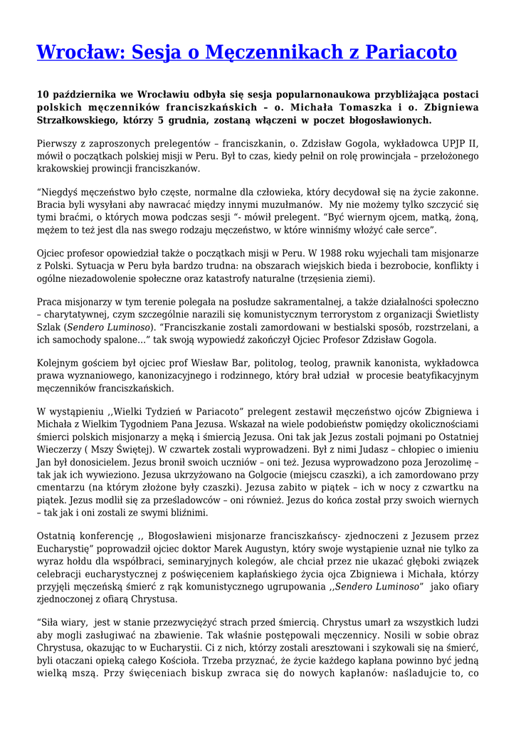 Wrocław: Sesja o Męczennikach z Pariacoto