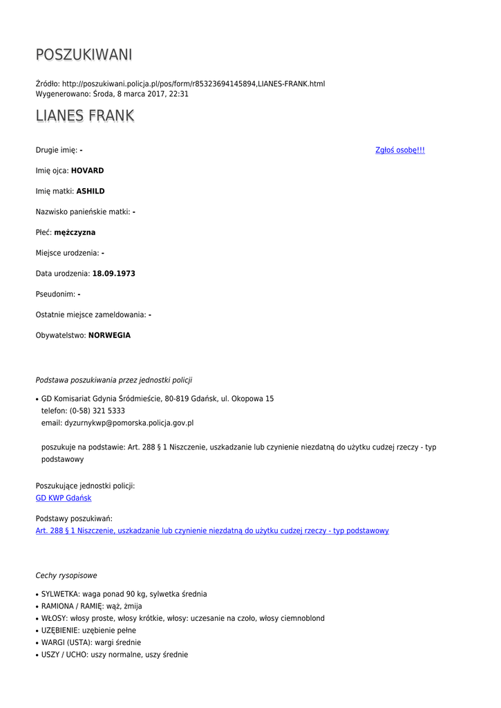 POSZUKIWANI Źródło: http://poszukiwani.policja.pl/pos/form/r85323694145894,LIANES-FRANK.html Wygenerowano: Środa, 8 marca 2017, 22:31 LIANES FRANK Drugie imię: - Zgłoś osobę!!! Imię ojca: HOVARD Imię matki: ASHILD Nazwisko panieńskie matki: Płeć: mężczyzna Miejsce urodzenia: Data urodzenia: 18.09.1973 Pseudonim: Ostatnie miejsce zameldowania: Obywatelstwo: NORWEGIA Podstawa poszukiwania przez jednostki policji ● GD Komisariat Gdynia Śródmieście, 80-819 Gdańsk, ul. Okopowa 15 telefon: (0-58) 321 5333 email: [email protected] poszukuje na podstawie: Art. 288 § 1 Niszczenie, uszkadzanie lub czynienie niezdatną do użytku cudzej rzeczy - typ podstawowy Poszukujące jednostki policji: GD KWP Gdańsk Podstawy poszukiwań: Art. 288 § 1 Niszczenie, uszkadzanie lub czynienie niezdatną do użytku cudzej rzeczy - typ podstawowy Cechy rysopisowe ● SYLWETKA: waga ponad 90 kg, sylwetka średnia ● RAMIONA / RAMIĘ: wąż, żmija ● WŁOSY: włosy proste, włosy krótkie, włosy: uczesanie na czoło, włosy ciemnoblond ● UZĘBIENIE: uzębienie pełne ● WARGI (USTA): wargi średnie ● USZY / UCHO: uszy normalne, uszy średnie ● NOS: kolor nosa naturalny, nos średni, nos prostolinijny, koniuszek nosa opuszczony ● OCZY / OKO: oczy normalnie osadzone ● CZOŁO: czoło średnie ● TWARZ: twarz chuda, b.szczupła, twarz prostokątna, broda, wąsy Wzrost: 176-180 CM Kolor oczu: JASNE Tweetnij