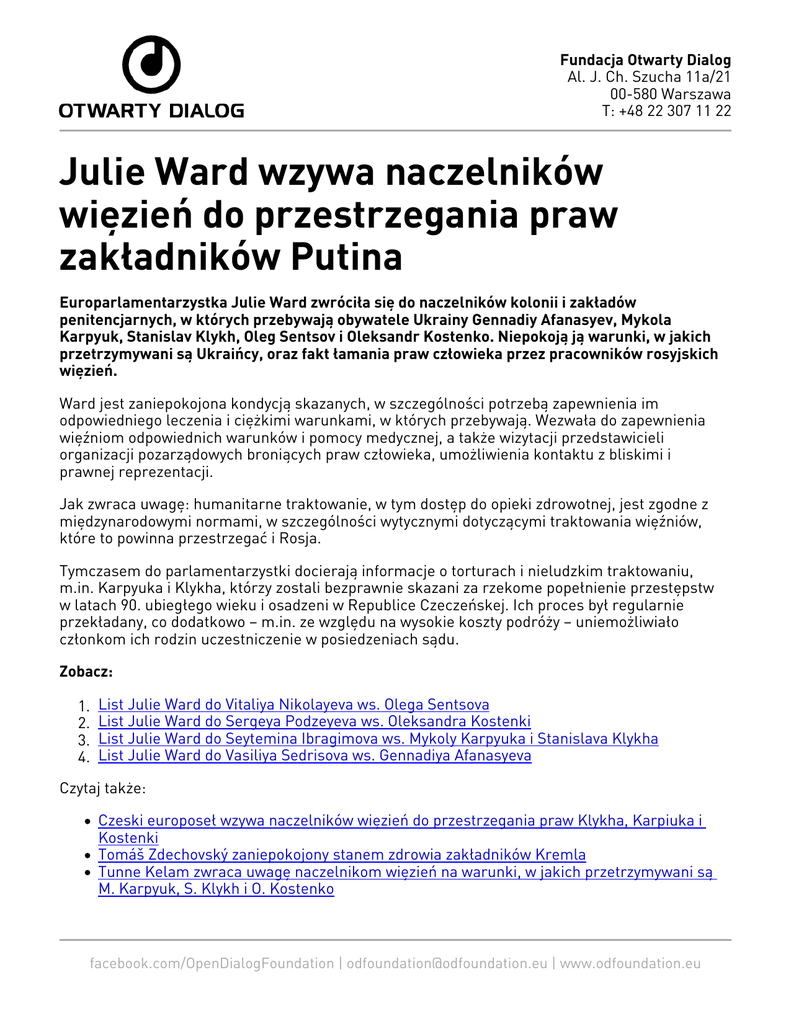Fundacja Otwarty Dialog Al. J. Ch. Szucha 11a/21 00-580 Warszawa T: +48 22 307 11 22 Julie Ward wzywa naczelników więzień do przestrzegania praw zakładników Putina Europarlamentarzystka Julie Ward zwróciła się do naczelników kolonii i zakładów penitencjarnych, w których przebywają obywatele Ukrainy Gennadiy Afanasyev, Mykola Karpyuk, Stanislav Klykh, Oleg Sentsov i Oleksandr Kostenko. Niepokoją ją warunki, w jakich przetrzymywani są Ukraińcy, oraz fakt łamania praw człowieka przez pracowników rosyjskich więzień. Ward jest zaniepokojona kondycją skazanych, w szczególności potrzebą zapewnienia im odpowiedniego leczenia i ciężkimi warunkami, w których przebywają. Wezwała do zapewnienia więźniom odpowiednich warunków i pomocy medycznej, a także wizytacji przedstawicieli organizacji pozarządowych broniących praw człowieka, umożliwienia kontaktu z bliskimi i prawnej reprezentacji. Jak zwraca uwagę: humanitarne traktowanie, w tym dostęp do opieki zdrowotnej, jest zgodne z międzynarodowymi normami, w szczególności wytycznymi dotyczącymi traktowania więźniów, które to powinna przestrzegać i Rosja. Tymczasem do parlamentarzystki docierają informacje o torturach i nieludzkim traktowaniu, m.in. Karpyuka i Klykha, którzy zostali bezprawnie skazani za rzekome popełnienie przestępstw w latach 90. ubiegłego wieku i osadzeni w Republice Czeczeńskej. Ich proces był regularnie przekładany, co dodatkowo – m.in. ze względu na wysokie koszty podróży – uniemożliwiało członkom ich rodzin uczestniczenie w posiedzeniach sądu. Zobacz: 1. 2. 3. 4. List Julie Ward do Vitaliya Nikolayeva ws. Olega Sentsova List Julie Ward do Sergeya Podzeyeva ws. Oleksandra Kostenki List Julie Ward do Seytemina Ibragimova ws. Mykoly Karpyuka i Stanislava Klykha List Julie Ward do Vasiliya Sedrisova ws. Gennadiya Afanasyeva Czytaj także: Czeski europoseł wzywa naczelników więzień do przestrzegania praw Klykha, Karpiuka i Kostenki Tomáš Zdechovský zaniepokojony stanem zdrowia zakładników Kremla Tunne Kelam zwraca uwagę naczelnikom więzień na warunki, w jakich przetrzymywani są M. Karpyuk, S. Klykh i O. Kostenko facebook.com/OpenDialogFoundation | [email protected] | www.odfoundation.eu