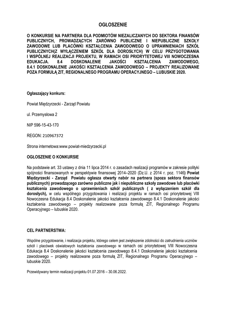OGŁOSZENIE O KONKURSIE NA PARTNERA DLA PODMIOTÓW NIEZALICZANYCH DO SEKTORA FINANSÓW PUBLICZNYCH, PROWADZĄCYCH ZARÓWNO PUBLICZNE I NIEPUBLICZNE SZKOŁY ZAWODOWE LUB PLACÓWKI KSZTAŁCENIA ZAWODOWEGO O UPRAWNIENIACH SZKÓŁ PUBLICZNYCH(Z WYŁĄCZENIEM SZKÓŁ DLA DOROSŁYCH) W CELU PRZYGOTOWANIA I WSPÓLNEJ REALIZACJI PROJEKTU, W RAMACH OSI PRIORYTETOWEJ VIII NOWOCZESNA EDUKACJA. 8.4 DOSKONALENIE JAKOŚCI KSZTAŁCENIA ZAWODOWEGO, 8.4.1 DOSKONALENIE JAKOŚCI KSZTAŁCENIA ZAWODOWEGO – PROJEKTY REALIZOWANE POZA FORMUŁĄ ZIT, REGIONALNEGO PROGRAMU OPERACYJNEGO – LUBUSKIE 2020. Ogłaszający konkurs: Powiat Międzyrzecki - Zarząd Powiatu ul. Przemysłowa 2 NIP 596-15-43-170 REGON: 210967372 Strona internetowa:www.powiat-miedzyrzecki.pl OGŁOSZENIE O KONKURSIE Na podstawie art. 33 ustawy z dnia 11 lipca 2014 r. o zasadach realizacji programów w zakresie polityki spójności finansowanych w perspektywie finansowej 2014–2020 (Dz.U. z 2014 r. poz. 1146) Powiat Międzyrzecki - Zarząd Powiatu ogłasza otwarty nabór na partnera (spoza sektora finansów publicznych) prowadzącego zarówno publiczne jak i niepubliczne szkoły zawodowe lub placówki kształcenia zawodowego o uprawnieniach szkół publicznych ( z wyłączeniem szkół dla dorosłych), w celu wspólnego przygotowania i realizacji projektu w ramach osi priorytetowej VIII Nowoczesna Edukacja 8.4 Doskonalenie jakości kształcenia zawodowego 8.4.1 Doskonalenie jakości kształcenia zawodowego – projekty realizowane poza formułą ZIT, Regionalnego Programu Operacyjnego – lubuskie 2020. CEL PARTNERSTWA: Wspólne przygotowanie, i realizacja projektu, którego celem jest zwiększenie zdolności do zatrudnienia uczniów szkół i placówek oświatowych kształcenia zawodowego w ramach osi priorytetowej VIII Nowoczesna Edukacja 8.4 Doskonalenie jakości kształcenia zawodowego 8.4.1 Doskonalenie jakości kształcenia zawodowego – projekty realizowane poza formułą ZIT, Regionalnego Programu Operacyjnego – lubuskie 2020. Przewidywany termin realizacji projektu 01.07.2016 – 30.06.2022. ZADANIA PARTNERA 1. Przeprowadzenie rekrutacji wśród uczniów szkół i placówek prowadzących kształcenie zawodowe w celu wysłania ich na dodatkowe praktyki zawodowe/staże zawodowe. 2. Opracowanie programu praktyk zawodowych lub staży zawodowych dla uczniów szkół i placówek prowadzących kształcenie zawodowe. 3. Zapewnienie miejsca praktyki dla uczniów ze szkół znajdujących się na terenie powiatu, którzy wyrażają chęć wzięcia udziału w dodatkowych praktykach zawodowych, w odpowiednim obszarze kształcenia. 4. Kierowanie nauczycieli na kursy kwalifikacyjne, szkolenia doskonalące w zakresie tematyki związanej z nauczanym zawodem, studia podyplomowe, itp. 5. Kierowanie nauczycieli zawodu na praktyki i staże u pracodawców i przedsiębiorców. 6. Organizacja i przeprowadzenie zajęć dla uczniów szkół zawodowych podnoszących ich kompetencje i kwalifikacje potrzebne na rynku pracy. 7. Monitorowanie i kontrolowanie jakości praktyk zawodowych lub staży zawodowych uczniów u pracodawców. ZAKRES TEMATYCZNY PROJEKTU: (PARTNERSTWA) Realizacja projektu ma na celu wspierać kształcenie zawodowe w zakresie: 1. Podniesienie jakości kształcenia i szkolenia zawodowego, w tym rozwój współpracy szkół i placówek systemu oświaty prowadzących kształcenie zawodowe z ich otoczeniem społeczno-gospodarczym, poprzez: a) doskonalenie umiejętności i kompetencji zawodowych nauczycieli zawodu i instruktorów praktycznej nauki zawodu, związanych z nauczanym zawodem, we współpracy z instytucjami otoczenia społeczno-gospodarczego szkół i placówek systemu oświaty prowadzących kształcenie zawodowe; b) podnoszenie umiejętności oraz uzyskiwanie kwalifikacji zawodowych przez uczniów szkół lub placówek systemu oświaty prowadzących kształcenie zawodowe oraz uczestników pozaszkolnych form kształcenia zawodowego i wzmacnianie ich zdolności do zatrudnienia; c) tworzenie w szkołach lub placówkach systemu oświaty prowadzących kształcenie zawodowe warunków odzwierciedlających naturalne warunki pracy właściwe dla nauczanych zawodów; d) rozwój współpracy szkół lub placówek systemu oświaty prowadzących kształcenie zawodowe z ich otoczeniem społeczno-gospodarczym. 2. Doradztwo edukacyjno-zawodowe uczniów. 3. Praktyki i staże nauczycieli kształcenia zawodowego oraz uczniów realizowane u pracodawców lub w przedsiębiorstwach. Wsparcie doskonalenia nauczycieli kształcenia zawodowego - Kursy kwalifikacyjne, szkolenia doskonalące dla nauczycieli w zakresie tematyki związanej z nauczanym zawodem. Studia podyplomowe. 4. Dodatkowe zajęcia dla uczniów - zajęcia specjalistyczne, kursy nadające nowe kwalifikacje i umiejętności, kursy i szkolenia przygotowujące do egzaminów czeladniczych i mistrzowskich 5. Doradztwo edukacyjno-zawodowe uczniów. 6. Praktyki i staże nauczycieli kształcenia zawodowego oraz uczniów realizowane u pracodawców lub w przedsiębiorstwach. WYMAGANIA WOBEC PARTNERA: Do postępowania mogą przystąpić podmioty, które spełniają poniższe wymogi: 1. Nie są jednostką sektora finansów publicznych. 2. Mają zarejestrowaną działalność. 3. Prowadzą publiczne i niepubliczne szkoły zawodowe lub placówki kształcenia zawodowego o uprawnieniach szkół publicznych (z wyłączeniem szkół dla dorosłych) na terenie Powiatu Międzyrzeckiego. 4. Nie podlegają wykluczeniu z ubiegania się o dofinansowanie na podstawie art. 207 ust. 4 ustawy z dnia 27 sierpnia 2009 r. o finansach publicznych (tekst jedn. Dz. U. z 2013 r. poz. 885 z późn. zm.) z zastrzeżeniem art. 207 ust. 7 tej Ustawy. 5. Posiadają zasoby ludzkie, organizacyjne, finansowe i techniczne niezbędne do realizacji zgłaszanych do projektu działań. 6. Posiadają doświadczenie w realizacji projektu/ów o podobnym charakterze. 7. Nie zalegają z opłacaniem składek ZUS i składek wobec Urzędu Skarbowego
