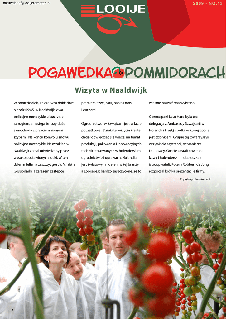 [email protected] 20 0 9 - n o . 1 3 pogawedka pommidorach Wizyta w Naaldwijk W poniedziałek, 15 czerwca dokładnie premiera Szwajcarii, pania Doris o godz 09:45 w Naaldwijk, dwa Leuthard. policyjne motocykle ukazaly sie wlasnie nasza firma wybrano. Oprocz pani Leut Hard była tez za rogiem, a następnie trzy duże Ogrodnictwo w Szwajcarii jest w fazie delegacja z Ambasady Szwajcarii w samochody z przyciemnionymi początkowej. Dzięki tej wizycie kraj ten Holandii i FresQ, spółki, w której Looije szybami. Na koncu konwoju znowu chciał dowiedzieć sie więcej na temat jest czlonkiem. Grupie tej towarzyszyli policyjne motocykle. Nasz zaklad w produkcji, pakowania i innowacyjnych oczywiście asystenci, ochraniarze Naaldwijk zostal odwiedzony przez technik stosowanych w holenderskim i kierowcy. Goście zostali powitani wysoko postawionych ludzi. W ten ogrodnictwie i uprawach. Holandia kawą i holenderskimi ciasteczkami dzien mielismy zaszczyt goscic Ministra jest światowym liderem w tej branży, (stroopwafel). Potem Robbert de Jong Gospodarki, a zarazem zastepce a Looije jest bardzo zaszczycone, że to rozpoczal krótka prezentacjie firmy. Czytaj więcej na stronie 2 Mowil m.in. o historii naszej firmy, o naszej pozycji na rynku i przyszłości naszej firmy. Wkrótce juz goscie musieli ubrac biale kombinezony ochronne, aby moc wejsc na szklarnie i obejrzec pomidory. Zastepca premiera uwaznie słuchała historii na temat uprawy i opieki nad uprawa. Ponadto, była ciekawa takich kwestii, jak zuzycie energii i planowanie personelu. Rowniez bardzo praktyczne kwestie, takie jak baki na szklarni i ogrzewanie zostały dokladanie przedstawione delegacji. Oczywiście nie obyło sie bez skosztowania naszych pomidorow, jak widać na zdjęciu, byly smaczne! Po godzinnej wizycie delegacja ruszyla w strone Green Pack. Tam zostal objasniony caly process pakowania pomidorow. W godzinach popołudniowych, pani Leuthard spotkala sie jeszcze z naszym premierem Balkenende i kilkoma ministrami z naszego kraju. Istnieje szansa , że postawila tam ma stol nasze “Honingtomaten ®” ! Narodziny 5 lat (lub dłużej) w Looije W naszej firmie jest pewna liczba osób, która juz pracuje tu 5 lat lub dluzej. Osoby te umieszczono w sloneczku. W ostatnich tygodniach zostaly one 4 czerwca Debbie i Marcel van Duin, zaskoczone, otrzymujac pyszny tort wraz z synem Laurensem, powitali smietankowy ! coreczke Emme. Rodzice wraz z dziecmi maja sie dobrze. W sobote 5 czerwca We Viersprong w ‘s Gravenzande odbył sie ślub Robberta i Louise. Od kolegow z Maasdijk para otrzymała prawdziwe “drzewo pieniezne” takze pierwsze “żniwa” sa zebrane... teraz mamy 3 nadzieję, że bedzie nadal owocowac... Zdane? Katarzyna Felisiak (M) 22-6 Bas van Meel (T) 23-6 Natalia Matyszewska (T) 23-6 Brian Voogt (T) 24-6 Eszter Nyari (N) 24-6 Wieslawa Polanowicz (N) 25-6 Judyta Manka (N) 27-6 Marek Kokolus (N) 28-6 Marzena Jaworowska (M) 28-6 Justyna Kaczanowska (M) 30-6 Ismail Yilmaz (N) 2-7 Marcin Pycek (N) 3-7 Michiel Bontenbal (M) 3-7 W zeszłym tygodniu, niektórzy uczniowie pracujacy u nas, nerwowo siedzieli przed telefonem. Egzamin zdany, czy tez nie? Dla tych, którzy usłyszeli dobrą wiadomośc: skladamy GRATULACJE! Tym zas, którzy otrzymali nieprzyjemne wiadomości zyczymy powodzenia! Czym sie zajmujesz… Jestem Noel Wijn, mam 25 lat, a od 1 ... W Twojej okolicy? najszybciej uzyskac pelny wizerunek czerwca zacząłem prace w Looije, na W zeszlym roku z moja dziewczyną firmy i mojej pracy, aby moc ja dobrze funkcji lidera/koordynatora grupy. kupiłem dom we Vierpolders. Jeszcze i skutecznie wykonywac. Chciałbym do teraz spedzam tam kazda wolna również serdecznie podziekowac za chwile, aby zrobic z niego dom naszych wsparcie każdemu we firmie, kto mnie marzen. Jezdze również co dwa do tej pory oprowadzal! tygodnie do Rotterdamu Spangen, aby tam ogladac najpiękniejsze rozgrywki ... W świecie? piłkarskie w Holandii - Sp-ar-ta! Wkrótce Sledze wojny glownie w Afganistanie chce wrocic znowu do mojego starego i Iraku. A to dlatego, iż sam bylem hobby, koszykówki ktore juz uprawiam żołnierzem. To okropne, ogladać w 12 lat. jakich warunkach ludzie musza życ i radzic sobie z dnia na dzien. ... W Twojej pracy? W tej chwili jestem jeszcze na etapie zapoznawczym, ale chcialbym jak