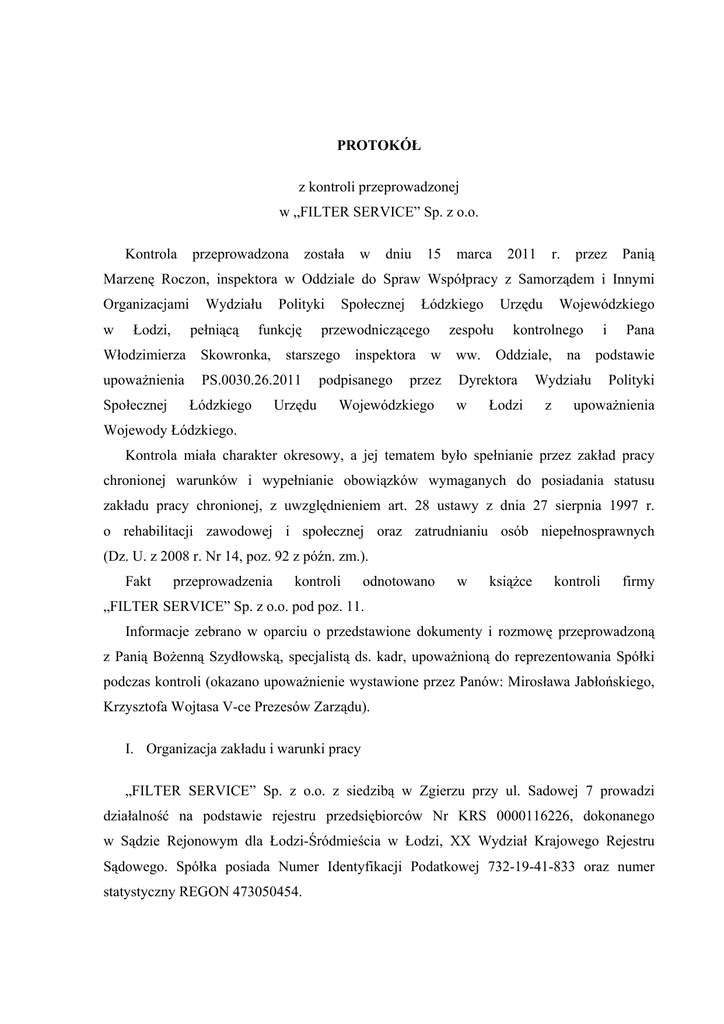 PROTOKÓŁ z kontroli przeprowadzonej w „FILTER SERVICE” Sp. z o.o. Kontrola przeprowadzona została w dniu 15 marca 2011 r. przez Panią Marzenę Roczon, inspektora w Oddziale do Spraw Współpracy z Samorządem i Innymi Organizacjami w Łodzi, Wydziału pełniącą Polityki funkcję Włodzimierza Skowronka, upoważnienia PS.0030.26.2011 Społecznej Łódzkiego Społecznej przewodniczącego starszego Urzędu Łódzkiego inspektora podpisanego Urzędu zespołu w przez Wojewódzkiego ww. kontrolnego Oddziale, Dyrektora w Wojewódzkiego Łodzi na i podstawie Wydziału z Pana Polityki upoważnienia Wojewody Łódzkiego. Kontrola miała charakter okresowy, a jej tematem było spełnianie przez zakład pracy chronionej warunków i wypełnianie obowiązków wymaganych do posiadania statusu zakładu pracy chronionej, z uwzględnieniem art. 28 ustawy z dnia 27 sierpnia 1997 r. o rehabilitacji zawodowej i społecznej oraz zatrudnianiu osób niepełnosprawnych (Dz. U. z 2008 r. Nr 14, poz. 92 z późn. zm.). Fakt przeprowadzenia kontroli odnotowano w książce kontroli firmy „FILTER SERVICE” Sp. z o.o. pod poz. 11. Informacje zebrano w oparciu o przedstawione dokumenty i rozmowę przeprowadzoną z Panią Bożenną Szydłowską, specjalistą ds. kadr, upoważnioną do reprezentowania Spółki podczas kontroli (okazano upoważnienie wystawione przez Panów: Mirosława Jabłońskiego, Krzysztofa Wojtasa V-ce Prezesów Zarządu). I. Organizacja zakładu i warunki pracy „FILTER SERVICE” Sp. z o.o. z siedzibą w Zgierzu przy ul. Sadowej 7 prowadzi działalność na podstawie rejestru przedsiębiorców Nr KRS 0000116226, dokonanego w Sądzie Rejonowym dla Łodzi-Śródmieścia w Łodzi, XX Wydział Krajowego Rejestru Sądowego. Spółka posiada Numer Identyfikacji Podatkowej 732-19-41-833 oraz numer statystyczny REGON 473050454. Podstawową działalnością „FILTER SERVICE” Sp. z o.o. jest wytwarzanie i badanie sprzętu ochrony górnych dróg oddechowych (półmaski przeciwpyłowe, filtracyjne, włókniny). Siedzibę Spółki stanowi kompleks budynków dwukondygnacyjnych: − parter: hala produkcyjna (produkcja masek, włóknin), gabinet pielęgniarki, laboratorium, pomieszczenia socjalne, − piętro: administracja. Poza siedzibą ww. Spółki, miejscem wykonywania działalności gospodarczej jest oddział mieszczący się w Łodzi przy ul. Sadowej 4. Znajdują się tam: − budynek dwukondygnacyjny (parter zajęty jest na magazyny i pomieszczenia socjalne), − wolnostojący budynek parterowy (produkcja masek i włóknin). Kontrola Inspektora Pracy Państwowej Inspekcji Pracy Okręgowego Inspektoratu Pracy w Łodzi odbyła się w dniach 09,10,14 i 16 lipca 2009 r. W czasie kontroli wydano 11 decyzji ustnych, które zostały wykonane i udzielono 8 porad z zakresu bezpieczeństwa i higieny pracy oraz 6 porad z zakresu prawnej ochrony pracy. II. Zatrudnienie pracowników Kontroli poddano zatrudnienie, w okresie od 01 lipca 2010 r. do 15 marca 2011 r., ze szczególnym uwzględnieniem osób niepełnosprawnych. Zgodnie z art. 28 ustawy o rehabilitacji zawodowej i społecznej oraz zatrudnianiu osób niepełnosprawnych wskaźnik zatrudnienia osób niepełnosprawnych powinien wynosić co najmniej 40% ogółu zatrudnionych, w tym co najmniej 10% ogółu zatrudnionych to osoby zaliczone do znacznego lub umiarkowanego stopnia niepełnosprawności. Zatrudnienie w „FILTER SERVICE” Sp. z o.o., w przeliczeniu na pełny wymiar czasu pracy (etaty), w kontrolowanym okresie, kształtowało się w sposób następujący: − w lipcu zatrudnionych ogółem było 199,71 pracowników, w tym 89,39 osób niepełnosprawnych. Wskaźnik zatrudnienia osób niepełnosprawnych wyniósł 44,76%. Wskaźnik zatrudnienia osób ze znacznym lub umiarkowanym stopniem niepełnosprawności wyniósł 21,53%, − w sierpniu zatrudnionych ogółem było 201,62 pracowników, w tym 91 osób niepełnosprawnych. Wskaźnik zatrudnienia osób niepełnosprawnych wyniósł 2 45,12%. Wskaźnik zatrudnienia osób ze znacznym lub umiarkowanym stopniem niepełnosprawności wyniósł 21,33%, − we wrześniu zatrudnionych ogółem było 202,48 pracowników, w tym 90 osób niepełnosprawnych. Wskaźnik zatrudnienia osób niepełnosprawnych wyniósł 44,45%. Wskaźnik zatrudnienia osób ze znacznym lub umiarkowanym stopniem niepełnosprawności wyniósł 20,74%, − w październiku zatrudnionych ogółem było 201,98 pracowników, w tym 90,68 osób niepełnosprawnych. Wskaźnik zatrudnienia osób niepełnosprawnych wyniósł 44,90%. Wskaźnik zatrudnienia osób ze znacznym lub umiarkowanym stopniem niepełnosprawności wyniósł 20,79%, − w listopadzie zatrudnionych ogółem było 200,92 pracowników, w tym 91,17 osób niepełnosprawnych. Wskaźnik zatrudnienia osób niepełnosprawnych wyniósł 45,38%. Wskaźnik zatrudnienia osób ze znacznym lub umiarkowanym stopniem niepełnosprawności wyniósł 20,90%, − w grudniu zatrudnionych ogółem było 202,59 pracowników, w tym 90,84 osób niepełnosprawnych. Wskaźnik zatrudnienia osób niepełnosprawnych wyniósł 44,84%. Wskaźnik zatrudnienia osób ze znacznym lub umiarkowanym stopniem niepełnosprawności wyniósł 20,24%, − w styczniu 2011 r. zatrudnionych ogółem było 199,75 pracowników, w tym 89 osób niepełnosprawnych. Wskaźnik zatrudnienia osób niepełnosprawnych wyniósł 44,56%. Wskaźnik zatrudnienia osób ze znacznym lub umiarkowanym stopniem niepełnosprawności wyniósł 20,53%, − w lutym, zatrudnionych ogółem było 199,75 pracowników, w tym 87 osób niepełnosprawnych. Wskaźnik zatrudnienia osób niepełnosprawnych wyniósł 43,55%. Wskaźnik zatrudnienia osób ze znacznym lub umiarkowanym stopniem niepełnosprawności wyniósł 20,03%, − w marcu, na dzień kontroli (15 marca 2011 r.) zatrudnionych ogółem było 198,75 pracowników, w tym 85 osób niepełnosprawnych. Wskaźnik zatrudnienia osób niepełnosprawnych wyniósł 42,76%. Wskaźnik zatrudnienia os