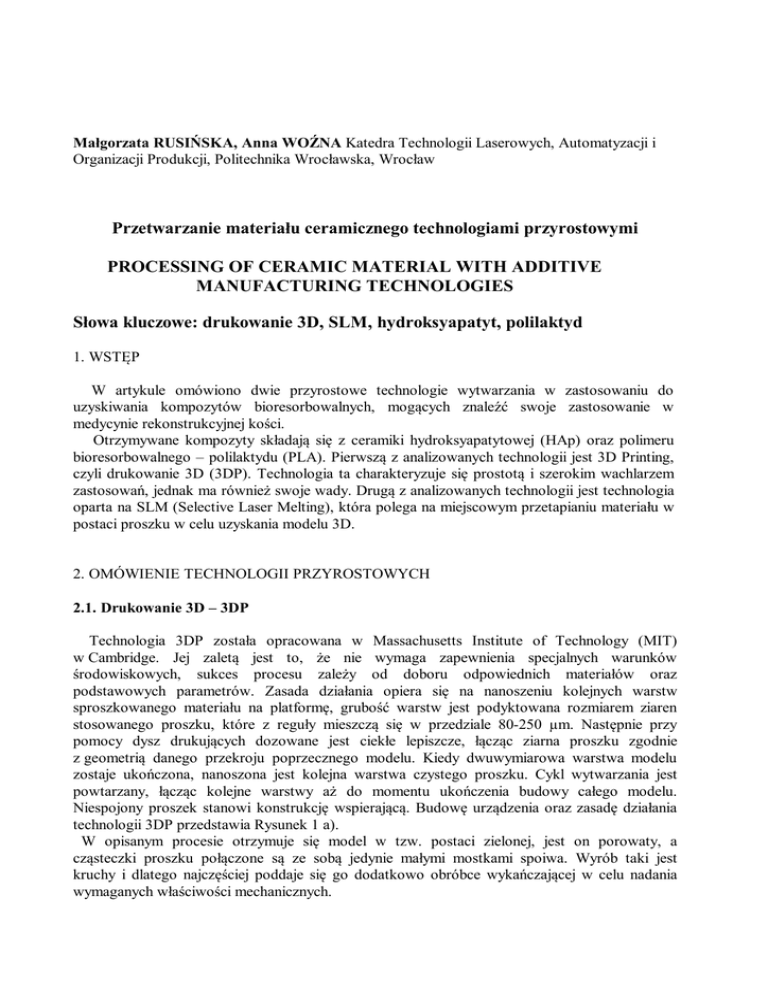 Małgorzata RUSIŃSKA, Anna WOŹNA Katedra Technologii Laserowych, Automatyzacji i Organizacji Produkcji, Politechnika Wrocławska, Wrocław Przetwarzanie materiału ceramicznego technologiami przyrostowymi PROCESSING OF CERAMIC MATERIAL WITH ADDITIVE MANUFACTURING TECHNOLOGIES Słowa kluczowe: drukowanie 3D, SLM, hydroksyapatyt, polilaktyd 1. WSTĘP W artykule omówiono dwie przyrostowe technologie wytwarzania w zastosowaniu do uzyskiwania kompozytów bioresorbowalnych, mogących znaleźć swoje zastosowanie w medycynie rekonstrukcyjnej kości. Otrzymywane kompozyty składają się z ceramiki hydroksyapatytowej (HAp) oraz polimeru bioresorbowalnego – polilaktydu (PLA). Pierwszą z analizowanych technologii jest 3D Printing, czyli drukowanie 3D (3DP). Technologia ta charakteryzuje się prostotą i szerokim wachlarzem zastosowań, jednak ma również swoje wady. Drugą z analizowanych technologii jest technologia oparta na SLM (Selective Laser Melting), która polega na miejscowym przetapianiu materiału w postaci proszku w celu uzyskania modelu 3D. 2. OMÓWIENIE TECHNOLOGII PRZYROSTOWYCH 2.1. Drukowanie 3D – 3DP Technologia 3DP została opracowana w Massachusetts Institute of Technology (MIT) w Cambridge. Jej zaletą jest to, że nie wymaga zapewnienia specjalnych warunków środowiskowych, sukces procesu zależy od doboru odpowiednich materiałów oraz podstawowych parametrów. Zasada działania opiera się na nanoszeniu kolejnych warstw sproszkowanego materiału na platformę, grubość warstw jest podyktowana rozmiarem ziaren stosowanego proszku, które z reguły mieszczą się w przedziale 80-250 µm. Następnie przy pomocy dysz drukujących dozowane jest ciekłe lepiszcze, łącząc ziarna proszku zgodnie z geometrią danego przekroju poprzecznego modelu. Kiedy dwuwymiarowa warstwa modelu zostaje ukończona, nanoszona jest kolejna warstwa czystego proszku. Cykl wytwarzania jest powtarzany, łącząc kolejne warstwy aż do momentu ukończenia budowy całego modelu. Niespojony proszek stanowi konstrukcję wspierającą. Budowę urządzenia oraz zasadę działania technologii 3DP przedstawia Rysunek 1 a). W opisanym procesie otrzymuje się model w tzw. postaci zielonej, jest on porowaty, a cząsteczki proszku połączone są ze sobą jedynie małymi mostkami spoiwa. Wyrób taki jest kruchy i dlatego najczęściej poddaje się go dodatkowo obróbce wykańczającej w celu nadania wymaganych właściwości mechanicznych. XI Konferencja Naukowa Majówka Młodych Biomechaników im. prof. Dagmary Tejszerskiej s. 110 a) Drukowanie 3D b) Technlogia oparta o SLM Rysunek 1. Schemat: a) drukowania 3D, b) technologii opartej na SLM 2.2. Technologia oparta na SLM W technologii laserowej to laser topi proszek, zaaplikowanego na ruchome łoże robocze materiału, w ściśle określonych miejscach (na podstawie modelu .slt). Koncepcja działania SLM przedstawiona jest na rysunku 1 b). Proszki stosowane w spiekaniu laserowym mają średnice cząstek zwykle od 20-100 μm. Po nałożeniu proszku na ruchome łoże robocze wiązka lasera selektywnie spieka poszczególne cząsteczki, które następnie krzepną tworząc jednolitą warstwę. Następnie następuje obniżenie platformy roboczej oraz zostaje naniesiona nowa warstwa luźnego proszku i proces jest powtarzany analogicznie. Cząsteczki nowej warstwy przy krzepnięciu ponadto łączą się ze starą, tworząc tym samym część modelu przestrzennego. W opisywanym procesie otrzymuje się model gotowy – nie wymagający dodatkowej obróbki, poza usunięciem nadmiaru proszku, który mógł się przylepić do modelu za sprawą działania sił adhezji. LITERATURA [1] Hench L. L.: Bioceramics: From Concept to Clinic, J. Am. Ceram. Soc. 74, str. 1487-1510, 1991. [2] Leukers B. et al.:Biocompatibility of ceramic scaffolds for bone replacement made by 3D printing, Mat.-wiss. u. Werkstofftech 36, str. 781-787, 2005. [3] Dybała B., Lipowicz A.: Building customised medical biomodels, including scaffolds, in rapid prototyping technologies – a review, Production Engineering "Knowledge – VisionFramework Programmes", str. 69-74, 2006. [4] Ion J.C.: Laser Processing of Engineering Materials, Elsevier, 2005 [5] Pielichowska K., Blazewicz S.: Bioactive Polymer/Hydroxyapatite (Nano)composites for Bone Tissue Regeneration, Advanced Polymer Science (2010) 232:97-207, kwiecień 2010. [6] Zhao J., Guo L.Y., Yang X.B., Weng J.: Preparation of bioactive porous HA/PCL composite scaffolds. Applied Surface Science 255 (2008) 2942 – 2946, 2008 Zadanie współfinansowane ze środków Unii Europejskiej w ramach Europejskiego Funduszu Społecznego