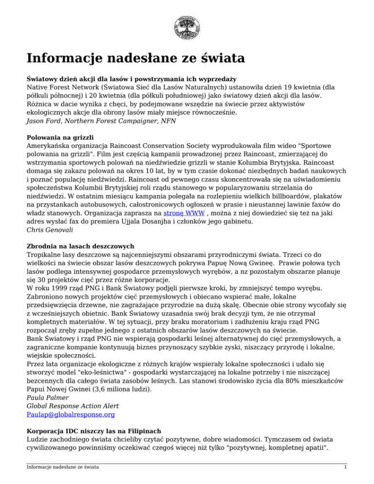 Informacje nadesłane ze świata Światowy dzień akcji dla lasów i powstrzymania ich wyprzedaży Native Forest Network (Światowa Sieć dla Lasów Naturalnych) ustanowiła dzień 19 kwietnia (dla półkuli północnej) i 20 kwietnia (dla półkuli południowej) jako światowy dzień akcji dla lasów. Różnica w dacie wynika z chęci, by podejmowane wszędzie na świecie przez aktywistów ekologicznych akcje dla obrony lasów miały miejsce równocześnie. Jason Ford, Northern Forest Campaigner, NFN Polowania na grizzli Amerykańska organizacja Raincoast Conservation Society wyprodukowała film wideo "Sportowe polowania na grizzli". Film jest częścią kampanii prowadzonej przez Raincoast, zmierzającej do wstrzymania sportowych polowań na niedźwiedzie grizzli w stanie Kolumbia Brytyjska. Raincoast domaga się zakazu polowań na okres 10 lat, by w tym czasie dokonać niezbędnych badań naukowych i poznać populację niedźwiedzi. Raincoast od pewnego czasu skoncentrowała się na uświadomieniu społeczeństwa Kolumbii Brytyjskiej roli rządu stanowego w popularyzowaniu strzelania do niedźwiedzi. W ostatnim miesiącu kampania polegała na rozlepieniu wielkich billboardów, plakatów na przystankach autobusowych, całostronicowych ogłoszeń w prasie i nieustannej lawinie faxów do władz stanowych. Organizacja zaprasza na stronę WWW , można z niej dowiedzieć się też na jaki adres wysłać fax do premiera Ujjala Dosanjha i członków jego gabinetu. Chris Genovali Zbrodnia na lasach deszczowych Tropikalne lasy deszczowe są najcenniejszymi obszarami przyrodniczymi świata. Trzeci co do wielkości na świecie obszar lasów deszczowych pokrywa Papuę Nową Gwineę. Prawie połowa tych lasów podlega intensywnej gospodarce przemysłowych wyrębów, a nz pozostałym obszarze planuje się 30 projektów cięć przez różne korporacje. W roku 1999 rząd PNG i Bank Światowy podjęli pierwsze kroki, by zmniejszyć tempo wyrębu. Zabroniono nowych projektów cięć przemysłowych i obiecano wspierać małe, lokalne przedsięwzięcia drzewne, nie zagrażające przyrodzie na dużą skalę. Obecnie obie strony wycofały się z wcześniejszych obietnic. Bank Światowy uzasadnia swój brak decyzji tym, że nie otrzymał kompletnych materiałów. W tej sytuacji, przy braku moratorium i zadłużeniu kraju rząd PNG rozpoczął zręby zupełne jednego z ostatnich obszarów lasów deszczowych na świecie. Bank Światowy i rząd PNG nie wspierają gospodarki leśnej alternatywnej do cięć przemysłowych, a zagraniczne kompanie kontynuują biznes przynoszący szybkie zyski, niszczący przyrodę i lokalne, wiejskie społeczności. Przez lata organizacje ekologiczne z różnych krajów wspierały lokalne społeczności i udało się stworzyć model "eko-leśnictwa" - gospodarki wystarczającej na lokalne potrzeby i nie niszczącej bezcennych dla całego świata zasobów leśnych. Las stanowi środowisko życia dla 80% mieszkańców Papui Nowej Gwinei (3,6 miliona ludzi). Paula Palmer Global Response Action Alert [email protected] Korporacja IDC niszczy las na Filipinach Ludzie zachodniego świata chcieliby czytać pozytywne, dobre wiadomości. Tymczasem od świata cywilizowanego powinniśmy oczekiwać czegoś więcej niż tylko "pozytywnej, kompletnej apatii". Informacje nadesłane ze świata 1 Podczas gdy siedzicie sobie w luksusowych mieszkaniach staracie się nie myśleć o tysiącach, które giną, by zaspokoić wasze potrzeby. Prawie nikt nie ruszy nawet palcem, by powstrzymać niszczenie życia w południowo-wschodniej Azji. Giną tam nie tylko gatunki, nie tylko miejscowi ludzie, ginie tam część nas samych i ostatki nadziei na życie człowieka w harmonii z naturą. Tajlandia, Filipiny, Papua Nowa Gwinea, Malezja, Indonezja - wszędzie tam postępuje wycinanie lasów, pozbawianie ludności tubylczej warunków do życia. IDC - Industrial Development Corporation (Korporacja Rozwoju Przemysłowego - której właściciel jest rodzinnie związany z rządem) wycina ostatni las deszczowy na Filipinach. W lutym 2001 planuje wycięcie lasu na półwyspie San Ildefonso w północno-wschodniej prowincji Luzon. IDC już od lat działa na tym terenie łamiąc wiele ustaleń prawnych, m.in. deklarację ustanawiającą na półwyspie rezerwat przyrody, rozporządzenie zakazujące wycinania starodrzewi w lasach deszczowych na Filipinach, a także rozporządzenie zabraniające wyrębu na obszarach zamieszkałych przez aborygenów. Na Filipinach zostało zaledwie 2% pierwotnych lasów. Wyrąb zaczął się przed 500 laty, kiedy Hiszpanie cięli las dla potrzeb swojej floty. Przez ostatnie 50 lat, kiedy to Filipiny były rodzajem kolonii amerykańskiej, wycięto 80% lasów. Tak zwane niepodległe Filipiny stały się w latach 70-tych XX wieku eksporterem drewna tropikalnego nr 1 na świecie. Dzisiaj, kiedy lasy deszczowe porastają już tylko odległe rejony Filipin, działa tam ponad 100 przedsiębiorstw drzewnych! Wszystkie one mają licencje wydane przez Departament Środowiska i Zasobów Naturalnych (DENR), który posiada też własną firmę drzewną. Ich interesów broni armia. DENR, Fundacja Haribon i WWF wzywają jedynie do powstrzymania nielegalnych cięć, ale większość wyrębów to gospodarka legalna z punktu widzenia miejscowego prawa. Organizacje te są blisko powiązane z przemysłem drzewnym a zysk z cięcia starych lasów wynosi 15 milionów dolarów rocznie. Hartmut Heller Friends of Peoples Close to Nature Informacje nadesłane ze świata 2