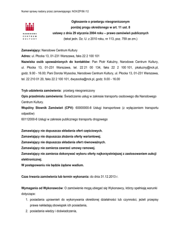Numer sprawy nadany przez zamawiającego: NCK/ZP/56 /12 Ogłoszenie o przetargu nieograniczonym poniżej progu określonego w art. 11 ust. 8 ustawy z dnia 29 stycznia 2004 roku – prawo zamówień publicznych (tekst jedn. Dz. U. z 2010 roku, nr 113, poz. 759 ze zm.) Zamawiający: Narodowe Centrum Kultury Adres: ul. Płocka 13, 01-231 Warszawa, faks 22 2 100 101 Nazwiska osób upoważnionych do kontaktów: Pan Piotr Kałużny, Narodowe Centrum Kultury, ul. Płocka 13, 01-231 Warszawa, tel. 22 21 00 134, faks 22 2 100 101, [email protected], godz. 9.00 - 16.00; Pani Dorota Wysocka, Narodowe Centrum Kultury, ul. Płocka 13, 01-231 Warszawa, tel. 22 210 01 20, faks 22 2 100 101, [email protected], godz. 9.00 - 16.00 Tryb udzielenia zamówienia: przetarg nieograniczony Opis przedmiotu zamówienia: Świadczenie usług w zakresie transportu osobowego dla Narodowego Centrum Kultury. Wspólny Słownik Zamówień (CPV): 60000000-8 Usługi transportowe (z wyłączeniem transportu odpadów) 60112000-6 Usługi w zakresie publicznego transportu drogowego Zamawiający nie dopuszcza składania ofert częściowych. Zamawiający nie dopuszcza złożenia oferty wariantowej. Zamawiający nie dopuszcza składania ofert równoważnych. Zamawiający nie zamierza zawrzeć umowy ramowej. Zamawiający nie zamierza dokonywać wyboru oferty najkorzystniejszej z zastosowaniem aukcji elektronicznej. W postępowaniu nie będzie żądane wadium. Czas trwania zamówienia lub termin wykonania: do dnia 31.12.2013 r. Wymagania od Wykonawców: O zamówienie mogą ubiegać się Wykonawcy, którzy spełniają warunki dotyczące: 1. posiadania uprawnień do wykonywania określonej działalności lub czynności, jeżeli przepisy prawa nakładają obowiązek ich posiadania, 2. posiadania wiedzy i doświadczenia, Numer sprawy nadany przez zamawiającego: NCK/ZP/56 /12 2.1 potwierdzonego należytym wykonaniem w trakcie ostatnich 3 lat przed dniem wszczęcia niniejszego postępowania, a jeżeli okres prowadzenia działalności jest krótszy – w tym okresie, co najmniej 3 usług polegających na świadczeniu usług transportowych na kwotę co najmniej 40 000,00 zł brutto rocznie. 3. dysponowania odpowiednim potencjałem technicznym oraz osobami zdolnymi do wykonania zamówienia, 4. sytuacji ekonomicznej i finansowej, 5. nie podlegania wykluczeniu z postępowania na podstawie art. 24 ust. 1 upzp. Opis sposobu dokonania oceny spełniania warunków udziału w postępowaniu Ocena spełniania warunków udziału w postępowaniu zostanie dokonana na podstawie dokumentów i informacji złożonych przez Wykonawcę oraz Oświadczenia stanowiącego załącznik nr 2 do Specyfikacji Istotnych Warunków Zamówienia. Ocena będzie dokonana metodą: spełnia – nie spełnia. Kryteria oceny ofert: Kryterium Znaczenie Cena brutto za 1 km świadczenia usługi transportowej Cena brutto za opłatę początkową Cena brutto za opłatę postojową Razem 75% 10% 15% 100% Termin składania ofert: do dnia 13.06.2012 r. do godziny 13.00 w Narodowym Centrum Kultury, ul. Płocka 13, 01–231 Warszawa, w recepcji. Termin związania z ofertą: 30 dni licząc od upływu terminu składania ofert. Określenie sposobu uzyskania specyfikacji istotnych warunków zamówienia oraz adres strony internetowej, na której została zamieszczona Specyfikacja Istotnych Warunków Zamówienia: Specyfikacja istotnych warunków zamówienia jest dostępna w siedzibie Zamawiającego w Narodowym Centrum Kultury Specyfikacja Istotnych Warunków Zamówienia została zamieszczona na stronie internetowej Zamawiającego www.nck.pl Data wywieszenia: 05.06.2012 r. Edward Chudzik Zastępca Dyrektora Narodowego Centrum Kultury