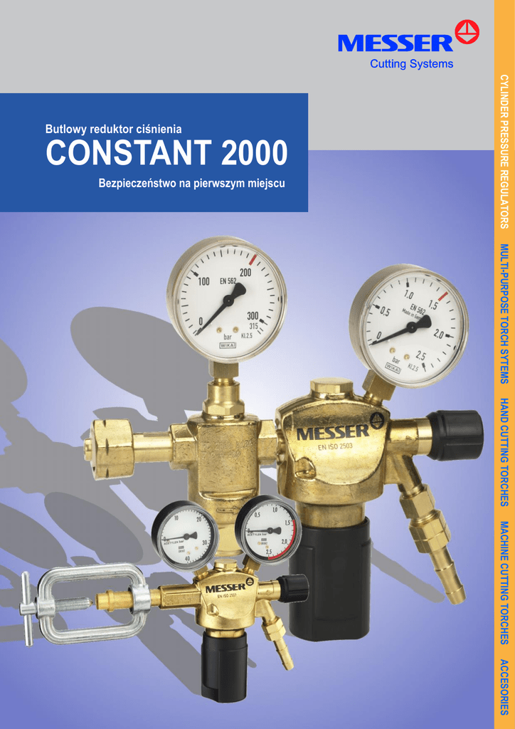 CONSTANT 2000 Bezpieczeństwo na pierwszym miejscu CYLINDER PRESSURE REGULATORS Butlowy reduktor ciśnienia MULTI-PURPOSE TORCH SYTEMS HAND CUTTING TORCHES MACHINE CUTTING TORCHES ACCESORIES Butlowy reduktor ciśnienia CONSTANT 2000 Bezpieczeństwo na pierwszym miejscu Wyjątkowa przejrzystość Możliwość łatwego odczytania wskazań manometru: cyfry rozmieszczone są w siatce pionowo-poziomej. Przedział zagrożenia jest wyróżniony czerwonym kolorem. Wysoki stopień bezpieczeństwa pracy dzięki filtrowi centralnemu Do zwiększenia bezpieczeństwa przyczynił się filtr umieszczony centralnie przed zaworem redukcyjnym. Umożliwia to optymalną ochronę wszystkich części ruchomych przed drobnymi zanieczyszczeniami powstałymi przy skrawaniu lub ścieraniu gwintów (zgłoszony patent). Łatwa obsługa. Nie przekręca się ani nie zakleszcza Zastosowanie trzpienia (porusza się on ruchem posuwistym, nie wykonując obrotu, przy minimalnym tarciu) wyklucza przekręcanie się lub zakleszczenie. Ponadto bezdławnicowy zawór odcinający ułatwia obsługę i minimalizuje koszty konserwacji. Podwójne zabezpieczenie ograniczające ciśnienie na wylocie 1. Poprzez zawór bezpieczeństwa, 2. Poprzez blokadę mechaniczną. Możliwość dokładnego ustawienia ciśnienia na wylocie. Mechaniczna blokada ogranicza osiągnięcie maksymalnego ciśnienia, uruchamiającego zawór bezpieczeństwa w przypadku nieprawidłowego ustawienia. Wysoki komfort obsługi Specjalny kształt pokręteł odpowiada najnowszym rozwiązaniom w zakresie ergonomii. STOSOWANY NIE TYLKO W TECHNIKACH SPAWANIA I CIĘCIA GAZOWEGO CONSTANT 2000 uniwersalny reduktor ciśnienia gazów technicznych w butlach Zastosowanie gazów technicznych wymaga - w zależności od rodzaju gazu oraz jego wykorzystania różnorodnych ciśnień i ilości. Wysokie ciśnienie gazu w butli należy zredukować do ciśnienia roboczego danego urządzenia, w którym gaz jest wykorzystywany. Niezbędna jest zatem wysoka dokładność regulacji przy różnych wielkościach przepływu gazu i ciśnienia na wlocie. Przyłącze na wlocie w zależności od rodzaju gazu przystosowane do zaworu gazu w butli wg DIN 477 oraz na wylocie wg DIN 8542 oraz wg EN 560 lub w przypadku ciśnienia na wylocie powyżej 50 bar ze złączką lutowaną w zależności od rodzaju gazu (patrz: tabela 2). W przypadku zamówień zagranicznych dostarczane są przyłącza odpowiadające normom obowiązującym w danym kraju. Butlowy reduktor ciśnienia CONSTANT 2000 może być stosowany do większości gazów technicznych, spełniając różnorodne wymagania: ciśnienie na wlocie Pv maks. 200 bar (maks. 300 bar - na życzenie), ciśnienie na wylocie Ph maks. 1,5 bar, 2,5 bar, 10 bar, 20 bar, 50 bar, 100 bar, 150 bar, 200 bar; przepływ przy wskaźniku manometrycznym 16 l/min., 32 l/min. oraz 50 l/min.; przy przepływomierzu 1 l/min., 5 l/ min., 16 l/min., 30 l/min. Oraz 50 l/min., wersja kompaktowa odlana z mosiądzu, elementy obsługi o ergonomicznym kształcie, wysoka dokładność regulacji również przy niskim ciśnieniu roboczym i niewielkich ilościach pobieranego gazu, niekłopotliwy w konserwacji dzięki prostej wymianie części szybko zużywających się, odpowiada normom DIN 8546, ISO 2503 oraz EN 585. Pomiary ciśnienia i przepływu. Ciśnienie mierzone jest przy użyciu manometrów do pomiaru ciśnienia w butli (ciśnienie na króćcu wlotowym) oraz ciśnienia roboczego (ciśnienia na wylocie). Butlowe reduktory ciśnienia do gazów osłonowych wyposażone są we wskaźnik manometryczny lub przepływomierz. Przejrzysta podziałka umożliwia łatwy odczyt wartości. Manometry odpowiadają normie EN 562. Estetyczny, funkcjonalny, nowoczesny. Materiały użyte do produkcji poszczególnych elementów poddane zostały uprzednio próbie przydatności i dobrane do siebie pod kątem estetyki. Liczne zalety dzięki niewielkiej ilości elementów konstrukcyjnych. Nowoczesny układ konstrukcji z niewielką ilością elementów niesie wiele praktycznych korzyści, jak przedłużony okres użytkowania przy znacznie obniżonych kosztach konserwacji oraz zwiększonej wygodzie. Przepływ Tlen 1) ciśnienie na wlocie Pv [bar] Tabela 1 Przepływ Q (m3/h)2) przy ciśnieniu na wylocie PH [bar] Acetylen ciśnienie na wlocie PH [bar] Przepływ Q (m3/h)2) przy ciśnieniu na wylocie PH [bar] 1 2,5 4 10 20 0,5 1 40 15 30 40 50 60 18 5 6 8 20 15 20 25 30 - 10 4,5 5,5 6,5 10 15 15 15 - - 4 3 4 5 5 10 10 10 - - 2 1,5 2 3 Przyłącze Rodzaj gazu 1,2 Tabela 2 Symbol chemiczny Kolor znakowania Przyłącze do butli Przyłącze węża skośnie w dół przy ciśnieniu roboczym do 50 bar G 3/8 LH G 1/4 G 1/4 G 1/4 G 3/8 LH G 1/4 G 3/8 LH3) Wylot prosty ze złączką lutowaną przy ciśnieniu roboczym powyżej 50 bar G 1/2 G 1/2 - acetylen amoniak powietrze sprężone freon tlenek węgla dwutlenek węgla, gazy szlachetne mieszanki gazów palnych C2H2 NH3 CO CO2, - żółty czarny czarny czarny czerwony czarny czerwony jarzmo W 21,80 x 1/14” G 5/8 gwint zewnętrzny W 21,80 x 1/14” G 1 LH W 21,80 x 1/14” W 21,80 x 1/14” LH gwint zewnętrzny propan gazy wzorcowe C3H8 - pomarańcz czerwony W 21,80 x 1/14” LH M 19 x 1,5 LH G 3/8 LH G 3/8 LH - tlen azot wodór, gaz formujący gaz miejski, metan O2 N2 H2, -, CH4 niebieski czarny G 3/4 W 24,32 x 1/14” G 1/4 G 1/4 G 1/2 G 1/2 G 3/8 LH G 1/2 czerwony 1) dla innych gazów przepływ należy przeliczyć przy użyciu współczynnika korygującego: W 21,80 x 1/14” argon powietrze sprężone dwutlenek węgla azot metan wodór 0,90 1,05 0,85 1,05 1,40 4,00 2) w stanie normalnym 3) reduktor ciśnienia posiada na wylocie przyłącze M14 x 1,5 LH. Może być używany z bezpiecznikiem dopuszczonym dla mieszanek gazów palnych, numer katalogowy 718.25320. BUTLOWY REDUKTOR CIŚNIENIA CONSTANT 2000 Oferta katalogowa i oznakowanie Oferta katalogowa Tabela 3 jednostopniowy ciśnienie na wylocie [bar4)] Rodzaj gazu do 1,5 do 10 do 20 do 50 do 100 do 150 do 200 powietrz