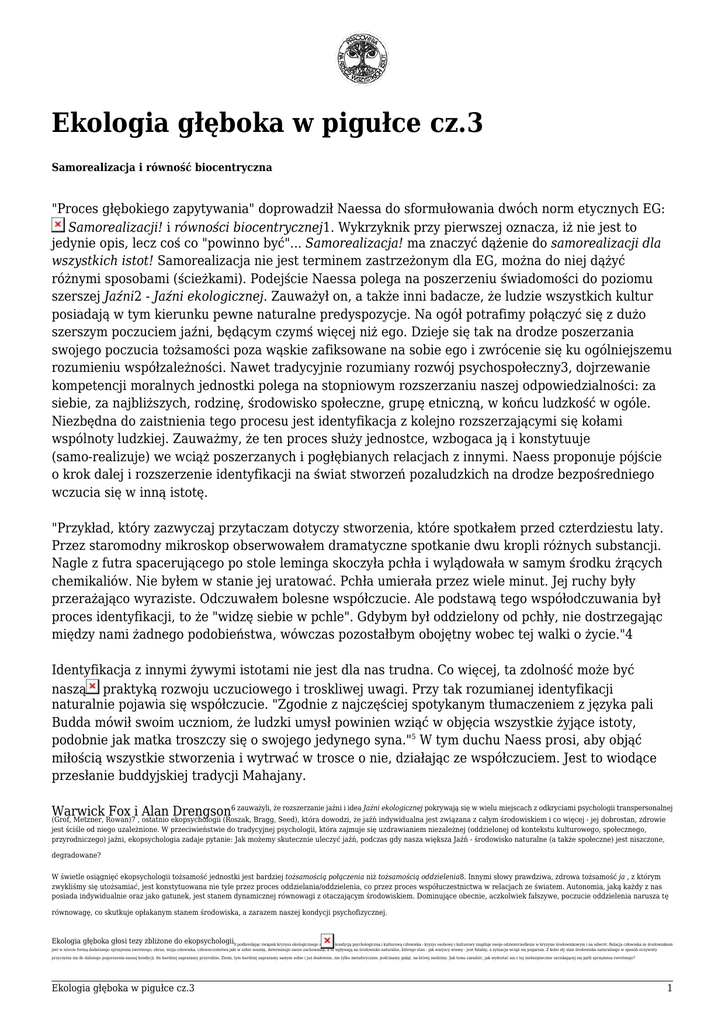 Ekologia głęboka w pigułce cz.3 Samorealizacja i równość biocentryczna "Proces głębokiego zapytywania" doprowadził Naessa do sformułowania dwóch norm etycznych EG: Samorealizacji! i równości biocentrycznej1. Wykrzyknik przy pierwszej oznacza, iż nie jest to jedynie opis, lecz coś co "powinno być"... Samorealizacja! ma znaczyć dążenie do samorealizacji dla wszystkich istot! Samorealizacja nie jest terminem zastrzeżonym dla EG, można do niej dążyć różnymi sposobami (ścieżkami). Podejście Naessa polega na poszerzeniu świadomości do poziomu szerszej Jaźni2 - Jaźni ekologicznej. Zauważył on, a także inni badacze, że ludzie wszystkich kultur posiadają w tym kierunku pewne naturalne predyspozycje. Na ogół potrafimy połączyć się z dużo szerszym poczuciem jaźni, będącym czymś więcej niż ego. Dzieje się tak na drodze poszerzania swojego poczucia tożsamości poza wąskie zafiksowane na sobie ego i zwrócenie się ku ogólniejszemu rozumieniu współzależności. Nawet tradycyjnie rozumiany rozwój psychospołeczny3, dojrzewanie kompetencji moralnych jednostki polega na stopniowym rozszerzaniu naszej odpowiedzialności: za siebie, za najbliższych, rodzinę, środowisko społeczne, grupę etniczną, w końcu ludzkość w ogóle. Niezbędna do zaistnienia tego procesu jest identyfikacja z kolejno rozszerzającymi się kołami wspólnoty ludzkiej. Zauważmy, że ten proces służy jednostce, wzbogaca ją i konstytuuje (samo-realizuje) we wciąż poszerzanych i pogłębianych relacjach z innymi. Naess proponuje pójście o krok dalej i rozszerzenie identyfikacji na świat stworzeń pozaludzkich na drodze bezpośredniego wczucia się w inną istotę. "Przykład, który zazwyczaj przytaczam dotyczy stworzenia, które spotkałem przed czterdziestu laty. Przez staromodny mikroskop obserwowałem dramatyczne spotkanie dwu kropli różnych substancji. Nagle z futra spacerującego po stole leminga skoczyła pchła i wylądowała w samym środku żrących chemikaliów. Nie byłem w stanie jej uratować. Pchła umierała przez wiele minut. Jej ruchy były przerażająco wyraziste. Odczuwałem bolesne współczucie. Ale podstawą tego współodczuwania był proces identyfikacji, to że "widzę siebie w pchle". Gdybym był oddzielony od pchły, nie dostrzegając między nami żadnego podobieństwa, wówczas pozostałbym obojętny wobec tej walki o życie."4 Identyfikacja z innymi żywymi istotami nie jest dla nas trudna. Co więcej, ta zdolność może być naszą praktyką rozwoju uczuciowego i troskliwej uwagi. Przy tak rozumianej identyfikacji naturalnie pojawia się współczucie. "Zgodnie z najczęściej spotykanym tłumaczeniem z języka pali Budda mówił swoim uczniom, że ludzki umysł powinien wziąć w objęcia wszystkie żyjące istoty, podobnie jak matka troszczy się o swojego jedynego syna."5 W tym duchu Naess prosi, aby objąć miłością wszystkie stworzenia i wytrwać w trosce o nie, działając ze współczuciem. Jest to wiodące przesłanie buddyjskiej tradycji Mahajany. Warwick Fox i Alan Drengson6 zauważyli, że rozszerzanie jaźni i idea Jaźni ekologicznej pokrywają się w wielu miejscach z odkryciami psychologii transpersonalnej (Grof, Metzner, Rowan)7 , ostatnio ekopsychologii (Roszak, Bragg, Seed), która dowodzi, że jaźń indywidualna jest związana z całym środowiskiem i co więcej - jej dobrostan, zdrowie jest ściśle od niego uzależnione. W przeciwieństwie do tradycyjnej psychologii, która zajmuje się uzdrawianiem niezależnej (oddzielonej od kontekstu kulturowego, społecznego, przyrodniczego) jaźni, ekopsychologia zadaje pytanie: Jak możemy skutecznie uleczyć jaźń, podczas gdy nasza większa Jaźń - środowisko naturalne (a także społeczne) jest niszczone, degradowane? W świetle osiągnięć ekopsychologii tożsamość jednostki jest bardziej tożsamością połączenia niż tożsamością oddzielenia8. Innymi słowy prawdziwa, zdrowa tożsamość ja , z którym zwykliśmy się utożsamiać, jest konstytuowana nie tyle przez proces oddzielania/oddzielenia, co przez proces współuczestnictwa w relacjach ze światem. Autonomia, jaką każdy z nas posiada indywidualnie oraz jako gatunek, jest stanem dynamicznej równowagi z otaczającym środowiskiem. Dominujące obecnie, aczkolwiek fałszywe, poczucie oddzielenia narusza tę równowagę, co skutkuje opłakanym stanem środowiska, a zarazem naszej kondycji psychofizycznej. Ekologia głęboka głosi tezy zbliżone do ekopsychologii9 podkreślając związek kryzysu ekologicznego z kondycją psychologiczną i kulturową człowieka - kryzys osobowy i kulturowy znajduje swoje odzwierciedlenie w kryzysie środowiskowym i na odwrót. Relacja człowieka ze środowiskiem jest w istocie formą dodatniego sprzężenia zwrotnego; obraz, wizja człowieka, człowieczeństwa jaki w sobie nosimy, determinuje nasze zachowania, a te wpływają na środowisko naturalne, którego stan - jak wszyscy wiemy - jest fatalny, a sytuacja wciąż się pogarsza. Z kolei zły stan środowiska naturalnego w sposób oczywisty przyczynia się do dalszego pogorszenia naszej kondycji. Im bardziej zagrażamy przyrodzie, Ziemi, tym bardziej zagrażamy samym sobie i już dosłownie, nie tylko metaforycznie, podcinamy gałąź, na której siedzimy. Jak temu zaradzić, jak wydostać się z tej niebezpiecznie zaciskającej się pętli sprzężenia zwrotnego? Ekologia głęboka w pigułce cz.3 1 , której upowszechnienie dawałoby nadzieję na pozytywne zmiany w świecie. Postulowana przez EG wizja człowieka ekologicznego ma przezwyciężyć fałszywą tożsamość oddzielenia i przywrócić naturalną, zdrową tożsamość połączenia, która właściwa jest naessowskiej Jaźni ekologicznej. Jest to zarazem człowiek dojrzały, który przekroczył "zahamowanie ontogenetyczne"11, na które skazuje nieomal wszystkich wychowanie w technokratyczno-przemysłowej kulturze konsumpcyjnej12. Głównym objawe