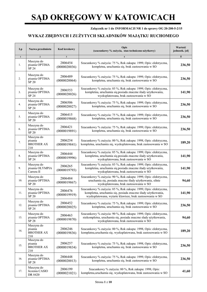 SĄD OKRĘGOWY W KATOWICACH Załącznik nr 1 do INFORMACJI NR 1 do sprawy OG 20-200-5-2/15 WYKAZ ZBĘDNYCH I ZUŻYTYCH SKŁADNIKÓW MAJĄTKU RUCHOMEGO Lp 1 Nazwa przedmiotu Kod kreskowy Opis (szacunkowy % zużycia, stan techniczno-użytkowy) Wartość jednostk. [zł] 2 5 3 4 1. Maszyna do pisania OPTIMA SP 24 2806454 (0000020036) Szacunkowy % zużycia: 75 %, Rok zakupu: 1999, Opis: elektryczna, kompletna, uruchamia się, brak zastosowania w SO 236,50 2. Maszyna do pisania OPTIMA SP 20 2806489 (0000020064) Szacunkowy % zużycia: 75 %, Rok zakupu: 1999, Opis: elektryczna, kompletna, uruchamia się, brak zastosowania w SO 236,50 3. Maszyna do pisania OPTIMA SP 24 2806553 (0000020026) Szacunkowy % zużycia: 85 %, Rok zakupu: 1999, Opis: elektryczna, kompletna, uruchamia się,posiada znaczne ślady użytkowania, wyeksplatowana, brak zastosowania w SO 141,90 4. Maszyna do pisania OPTIMA SP 24 2806506 (0000020027) Szacunkowy % zużycia: 75 %, Rok zakupu: 1999, Opis: elektryczna, kompletna, uruchamia się, brak zastosowania w SO 236,50 5. Maszyna do pisania OPTIMA SP 20 2806415 (0000019868) Szacunkowy % zużycia: 75 %, Rok zakupu: 1999, Opis: elektryczna, kompletna, uruchamia się, brak zastosowania w SO 236,50 Maszyna do pisania OPTIMA SP 20 Maszyna do pisania BROTHER AX 210 Maszyna do pisania OPTIMA SP 24 2806421 (0000019891) Szacunkowy % zużycia: 75 %, Rok zakupu: 1999, Opis: elektryczna, kompletna, uruchamia się, brak zastosowania w SO 236,50 2806254 (0000019841) Szacunkowy % zużycia: 80 %, Rok zakupu: 1998, Opis: elektryczna, kompletna, uruchamia się, wyeksplatowana, brak zastosowania w SO 189,20 2806444 (0000019996) Szacunkowy % zużycia: 85 %, Rok zakupu: 1999, Opis: elektryczna, kompletna, uruchamia się,posiada znaczne ślady użytkowania, wyeksplatowana, brak zastosowania w SO 141,90 9. Maszyna do pisania OLYMPIA Carrera II 2806265 (0000019793) Szacunkowy % zużycia: 85 %, Rok zakupu: 1999, Opis: elektryczna, kompletna, uruchamia się,posiada znaczne ślady użytkowania, wyeksplatowana, brak zastosowania w SO 141,90 10. Maszyna do pisania OPTIMA SP 20 2806484 (0000019867) Szacunkowy % zużycia: 90 %, Rok zakupu: 1999, Opis: elektryczna, uruchamia się, posiada znaczne ślady użytkowania, silnie wyeksplatowana, brak zastosowania w SO 94,60 11. Maszyna do pisania OPTIMA SP 20 2806476 (0000019919) Szacunkowy % zużycia: 85 %, Rok zakupu: 1999, Opis: elektryczna, kompletna, uruchamia się, posiada znaczne ślady użytkowania, wyeksplatowana, wytarte klawisze, brak zastosowania w SO 141,90 12. Maszyna do pisania OPTIMA SP 24 2806452 (0000020025) Szacunkowy % zużycia: 75 %, Rok zakupu: 1999, Opis: elektryczna, kompletna, uruchamia się, brak zastosowania w SO 236,50 Maszyna do pisania OPTIMA SP 28 Maszyna do pisania BROTHER AX 210 Maszyna do pisania BROTHER AX 210 Maszyna do pisania OPTIMA SP 28 2806463 (0000019870) Szacunkowy % zużycia: 90 %, Rok zakupu: 1999, Opis: elektryczna, niekompletna, uruchamia się, posiada znaczne slady użytkowania, wyeksplatowana, brak zastosowania w SO 94,60 2806246 (0000019836) Szacunkowy % zużycia: 80 %, Rok zakupu: 1998, Opis: elektryczna, komplatna,uruchamia się, wyeksplatowana, brak zastosowania w SO 189,20 2806257 (0000019834) Szacunkowy % zużycia: 75 %, Rok zakupu: 1998, Opis: elektryczna, kompletna, uruchamia się, brak zastosowania w SO 236,50 2806448 (0000020013) Szacunkowy % zużycia: 75 %, Rok zakupu: 1999, Opis: elektryczna, kompletna, uruchamia się, brak zastosowania w SO 236,50 Maszyna do liczenia CASIO DR 8420 2806199 (0000021021) Szacunkowy % zużycia: 80 %, Rok zakupu: 1998, Opis: kompletna,uruchamia się, wyeksplatowana, brak zastosowania w SO 41,60 6. 7. 8. 13. 14. 15. 16. 17. Strona 1 z 10 Załącznik nr 1 do INFORMACJI NR 1 do sprawy OG 20-200-5-2/15 Lp Nazwa przedmiotu Nr inwentarzowy (Kod kreskowy) 1 2 3 4 Maszyna do liczenia CASIO FR 5200 Maszyna do pisania BROTHER Electronic 3512 Maszyna do liczenia CASIO DR 8620 2806234 (0000021019) Szacunkowy % zużycia: 80 %, Rok zakupu: 1995, Opis: kompletna,uruchamia się, wyeksplatowana, brak zastosowania w SO 41,60 2806238 (0000019831) Szacunkowy % zużycia: 50 %, Rok zakupu: 1995, Opis: elektryczna, kompletna ( w walizce), uruchamia się, w dobrym stanie, brak zastosowania w SO 473,00 2806237 (0000021002) Szacunkowy % zużycia: 95 %, Rok zakupu: 1998, Opis: niekompletna, nie uruchamia się, uszkodzona 10,40 21. Maszyna do liczenia CASIO DR 8620 2806228 (0000020997) Szacunkowy % zużycia: 80 %, Rok zakupu: 1998, Opis: kopletna, uruchamia się, syeksplatowana, brak zastosowania w SO 41,60 22. Maszyna do pisania ŁUCZNIK 2806360 (0000019763) Szacunkowy % zużycia: 85 %, Rok zakupu: 1998, Opis: nieelektryczna, uruchamia się,wyeksplatowana, brak zastosowania w SO 97,35 23. Maszyna do pisania ŁUCZNIK 2806324 (0000019753) Szacunkowy % zużycia: 90 %, Rok zakupu: 1998, Opis: nieelektryczna, wyeksplatowana, nie działające klawisze, posiada znaczne ślady użytkowania 64,90 24. Maszyna do pisania ŁUCZNIK 2806309 (0000019762) Szacunkowy % zużycia: 85 %, Rok zakupu: 1998, Opis: nieelektryczna,wyeksplatowana, posiada znaczne ślady użytkowania, brak zastosowania w SO 97,35 25. Maszyna do pisania OPTIMA SP 20 2806392 (0000020048) Szacunkowy % zużycia: 75 %, Rok zakupu: 1999, Opis: elektryczna, kompletna, uruchamia się, brak zastosowania w SO 236,50 26. Maszyna do pisania OPTIMA SP 24 2806554 (0000020029) Szacunkowy % zużycia: 75 %, Rok zakupu: 1999, Opis: elektryczna, kompletna, uruchamia się, brak zastosowania w SO 236,50 27. Maszyna do pisania OPTIMA SP 20 2806396 (0000020060) Szacunkowy % zużycia: 75 %, Rok zakupu: 1999, Opis: elektryczna, kompletna, uruchamia się, brak zastosowania w SO 236,50 28. Maszyna do pisania OPTIMA SP 24 2806455 (0000020039) Szacunkowy % zużycia: 80 %, Rok zakupu: 1999, Opis: ekeptryczna, kompetna, uruchamia się, wyeksplatowana, brak zastosowania w SO 189,20 29. Maszyna do pisania OPTIMA SP 20 2806432 (0000019934) Szacunkowy % zużycia: 85 %, Rok zakupu: