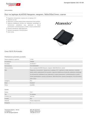 Starogard Gdański 2017-03-08 Karta produktu: Etui na laptopa ALASSIO Neopren, neopren, 360x330x15mm, czarne Eleganckie, funkcjonalne i stylowe etui na laptopa 15,4" Zapinane na rzep Wykonane z wysokiej jakości pianki neoprenowej 3mm grubości Zapewnia dodatkową ochronę dla notebooka narażonego na mechaniczne uszkodzenia (rysy, pęknięcia) w trakcie przenoszenia i przechowywania w torbie z innymi przedmiotami Wymiary zewnętrzne: 360x330x15mm Wymiary wewnętrzne: 355x325x10mm Kolor czarny Cena 58,93 PLN brutto Podstawowe parametry produktu Numer produktu w systemie 17339 Nr dostawcy A46006 Nr Celcen 21-01103-7 Kod kreskowy 4021068460069 Nazwa produktu Etui na laptopa ALASSIO Neopren, neopren, 360x330x15mm, czarne Opis Eleganckie, funkcjonalne i stylowe etui na laptopa 15,4"; zapinane na rzep; wykonane z wysokiej jakości pianki neoprenowej 3mm grubości; zapewnia dodatkową ochronę dla notebooka narażonego na mechaniczne uszkodzenia (rysy, pęknięcia) w trakcie przenoszenia i przechowywania w torbie z innymi przedmiotami; wymiary zewnętrzne: 360x330x15mm; wymiary wewnętrzne: 355x325x10mm; kolor czarny Kategoria Etui Klasa Standard Marka ALASSIO Cecha Rodzaj 15,4" Typ Na laptopa W ofercie od 2013-01 Produkt Etui Materiał Pianka neoprenowa Przegrody 1 Hurtowania Papieru - Borma ul. Sambora 3 83-200 Starogard Gdański NIP: 592 10 36 627 REGON: 190916154 +48 (58) 56 221 37 Starogard Gdański 2017-03-08 Karta katalogowa produktu cd. Etui na laptopa ALASSIO Neopren, neopren, 360x330x15mm, czarne Wymiary Wymiary (mm) 360x330x15 Wspólny słownik zamówień CPV 30237270-2 Torby na komputery przenośne Certyfikaty Nowy produkt w ofercie Standard Hit Standard Kolor Kolor Czarny Serdecznie zapraszamy do współpracy Hurtowania Papieru - Borma zespół. Hurtowania Papieru - Borma ul. Sambora 3 83-200 Starogard Gdański NIP: 592 10 36 627 REGON: 190916154 +48 (58) 56 221 37