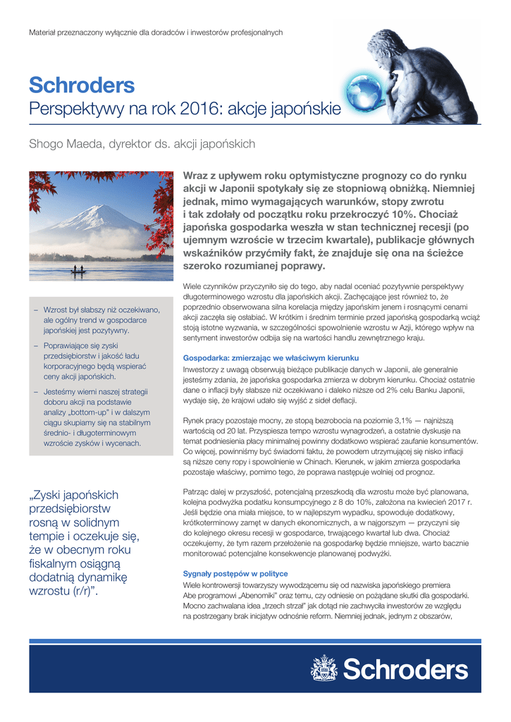 Materiał przeznaczony wyłącznie dla doradców i inwestorów profesjonalnych Schroders Perspektywy na rok 2016: akcje japońskie Shogo Maeda, dyrektor ds. akcji japońskich Wraz z upływem roku optymistyczne prognozy co do rynku akcji w Japonii spotykały się ze stopniową obniżką. Niemniej jednak, mimo wymagających warunków, stopy zwrotu i tak zdołały od początku roku przekroczyć 10%. Chociaż japońska gospodarka weszła w stan technicznej recesji (po ujemnym wzroście w trzecim kwartale), publikacje głównych wskaźników przyćmiły fakt, że znajduje się ona na ścieżce szeroko rozumianej poprawy. –– Wzrost był słabszy niż oczekiwano, ale ogólny trend w gospodarce japońskiej jest pozytywny. –– Poprawiające się zyski przedsiębiorstw i jakość ładu korporacyjnego będą wspierać ceny akcji japońskich. –– Jesteśmy wierni naszej strategii doboru akcji na podstawie analizy „bottom-up” i w dalszym ciągu skupiamy się na stabilnym średnio- i długoterminowym wzroście zysków i wycenach. „Zyski japońskich przedsiębiorstw rosną w solidnym tempie i oczekuje się, że w obecnym roku fiskalnym osiągną dodatnią dynamikę wzrostu (r/r)”. Wiele czynników przyczyniło się do tego, aby nadal oceniać pozytywnie perspektywy długoterminowego wzrostu dla japońskich akcji. Zachęcające jest również to, że poprzednio obserwowana silna korelacja między japońskim jenem i rosnącymi cenami akcji zaczęła się osłabiać. W krótkim i średnim terminie przed japońską gospodarką wciąż stoją istotne wyzwania, w szczególności spowolnienie wzrostu w Azji, którego wpływ na sentyment inwestorów odbija się na wartości handlu zewnętrznego kraju. Gospodarka: zmierzając we właściwym kierunku Inwestorzy z uwagą obserwują bieżące publikacje danych w Japonii, ale generalnie jesteśmy zdania, że japońska gospodarka zmierza w dobrym kierunku. Chociaż ostatnie dane o inflacji były słabsze niż oczekiwano i daleko niższe od 2% celu Banku Japonii, wydaje się, że krajowi udało się wyjść z sideł deflacji. Rynek pracy pozostaje mocny, ze stopą bezrobocia na poziomie 3,1% — najniższą wartością od 20 lat. Przyspiesza tempo wzrostu wynagrodzeń, a ostatnie dyskusje na temat podniesienia płacy minimalnej powinny dodatkowo wspierać zaufanie konsumentów. Co więcej, powinniśmy być świadomi faktu, że powodem utrzymującej się nisko inflacji są niższe ceny ropy i spowolnienie w Chinach. Kierunek, w jakim zmierza gospodarka pozostaje właściwy, pomimo tego, że poprawa następuje wolniej od prognoz. Patrząc dalej w przyszłość, potencjalną przeszkodą dla wzrostu może być planowana, kolejna podwyżka podatku konsumpcyjnego z 8 do 10%, założona na kwiecień 2017 r. Jeśli będzie ona miała miejsce, to w najlepszym wypadku, spowoduje dodatkowy, krótkoterminowy zamęt w danych ekonomicznych, a w najgorszym — przyczyni się do kolejnego okresu recesji w gospodarce, trwającego kwartał lub dwa. Chociaż oczekujemy, że tym razem przełożenie na gospodarkę będzie mniejsze, warto bacznie monitorować potencjalne konsekwencje planowanej podwyżki. Sygnały postępów w polityce Wiele kontrowersji towarzyszy wywodzącemu się od nazwiska japońskiego premiera Abe programowi „Abenomiki” oraz temu, czy odniesie on pożądane skutki dla gospodarki. Mocno zachwalana idea „trzech strzał” jak dotąd nie zachwyciła inwestorów ze względu na postrzegany brak inicjatyw odnośnie reform. Niemniej jednak, jednym z obszarów, Perspektywy na rok 2016: akcje japońskie w którym premierowi Abe należy się niekwestionowane uznanie, jest przeforsowanie umowy handlowej o Partnerstwie Transpacyficznym, która objęła 12 krajów rejonu Pacyfiku, w tym Japonię i USA. Obejmująca ok. 40% światowego PKB umowa może przynieść ogromne korzyści, które rynki muszą jeszcze w pełni przeanalizować. Podchodzimy realistycznie do ostatecznego terminu ratyfikacji kompromisu, mając w szczególności na względzie problematyczną sytuację w USA. Premier Abe dokonał też znacznego postępu jeśli chodzi o obniżenie opodatkowania przedsiębiorstw, którego stawka prawdopodobnie zostanie skorygowana ponownie w dół w przyszłym roku, do wartości poniżej 30% (z obecnych 32%). Dla Banku Japonii niższa niż oczekiwano inflacja zawęża opcje, jakie może zastosować w realizowaniu swojej polityki. Pomimo optymizmu prezesa Kurody (przynajmniej w oficjalnym wydaniu), jest jasne, że cel inflacyjny Banku Japonii (2%) jest właściwie nieosiągalny. W rezultacie pojawiają się spekulacje na temat dalszego łagodzenia polityki przez bank centralny, a wiarygodność instytucji pozostaje w centrum uwagi. Shogo Maeda, dyrektor ds. akcji japońskich Shogo Maeda jest dyrektorem ds. akcji japońskich w oddziale w Tokio. Pracuje w firmie Schroders od stycznia 2006 r. Wcześniej pracował w spółce Goldman Sachs Asset Management, gdzie pełnił funkcję dyrektora ds. akcji japońskich, a później został dyrektorem generalnym i kierownikiem ds. inwestycji funduszu akcji regionu Pacyfiku. Shogo Maeda jest dyplomowanym analitykiem finansowym (tytuł CFA) i ma tytuł magistra stosunków międzynarodowych (School of International Affairs, Columbia University). Posiada też licencjat z ekonomii (Wesleyan University). Poprawiające się zyski spółek i jakość zarządzania W ujęciu krajowym, japońskie spółki odnotowują solidny wzrost przychodów. Pomimo słabego, globalnego obrazu, oczekuje się, że zyski osiągną dodatnią dynamikę wzrostu w obecnym roku fiskalnym (w ujęciu r/r). Chociaż prognozy musiały zostać nieco zredukowane, wzrost był dobrze zrównoważony, a zależność od stanu światowej gospodarki obniżyła się. W aspekcie ładu korporacyjnego, większy nacisk wywierany przez akcjonariuszy na zarządy spółek zaczyna procentować. Wprowadzenie na początku tego roku Zasad Ładu Korporacyjnego jest bez wątpieni